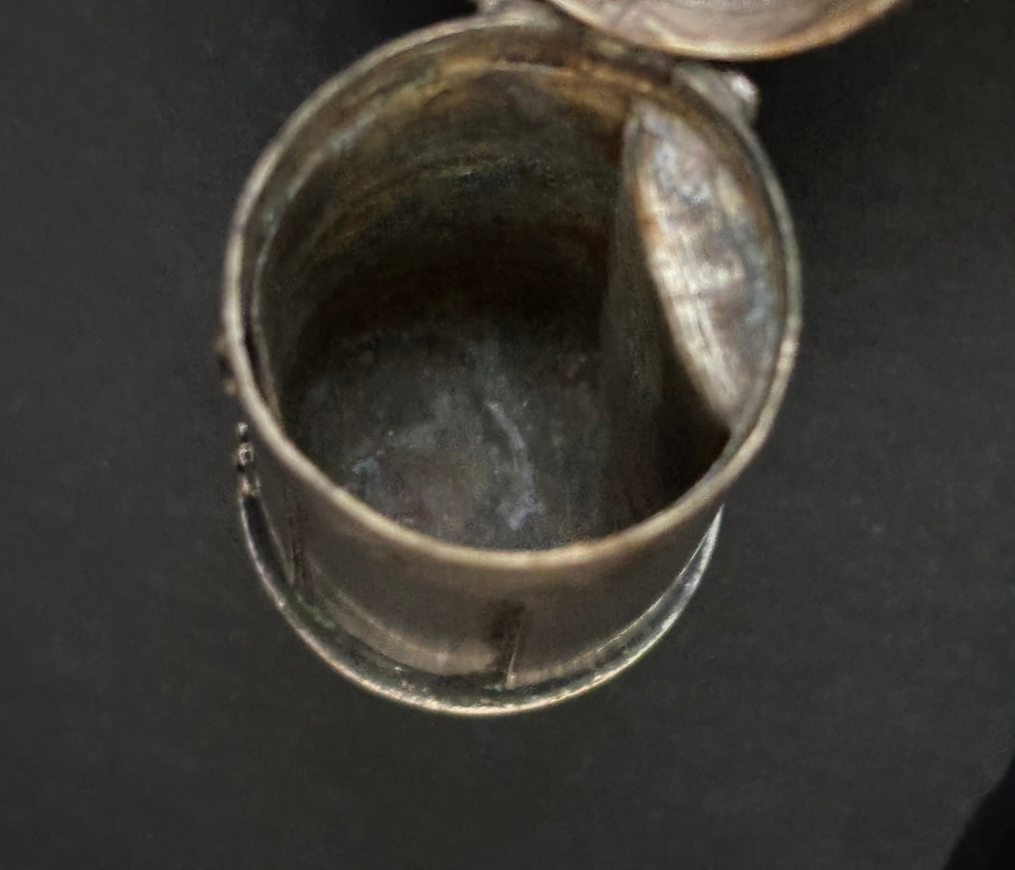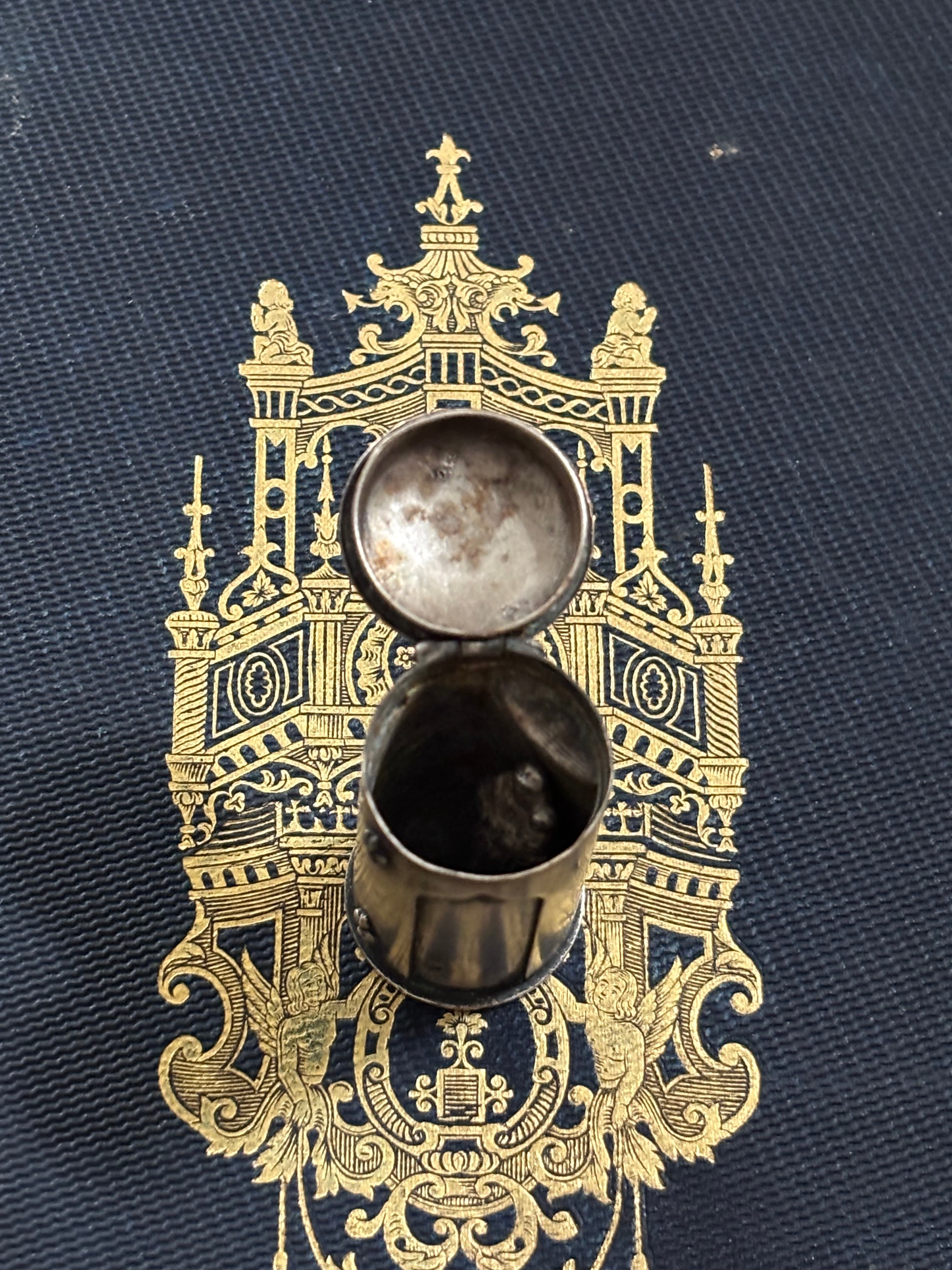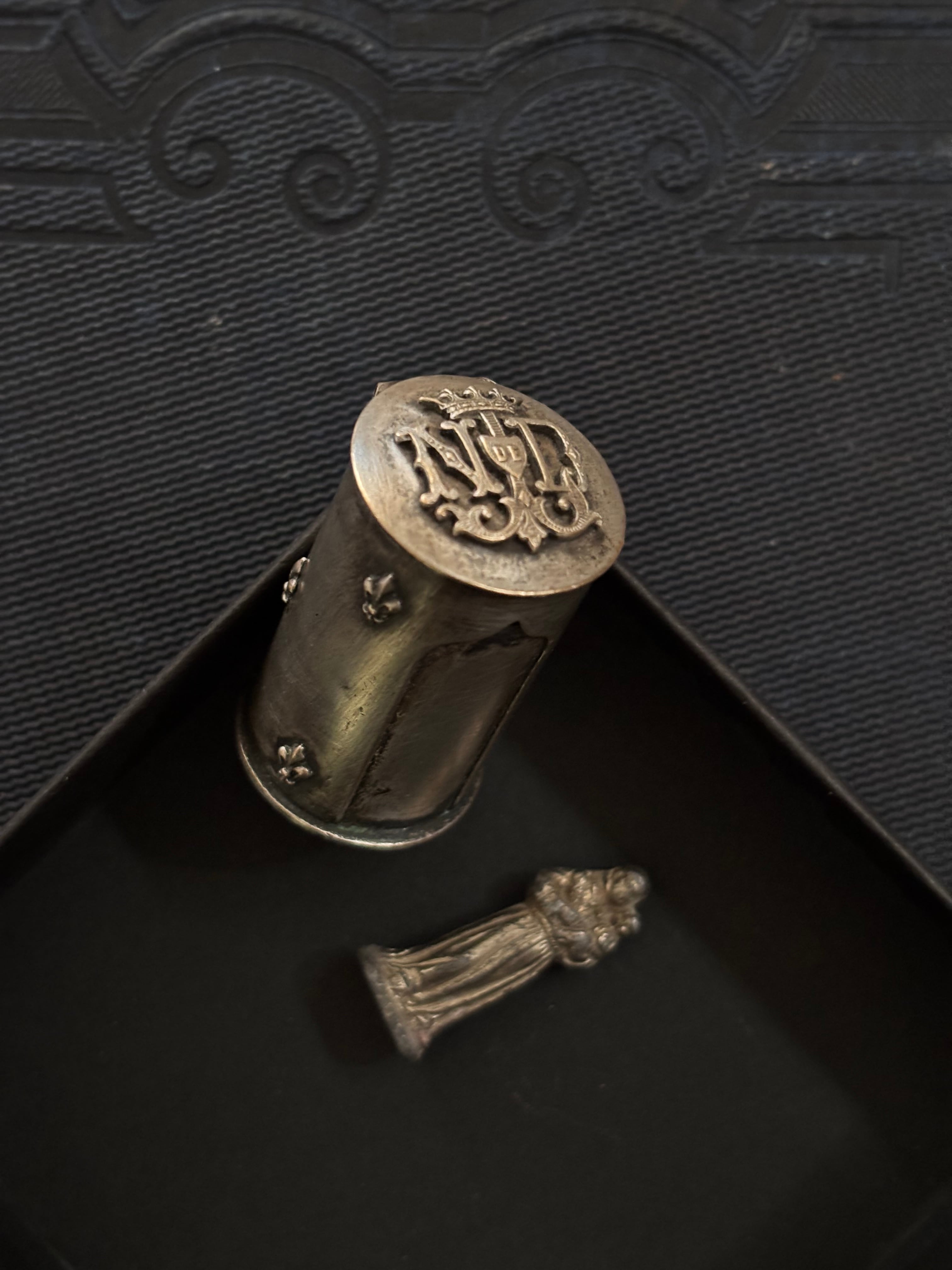 親指サイズのリップスティックのようなケースは、蓋のNDのモノグラムと本体のフルール・ド・リスのレリーフが素敵です。蓋はカチッと音がしてしっかりと閉まります。一部百合の紋章2つが外れたようですが違和感はないと思います(画像6枚目)