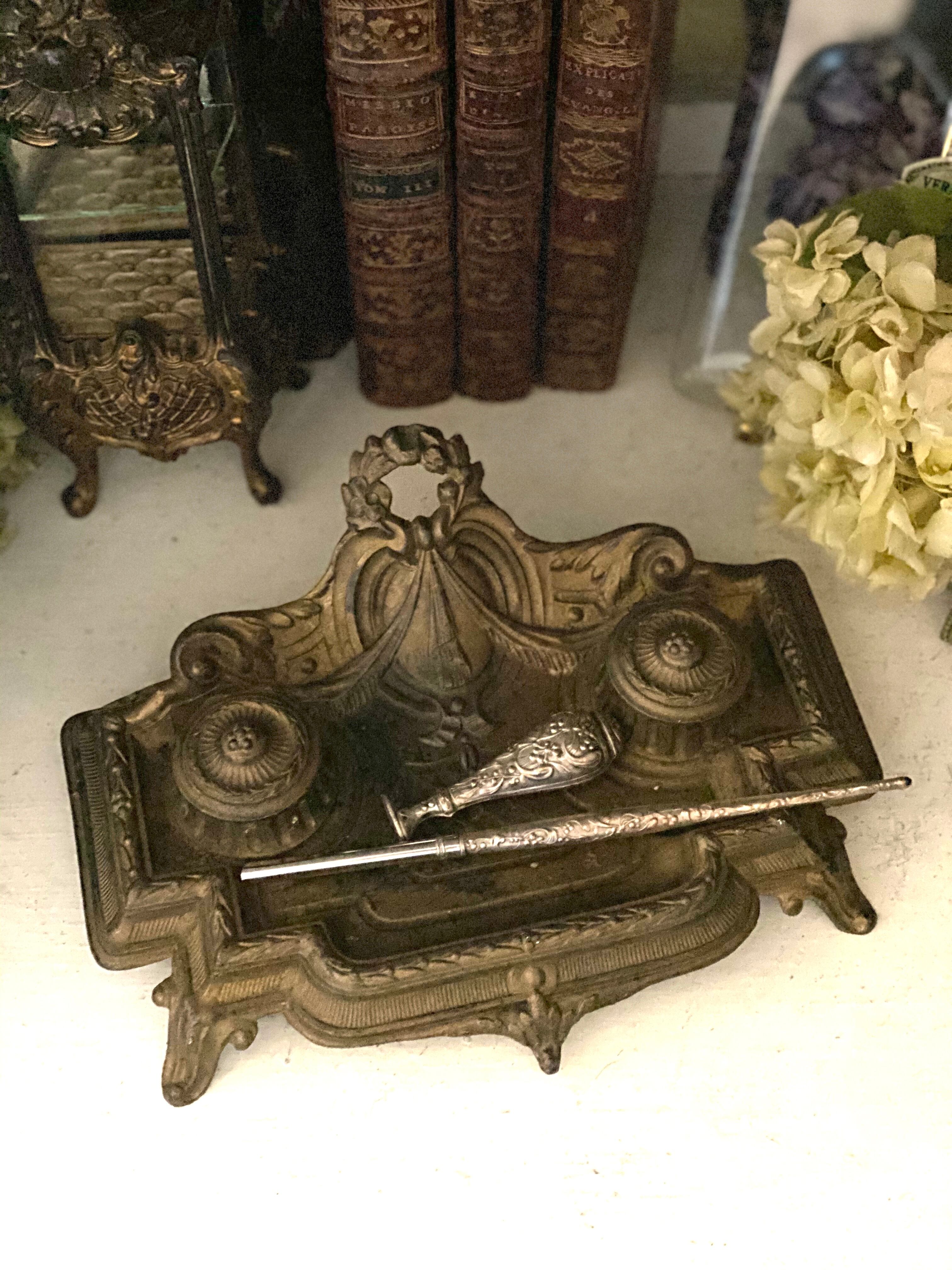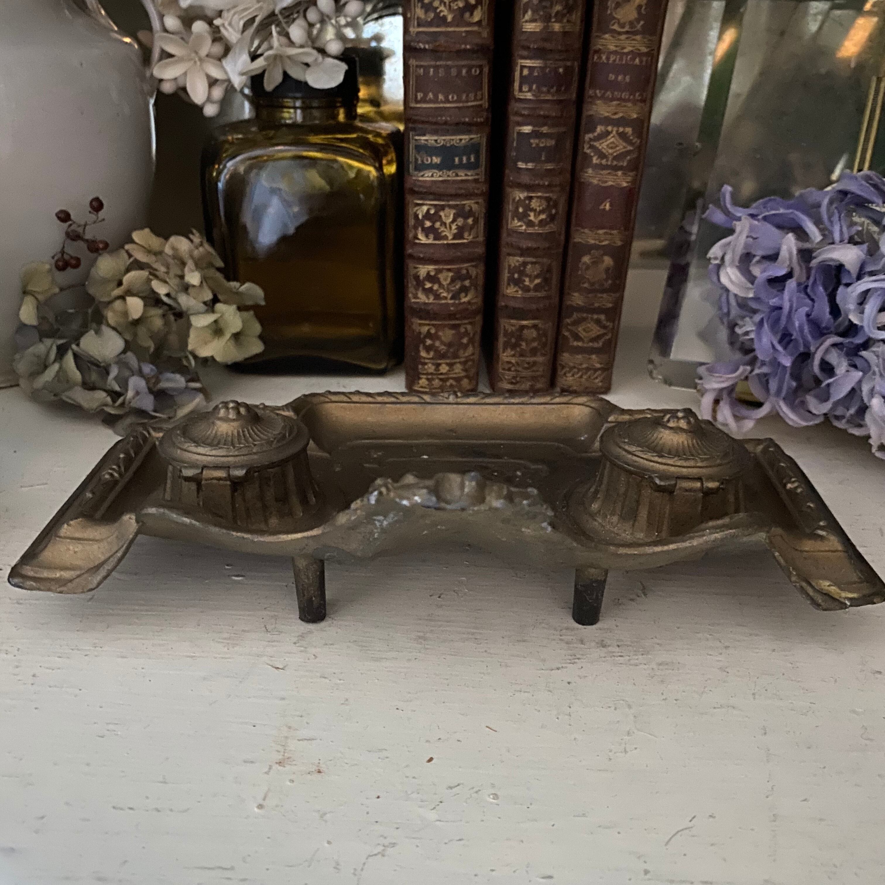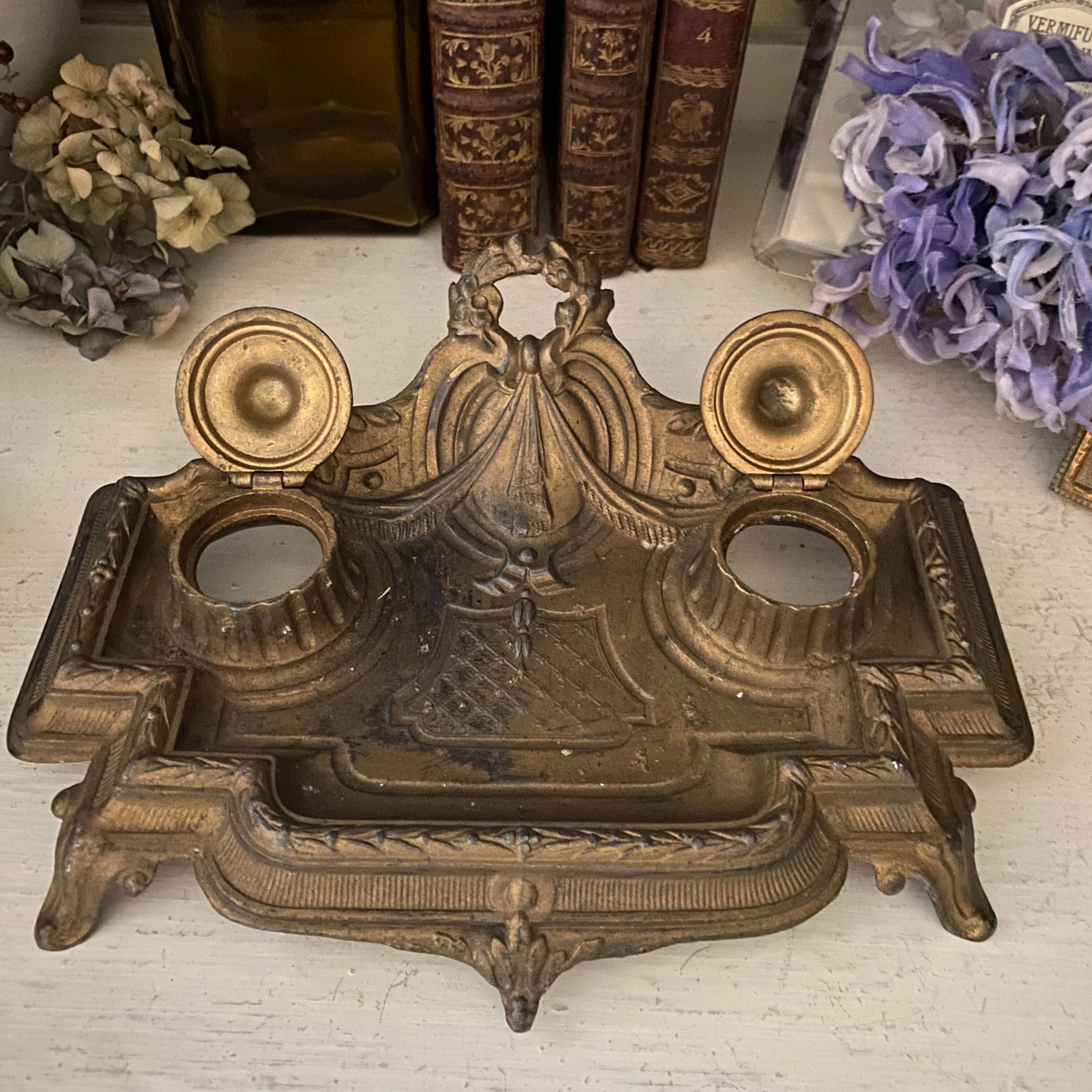 本来は文房具ですが、トレイの意匠も素敵なのでオブジェとしてただあるだけでも絵になります。インク瓶はありません。