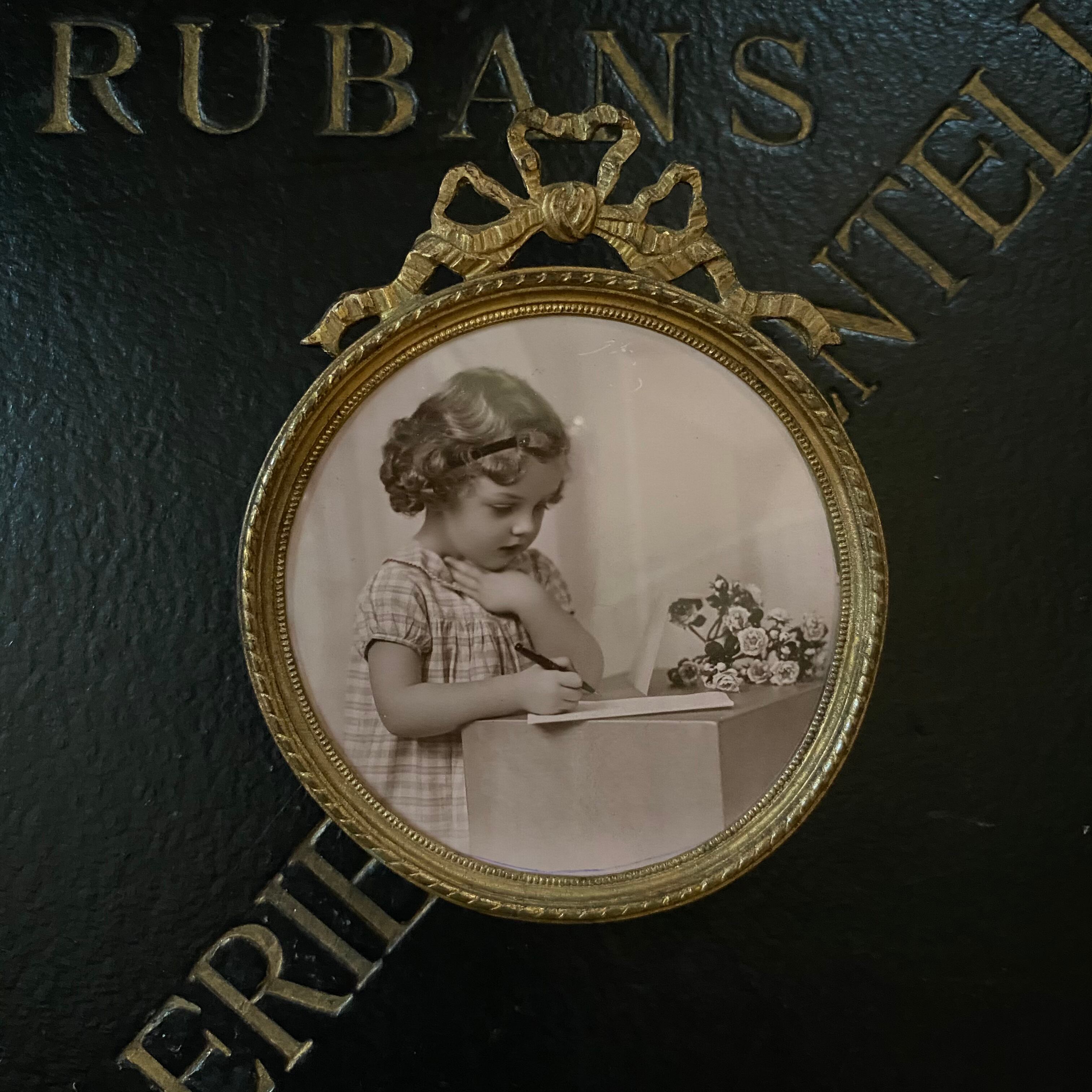 ガラスではなく薄いアクリル系ボードと可愛い少女のポストカード(写真)などが入っていました。