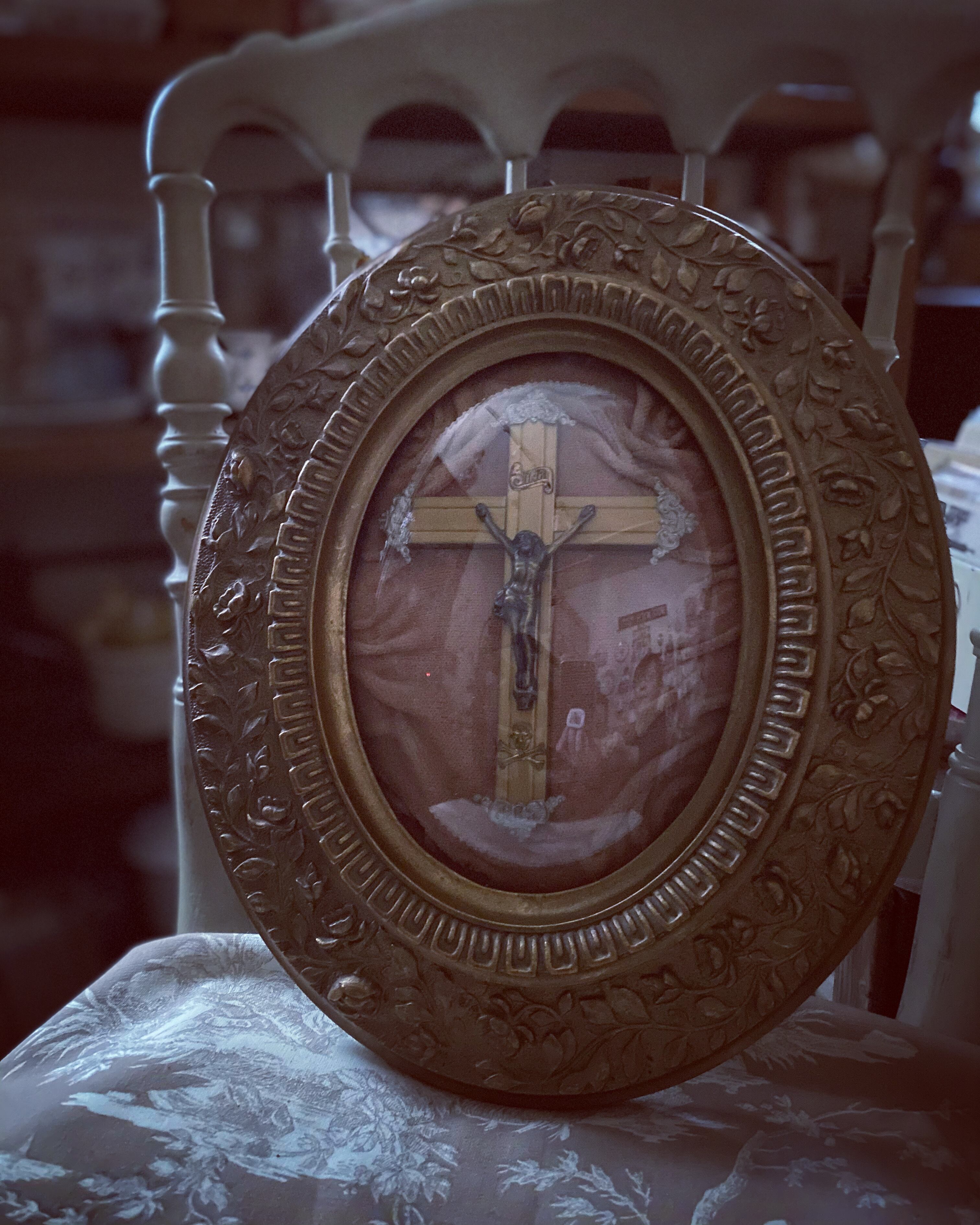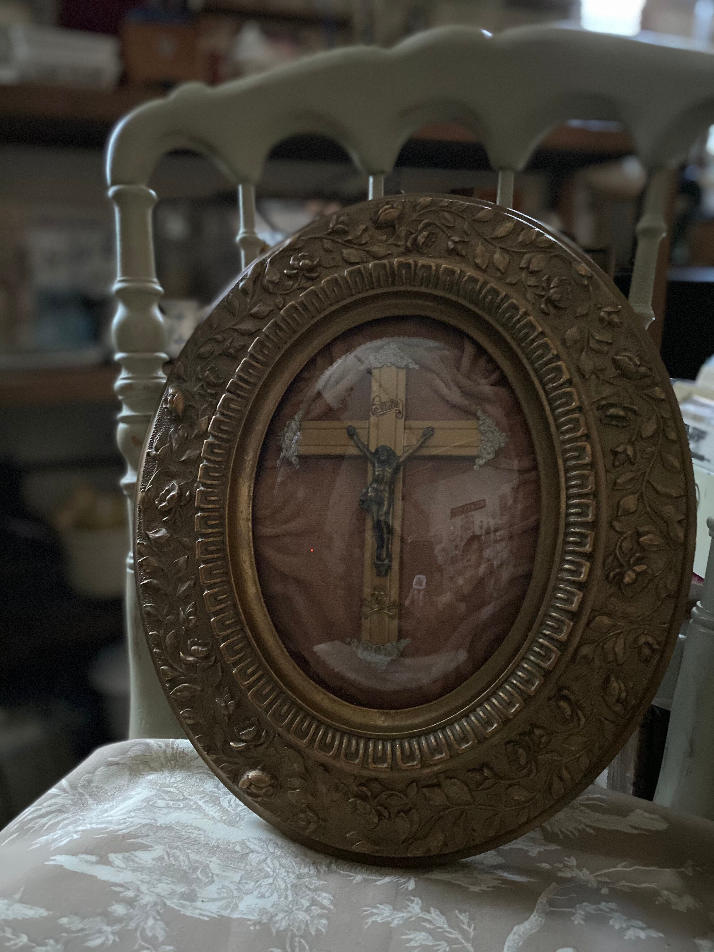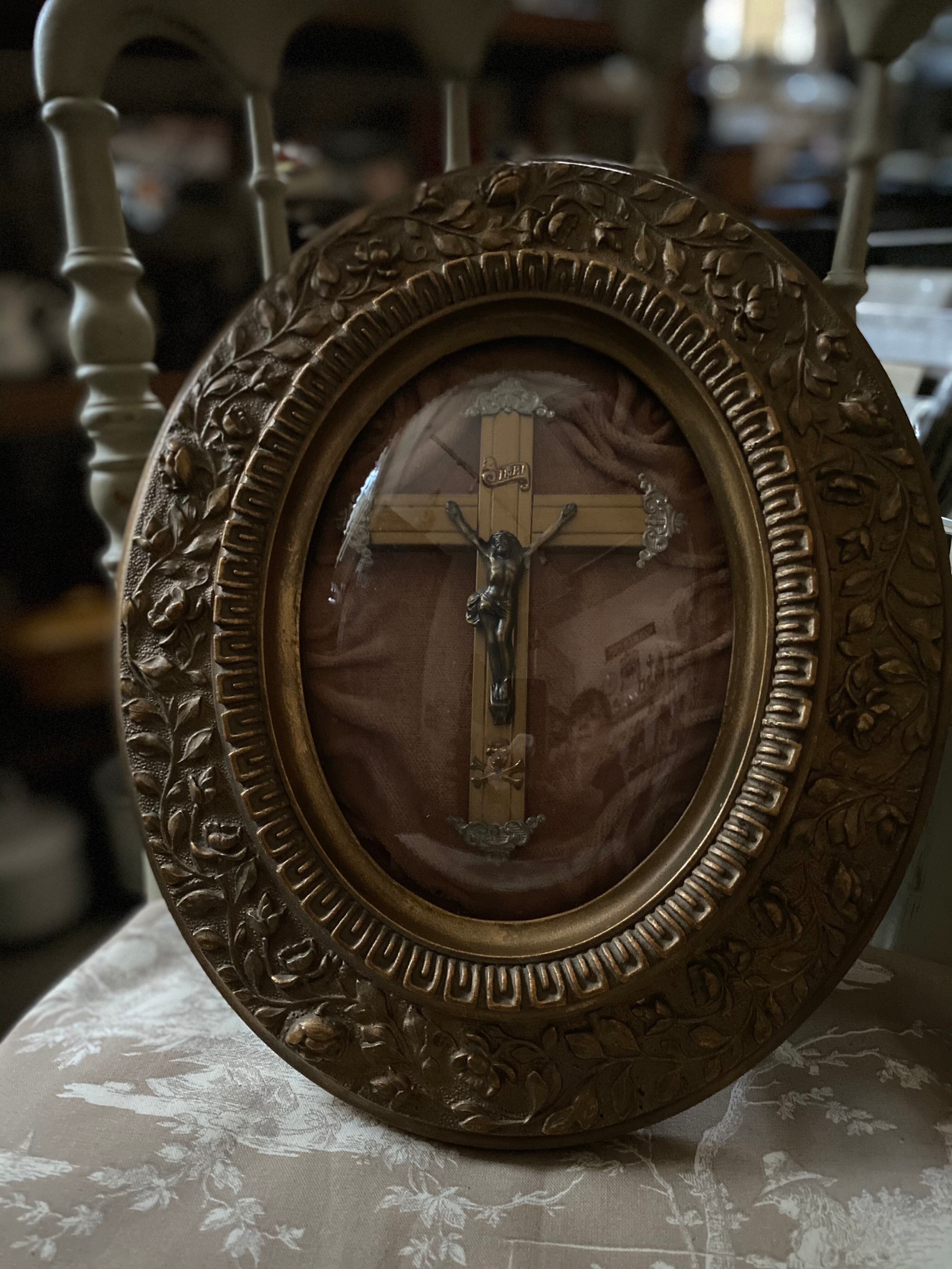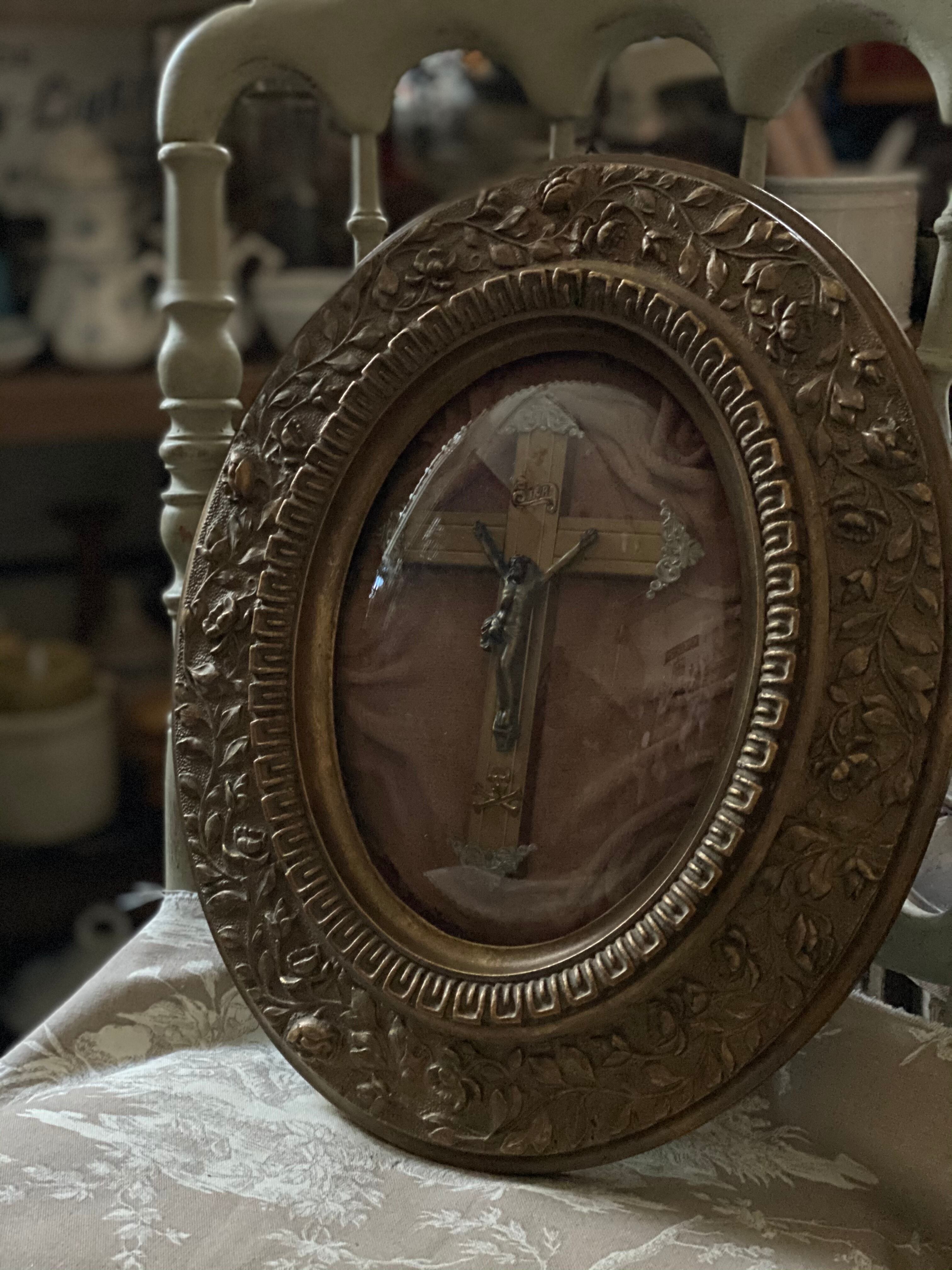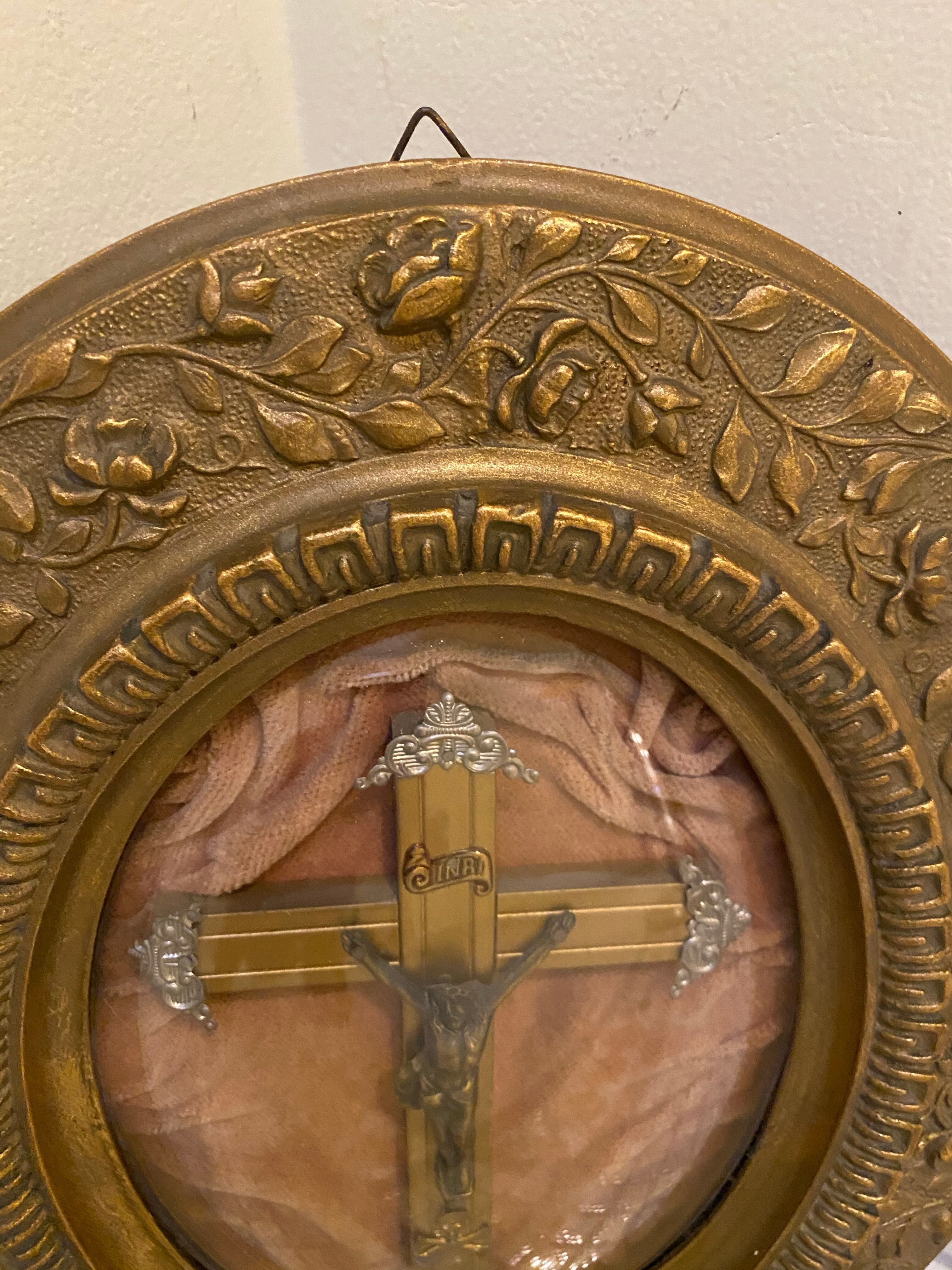 ぷっくり盛り上がったドームガラスと薔薇装飾が見事な抑えた色調のゴールドフレーム。中には古色になったベージュピンクのベルベットにクロスが大切に包み込まれるようにディスプレイされています♪