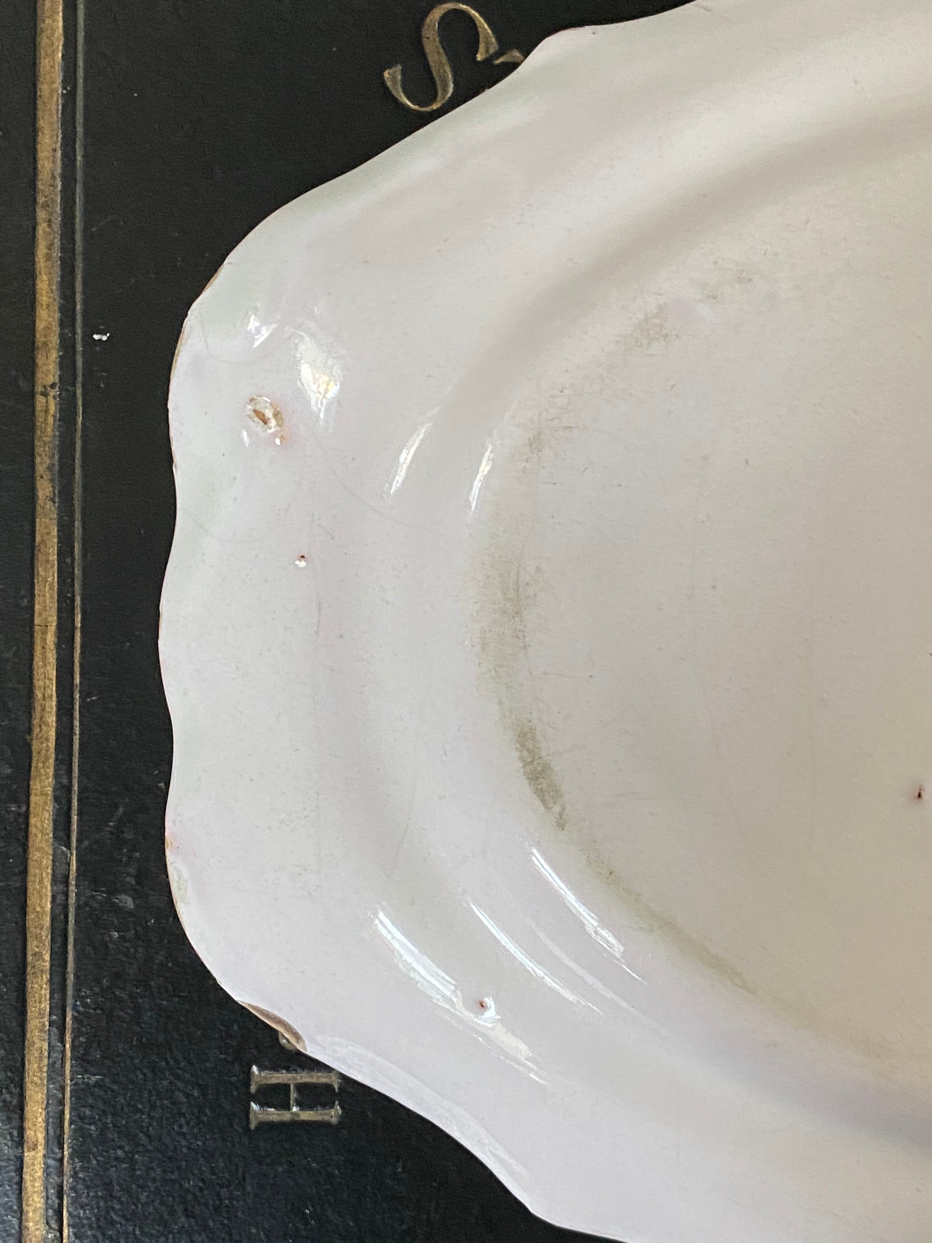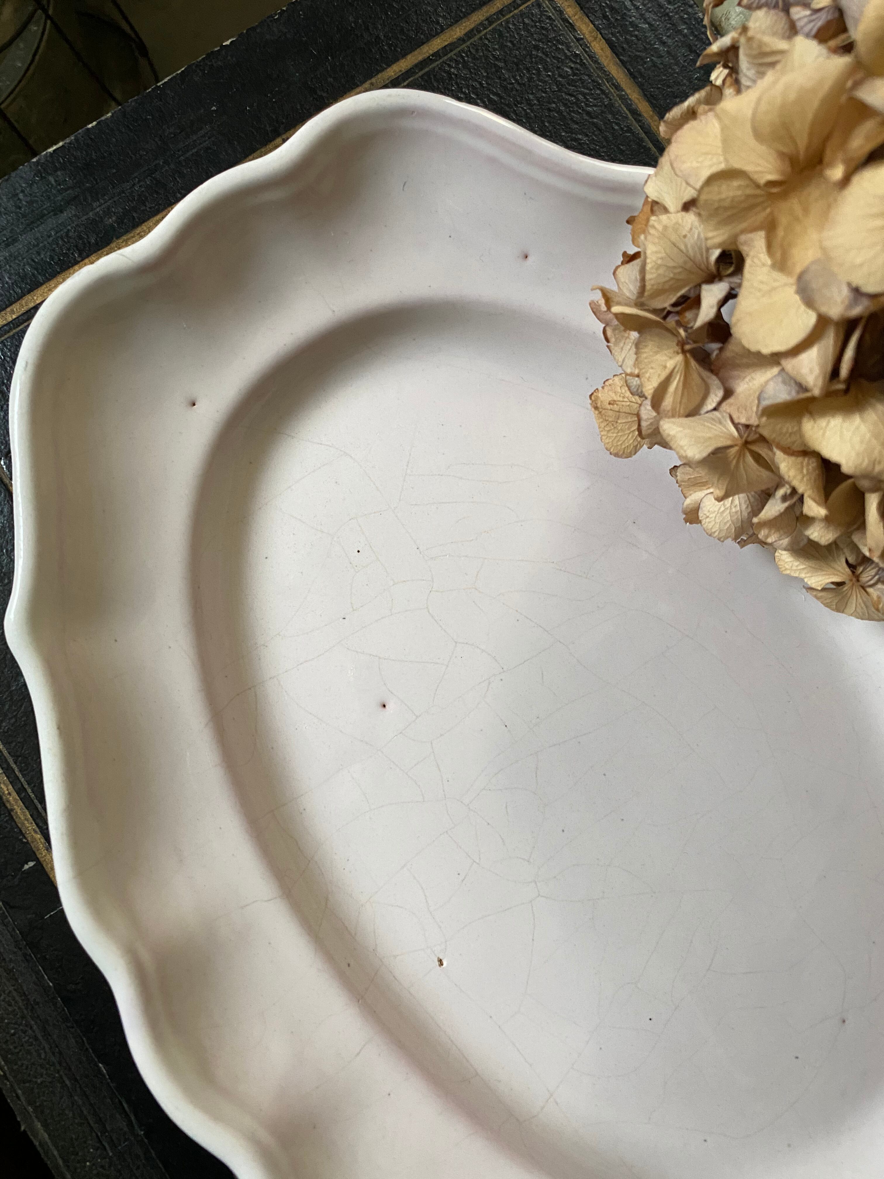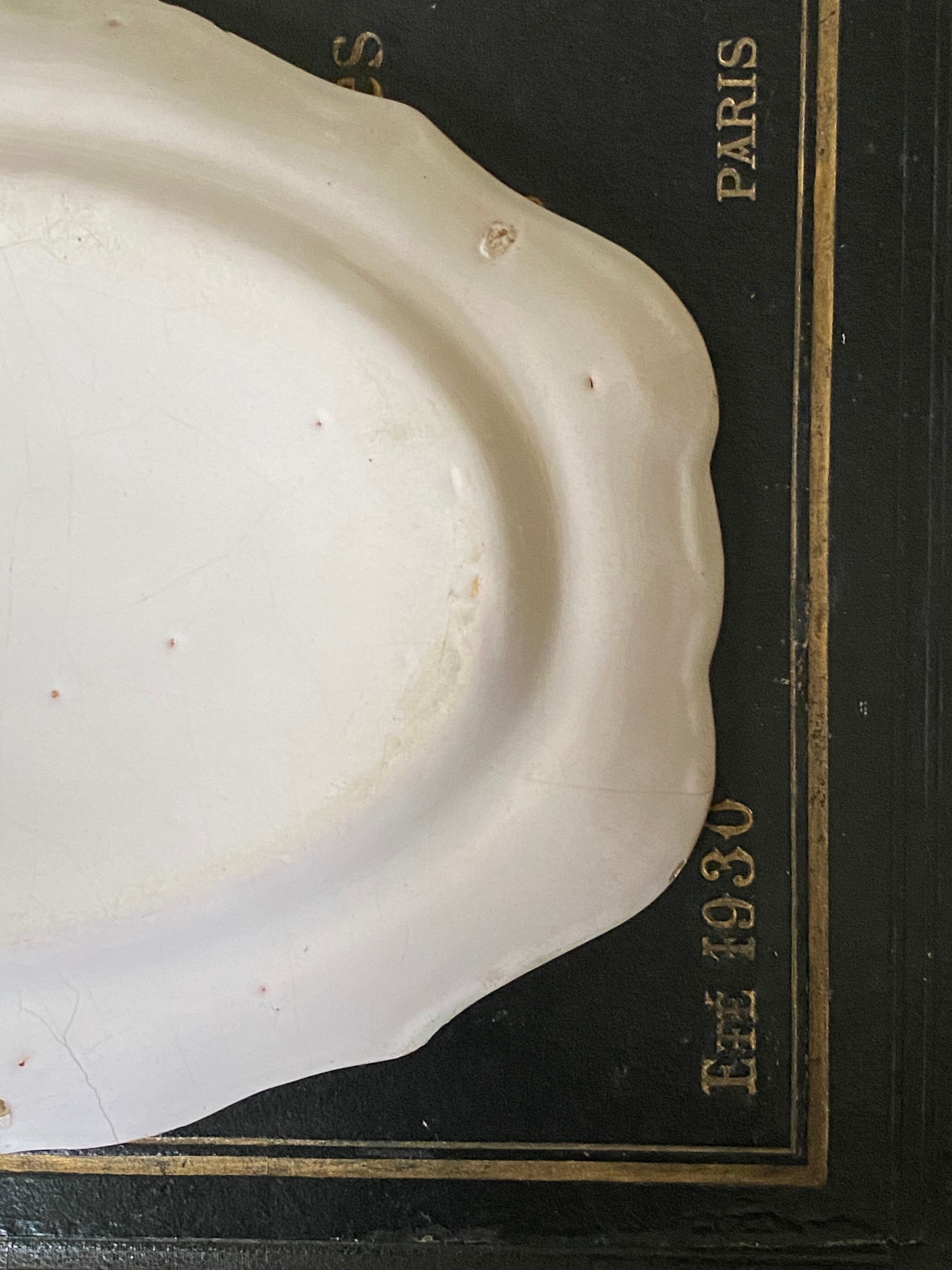 トロミを感じる白い釉薬たっぷりの*ムスティエブランを堪能していただいただける時代のあるプレートです。リムに1本凹ラインがぐるりと入っているのもありそうでないポイント。