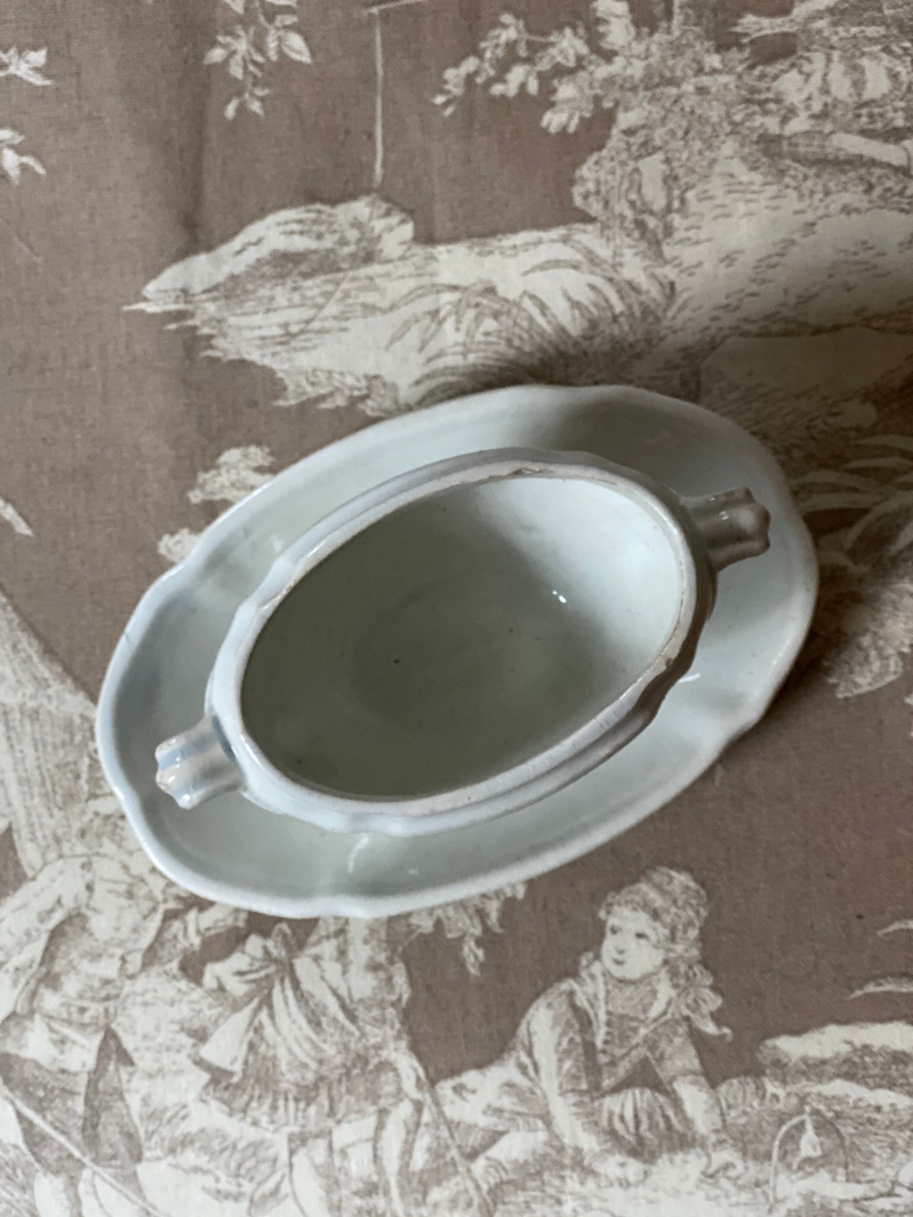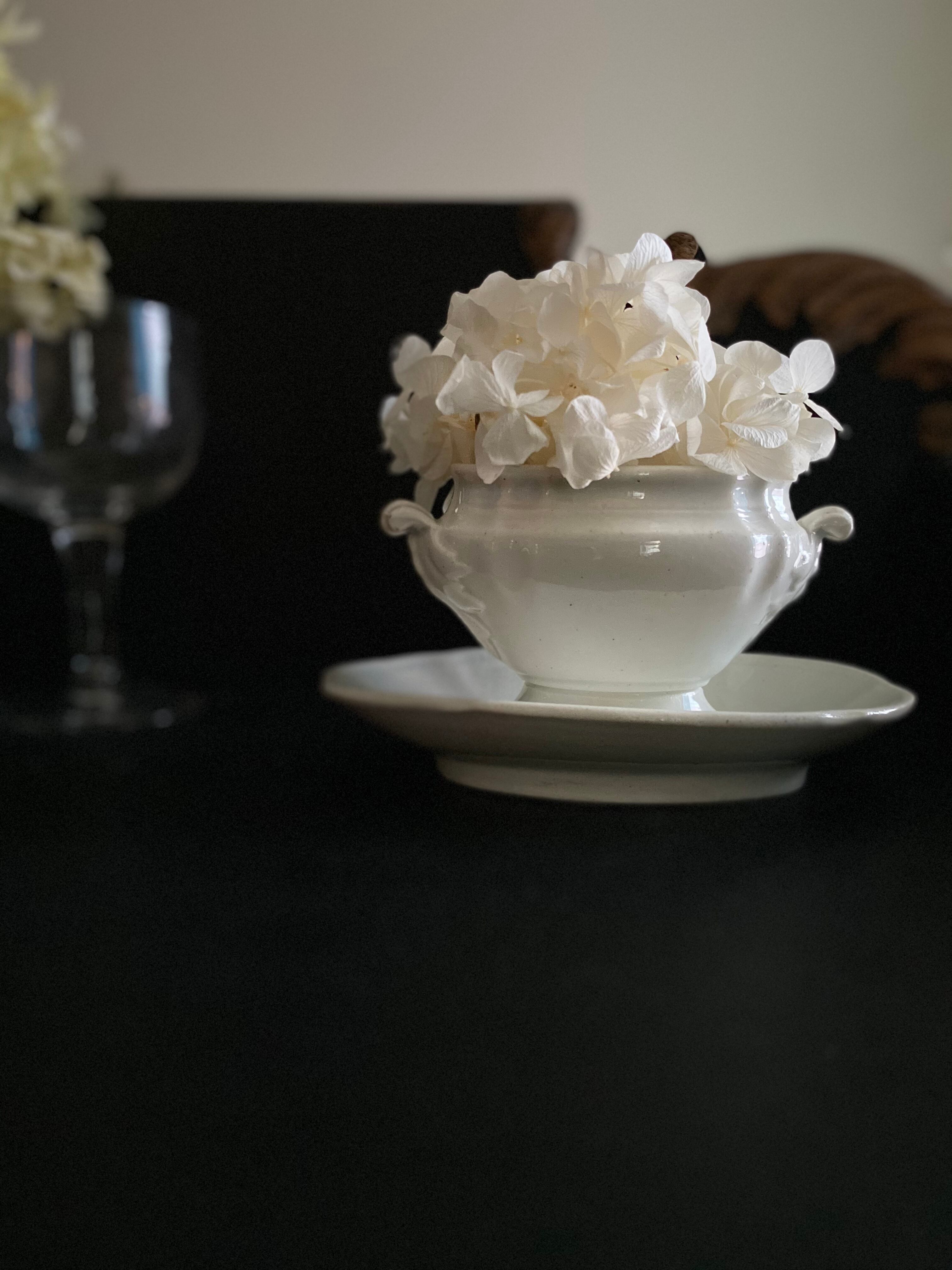 クレイユモントローらしいほんのり蒼味を感じる白釉の美しいムタディエール。元々蓋がないのかソーシエールだと言われましたが、シュクリエや花器としてもお使い頂けますね。