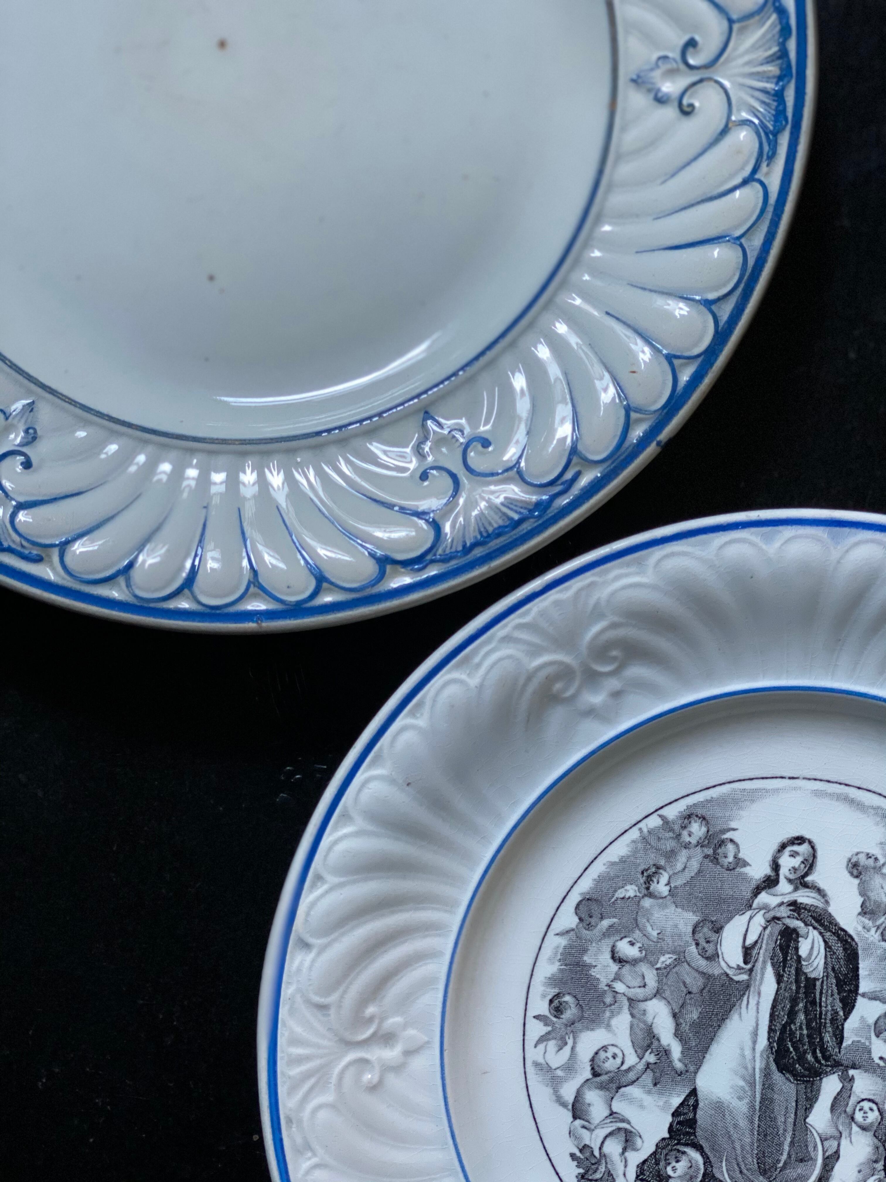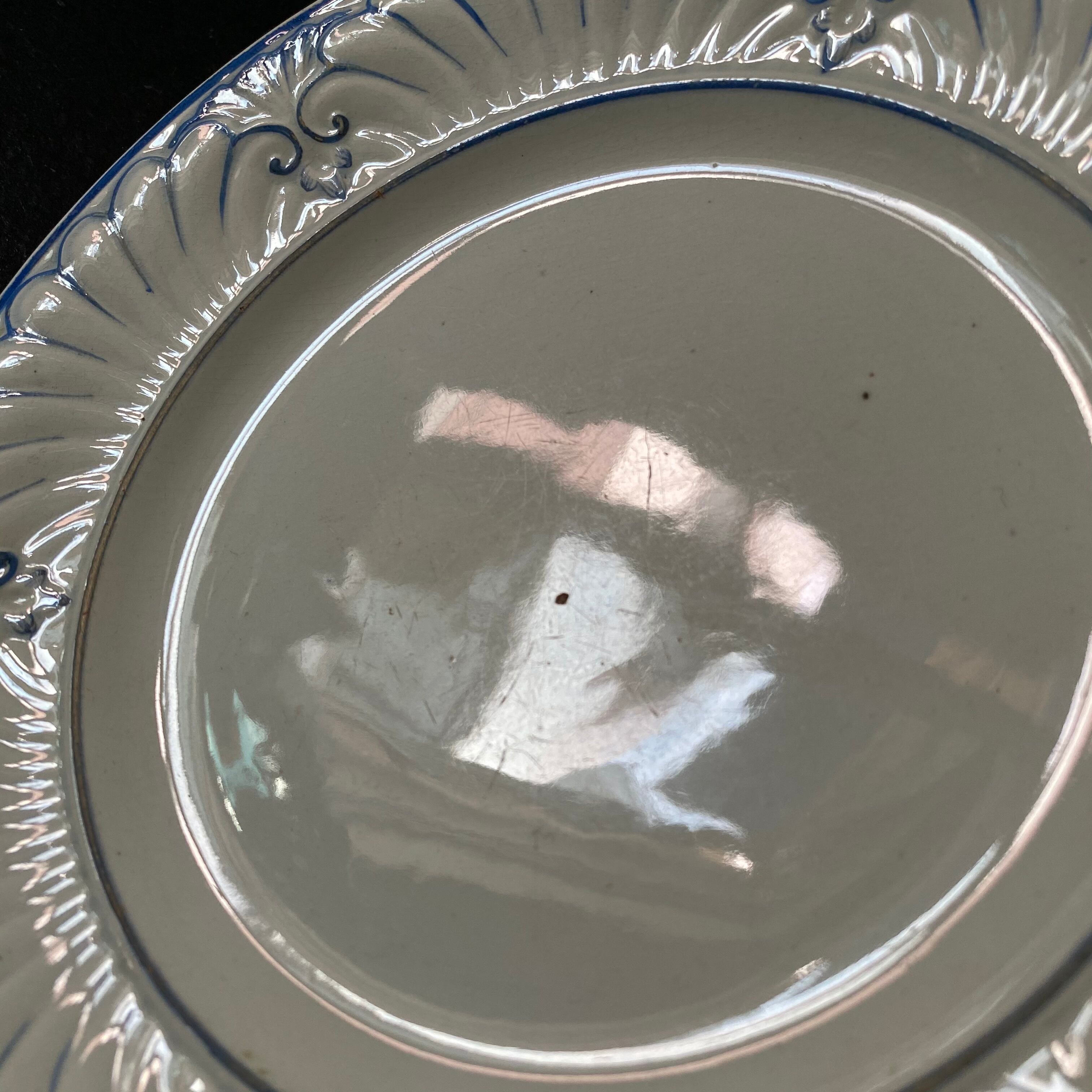 人気のロカイユレリーフプレート。こちらはレリーフに沿ってブルーのハンドペイントが施されたモデルで、リムと見込みの周りに2本の青いラインが入ったものと比べてもなかなか出会いのないタイプだと思います。コレクションにもおススメです。