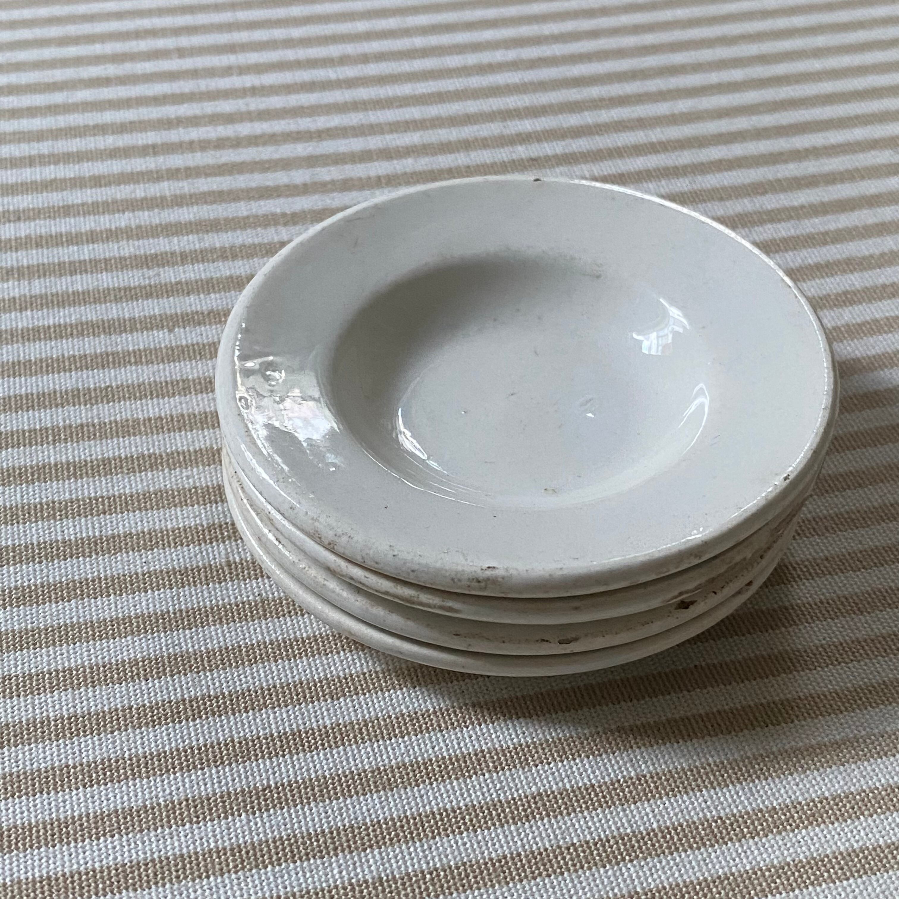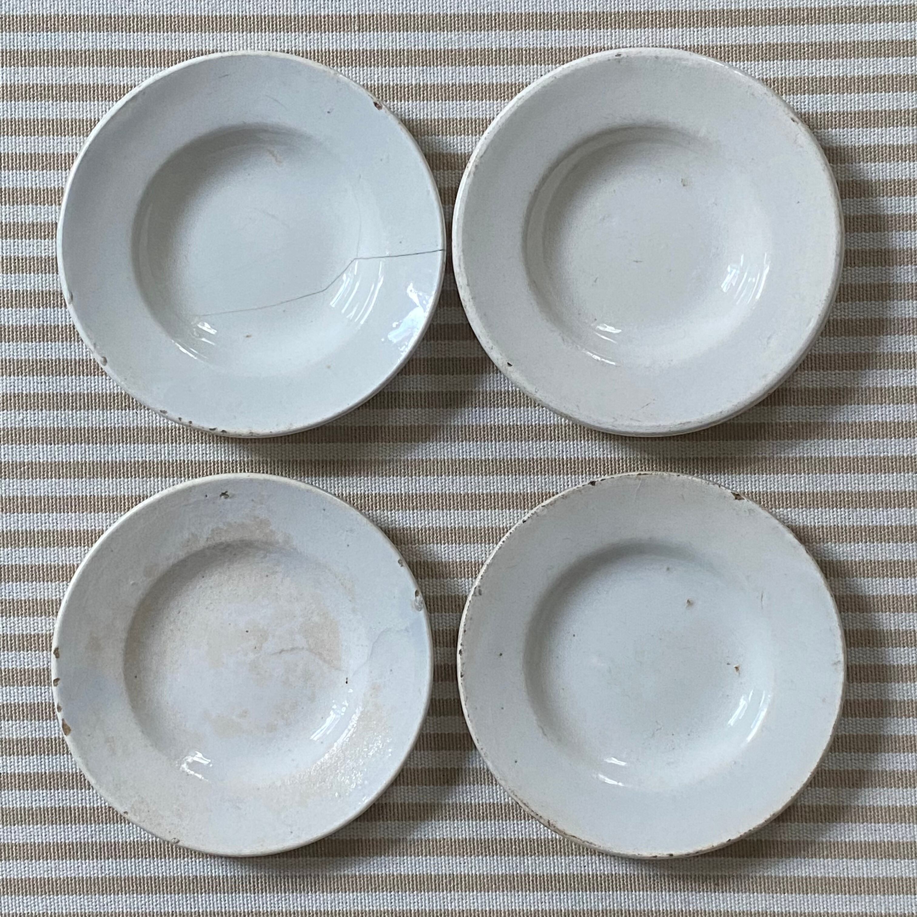 上段2枚が少し深いタイプ。手仕事により厚みやお色味、釉薬の具合など4枚それぞれが異なった仕上がりです。3枚にラインやチップ、シミなどがございます。