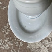 本体見込みに製造時のえくぼが1か所。ソーサ―部に製造時のくっつきが1か所、裏には釉抜け、高台にチップがございますがご使用に問題はございません。その他ヒビカケなくツヤもあり、蒼味がかった白釉の陰影が美しい大変良いコンディションです。
