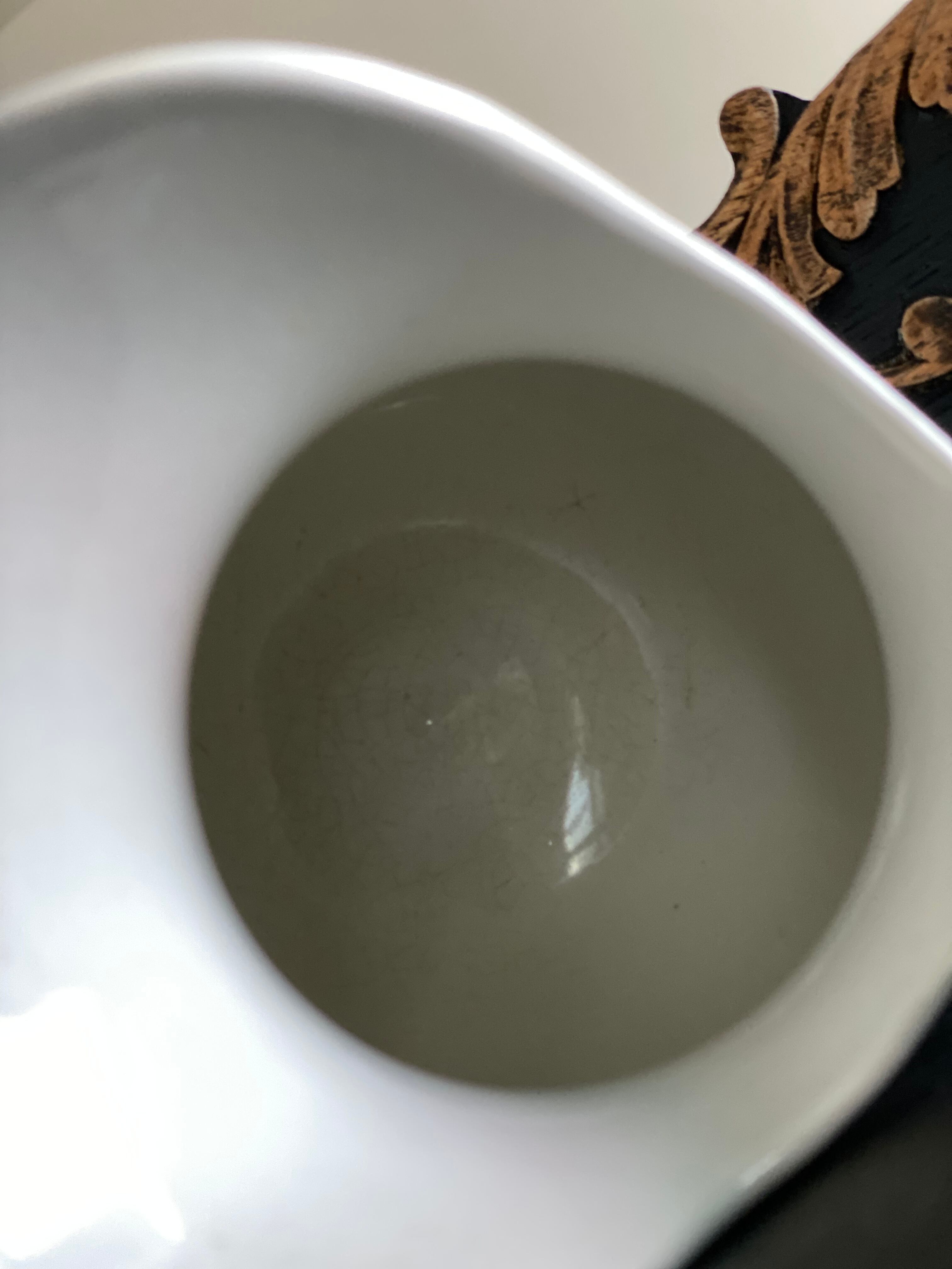 こちらは、首のくびれの2本のレリーフラインがくっきりとして、スワンのような取手の意匠も凝ったおつくりです。見込みに細かな貫入がありますが、ヒビカケ水漏れ無く美品です(1時間ほど水を張りました)