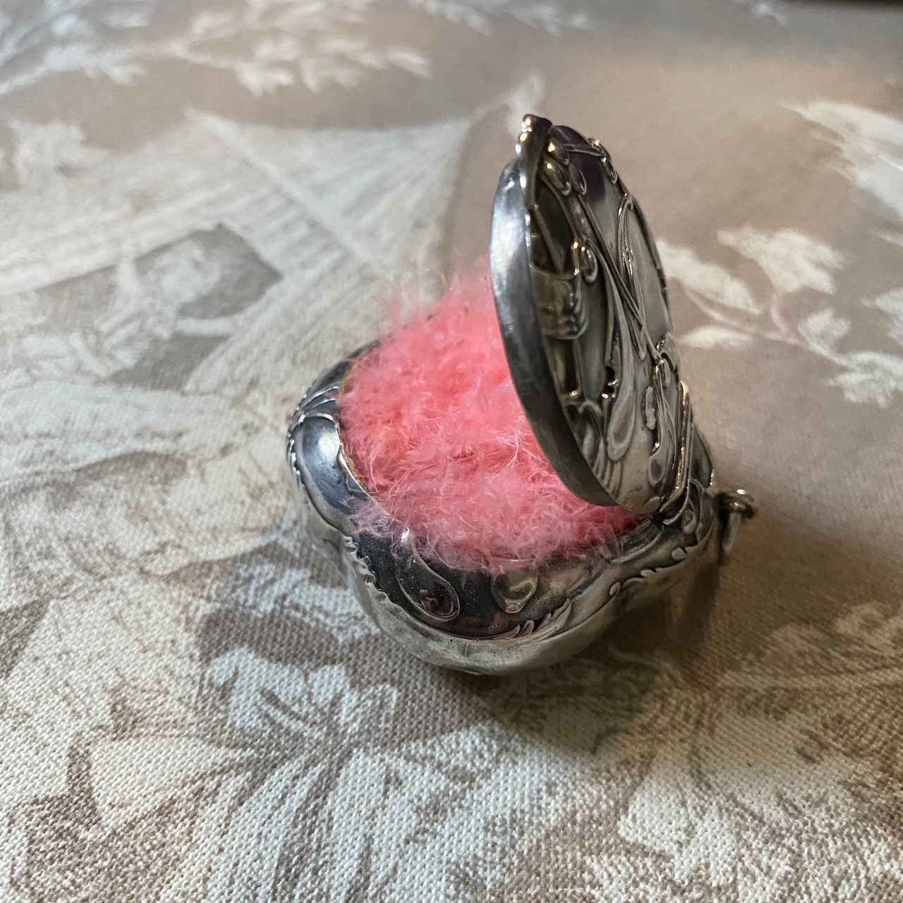 蓋はカチッと音がしてしっかり閉まり、中のミラーも大変状態良く実用できます。中はベルメイユ金彩加工されていたようで、薄っすらゴールドが確認できます。桃色のパフが残っているのも珍しいです。