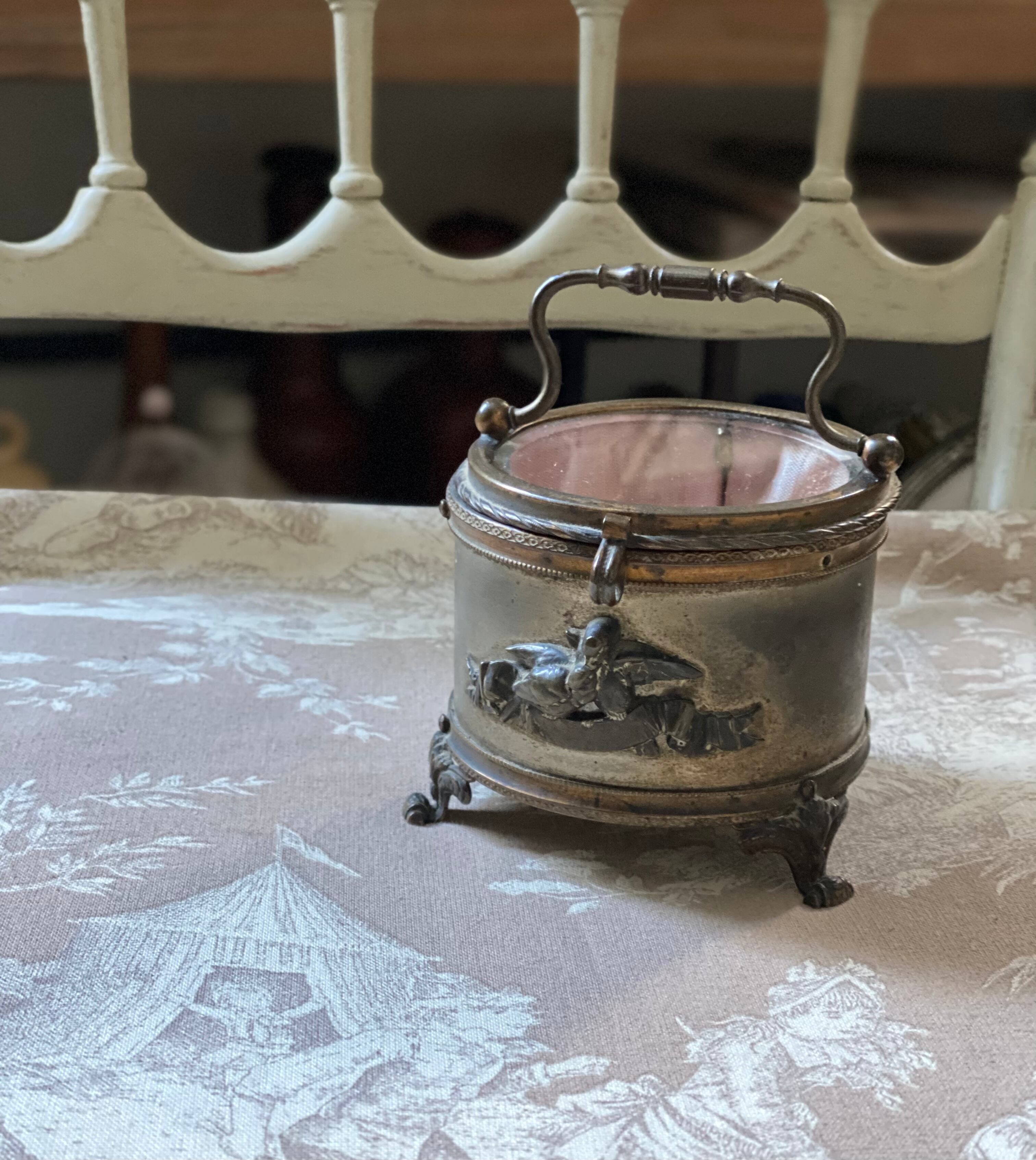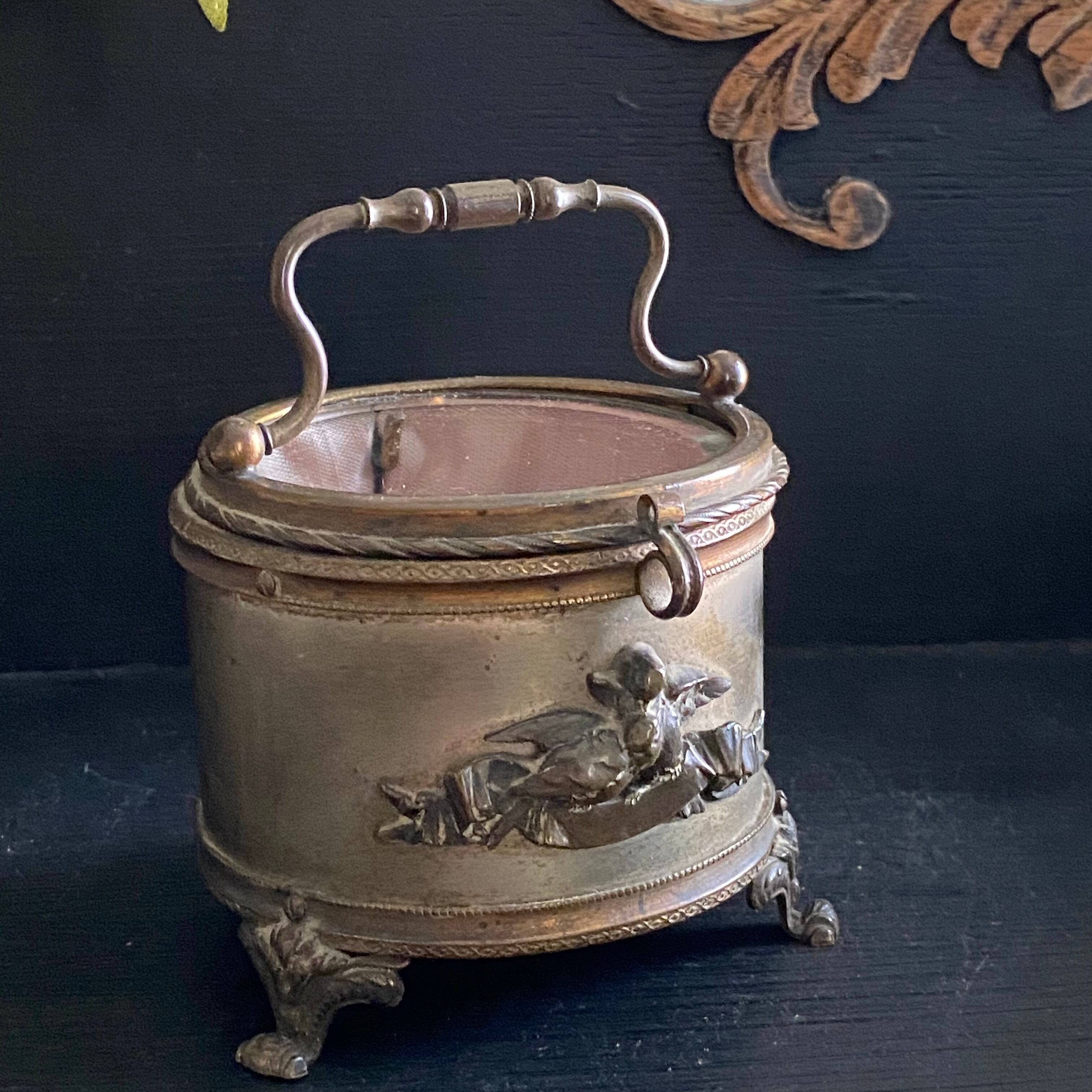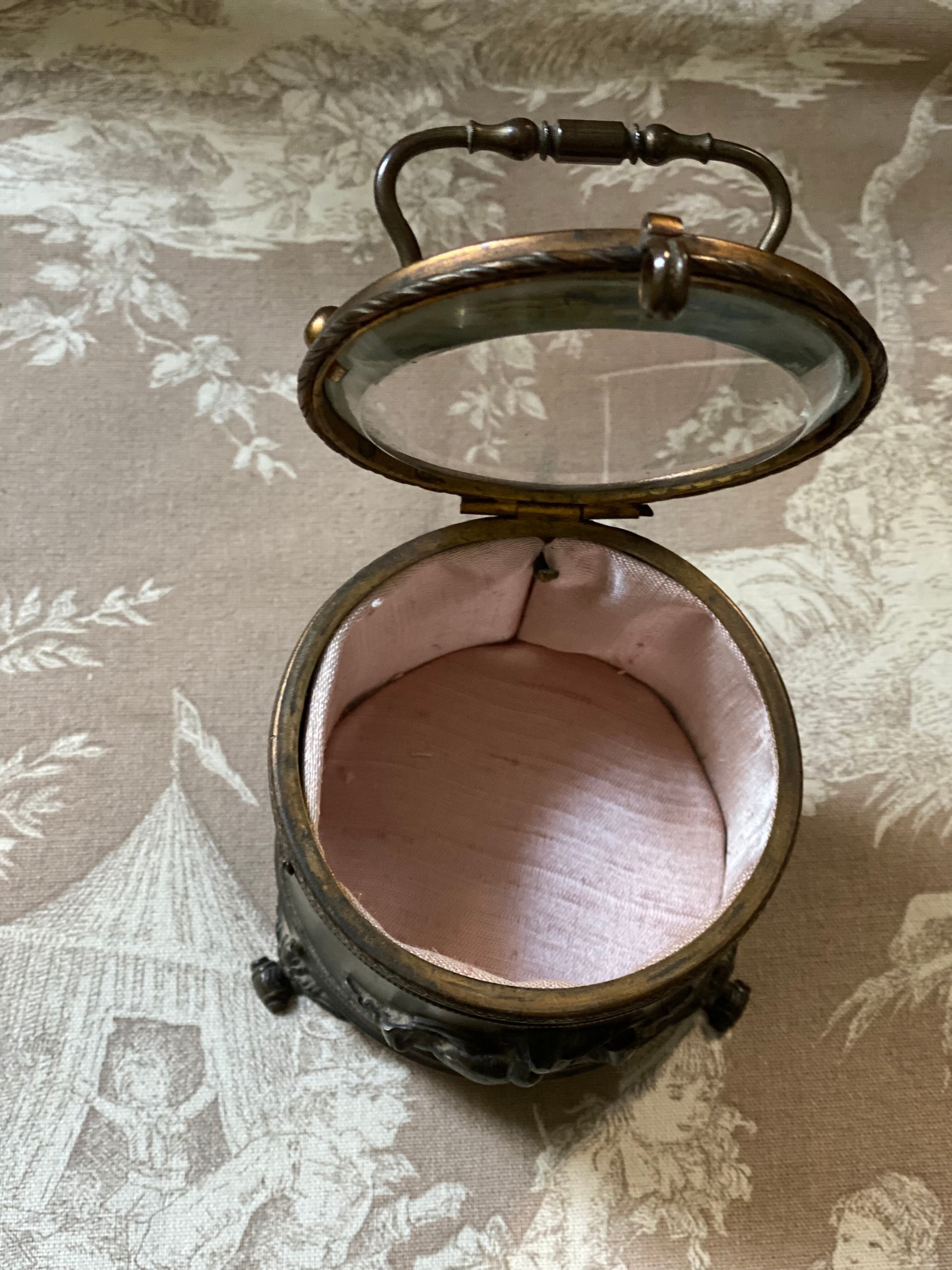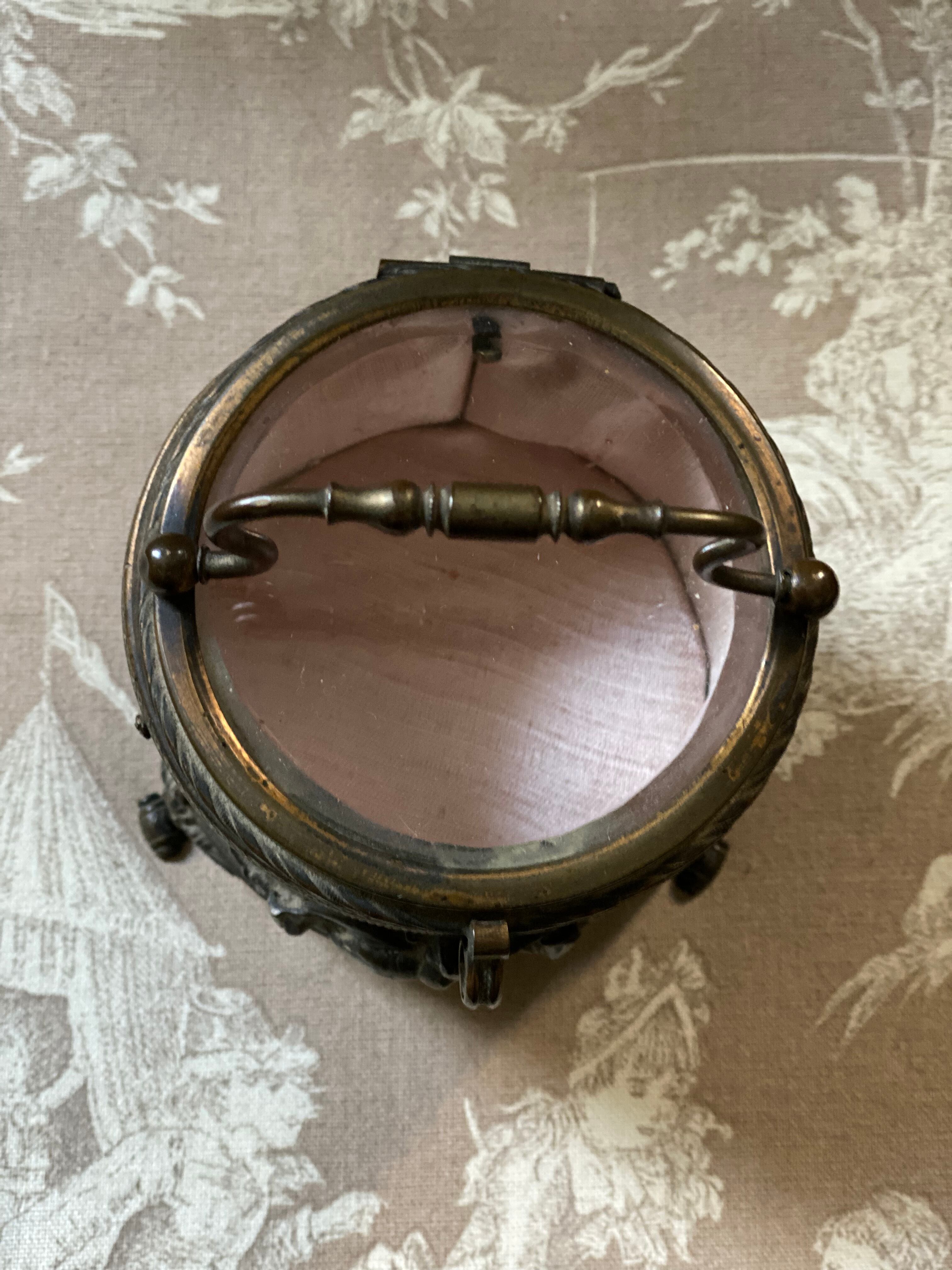 リボンと鳥のレリーフとピンクの中張りが美しいジュエリーケース。脚の意匠も素晴らしいです。フックがついているので婦人用の小さな懐中時計用を兼ねたお品でしょう。シャトレーン用の小さなプドリエを参考にかけてみました。ブローチなどもかけることが出来ます。