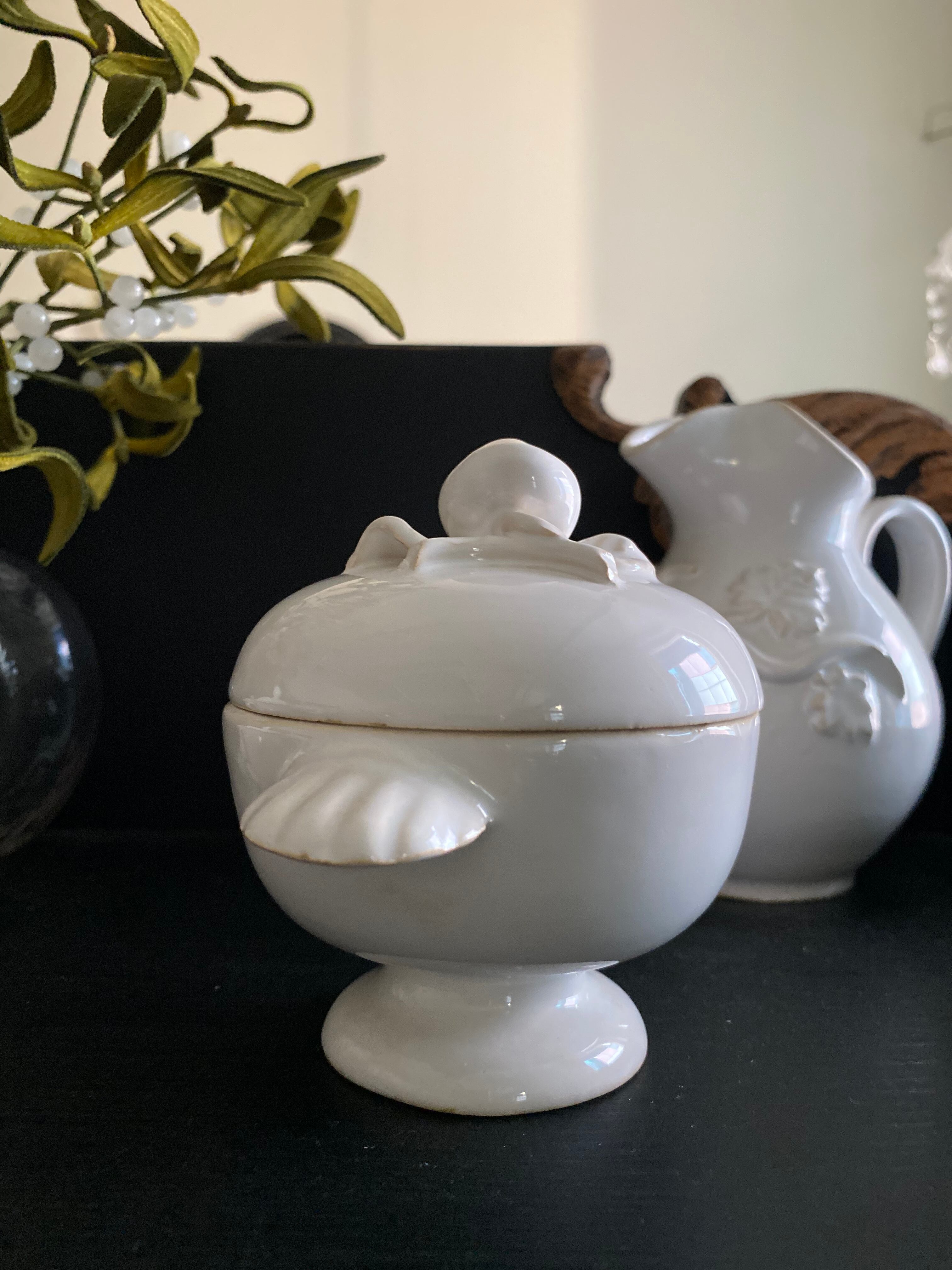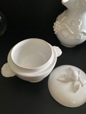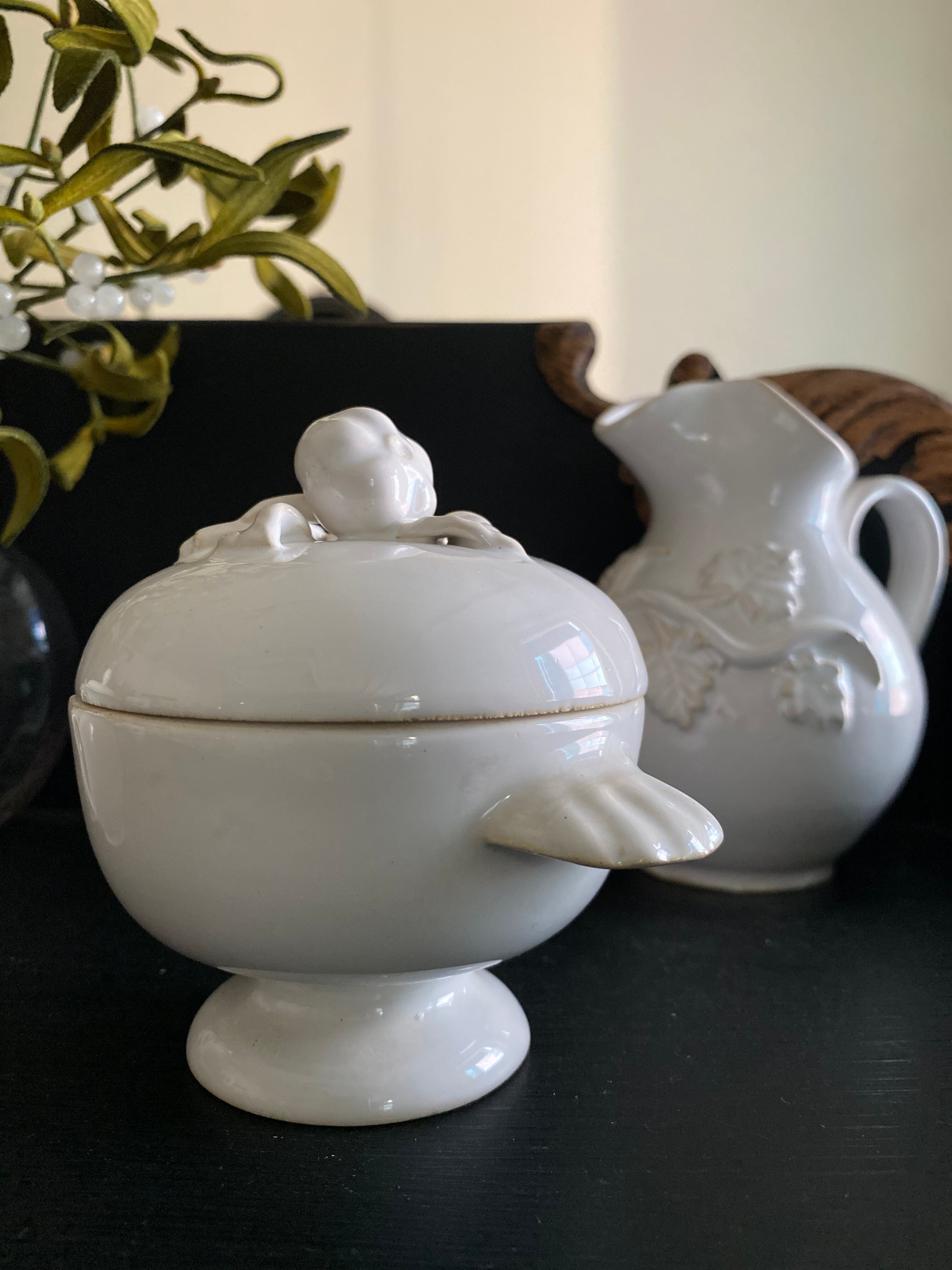 まったりとしたとろみを感じる白釉、蓋摘みのフルーツモチーフが素敵なディネットのスーピエール。羽のような持ち手といい、コロンとしてとにかくカワイイのです♪