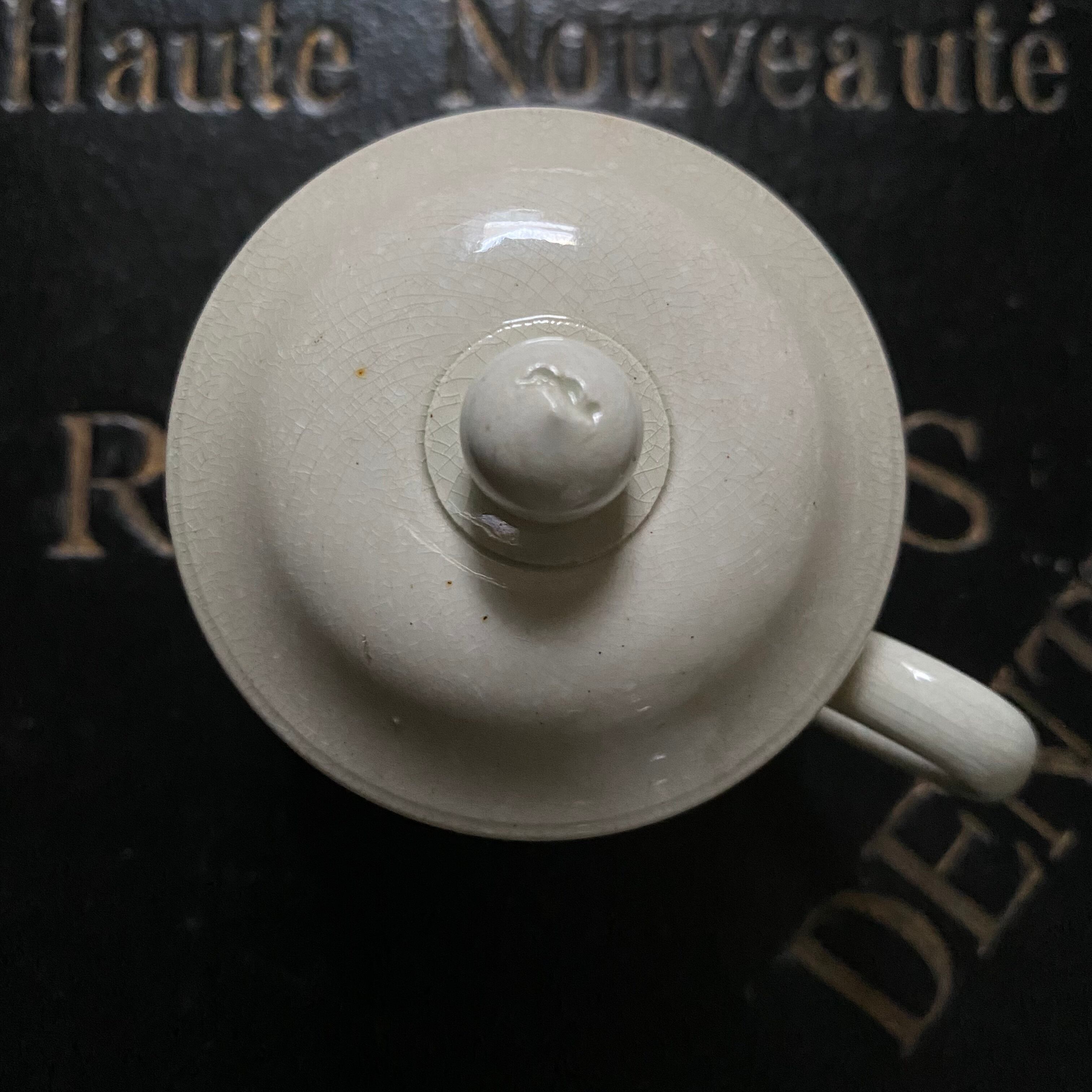 デザート用のクリームカップ。マスタード用と同じ位の大きさ。刻印はありませんがベージュ系の小さなこちらは、モントローがクレイユと合併前のものと似ていると思います。大変薄い器体、シンプルながらエッジのきいた仕上がりは、上質で繊細なファイアンスフィーヌらしさを堪能していただけると思います。
