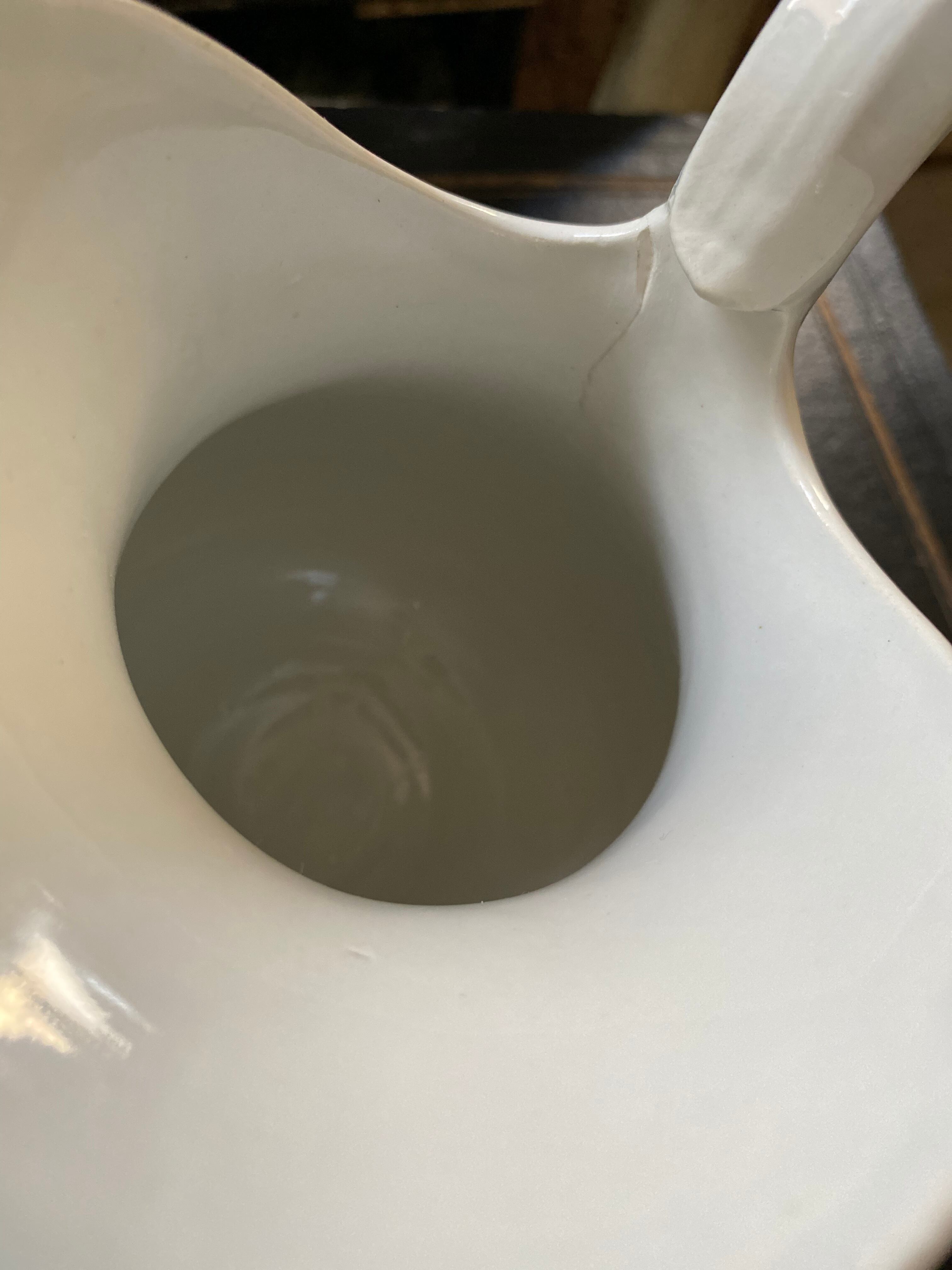 こちらも美しいフォルム。持ち手付近に表裏にひびくラインがありますが、目立たない位置でご使用にも問題はないと思います。水漏れもありません。