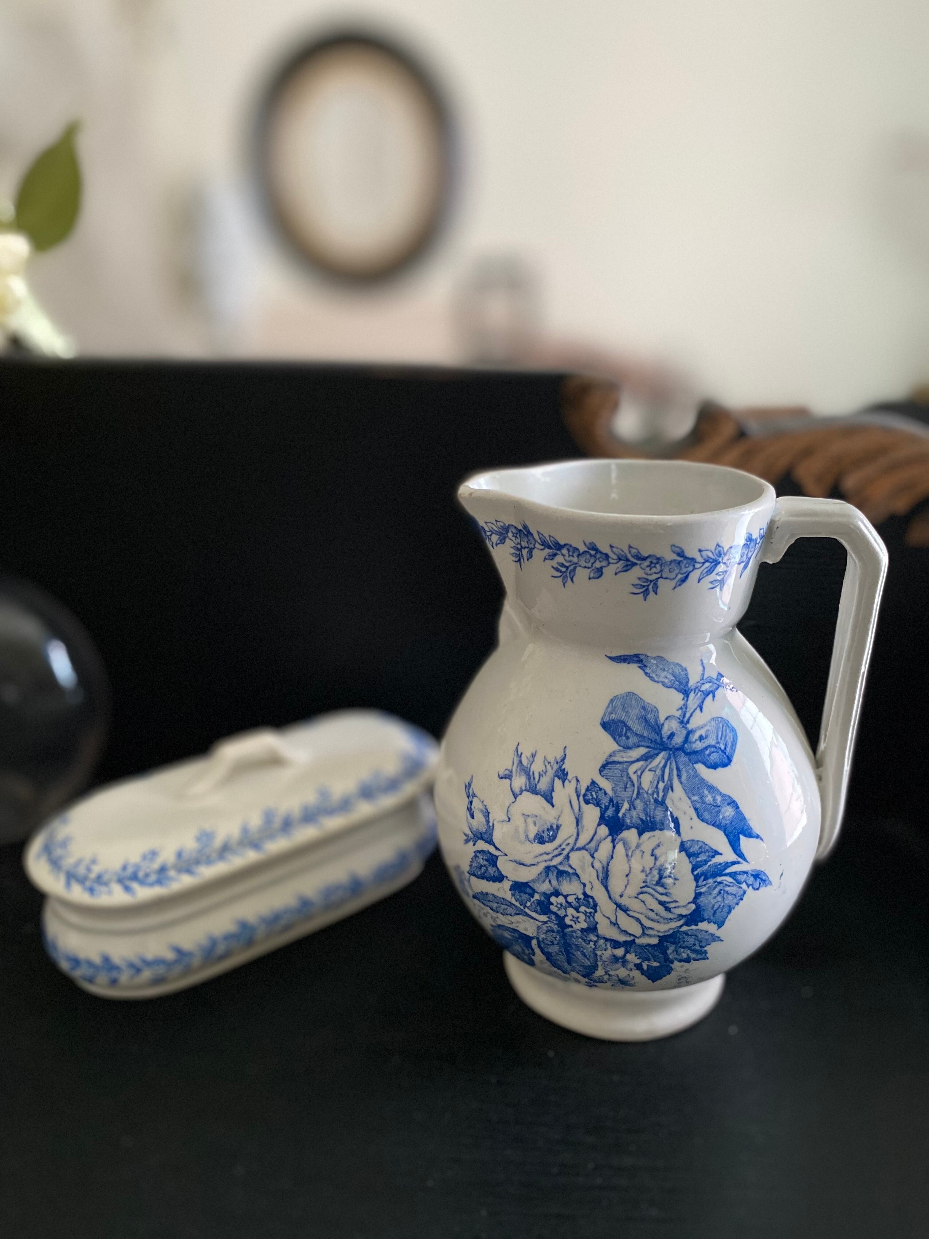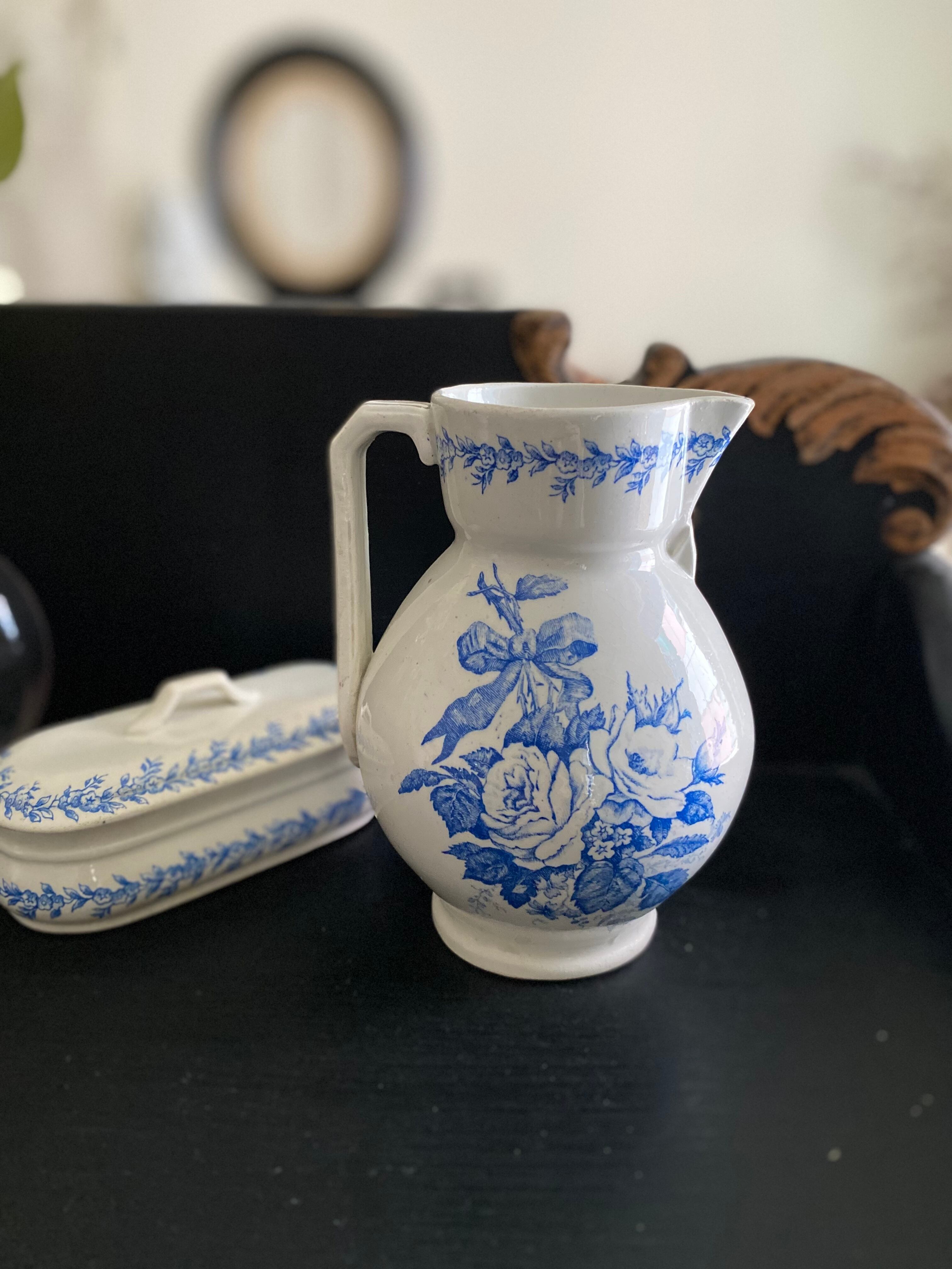 青でリボンとお花が美しく描かれたディネットのピシェとボウル。白×ブルーが爽やかなセットです。