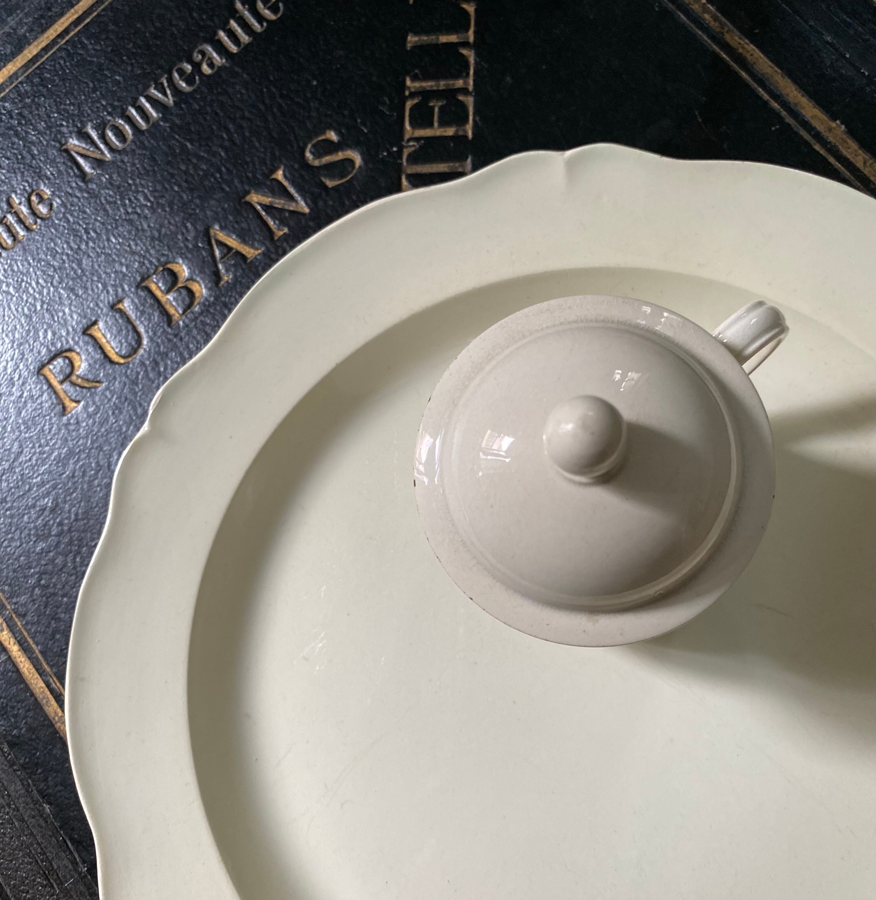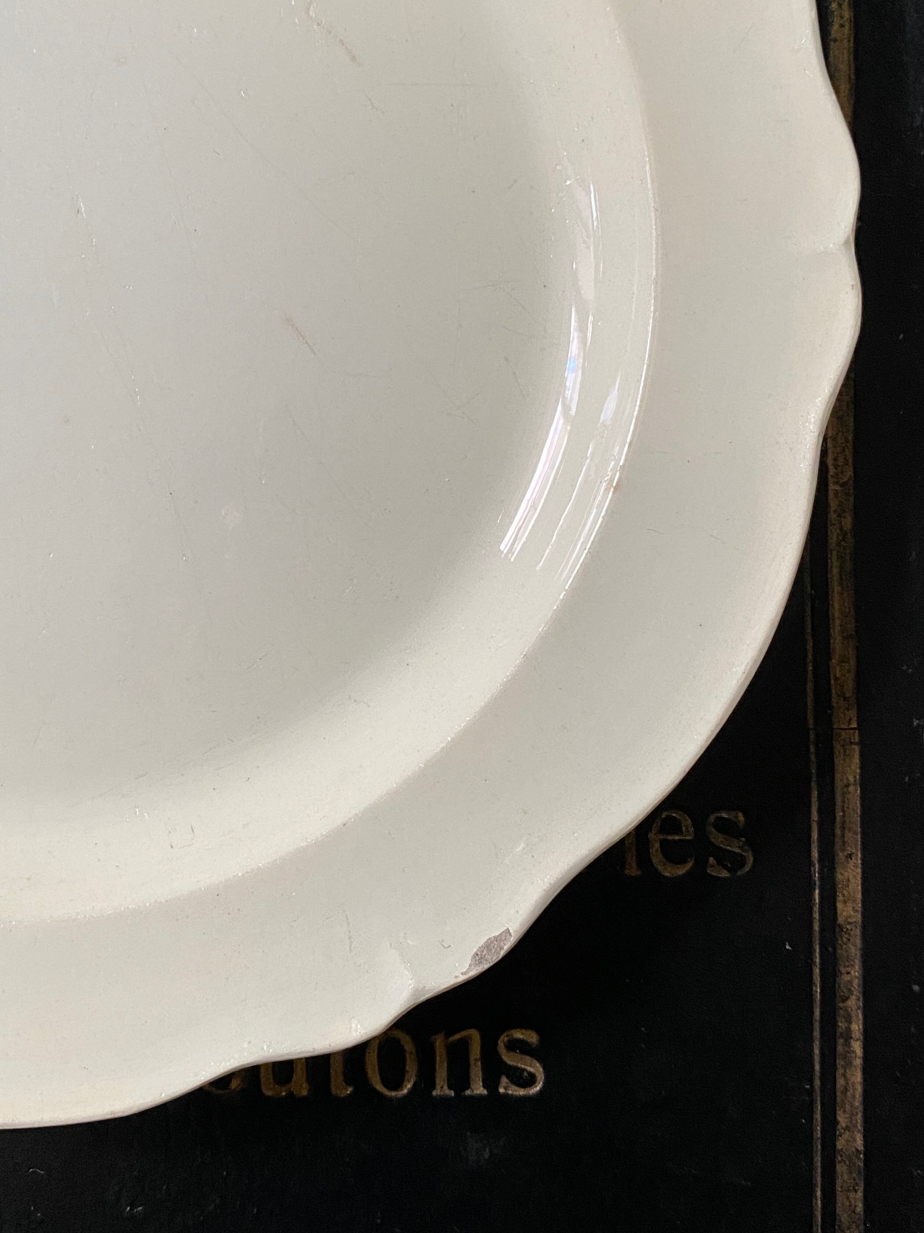 リムに釉薬の剥がれやカトラリー跡などもありますが、この時代ものとしては大変良いコンディションです。白はお写真がわかりにくいかと思いますが画像でご確認下さいませ。真っ白ではなくほんのりと黄みを感じるカラーです。