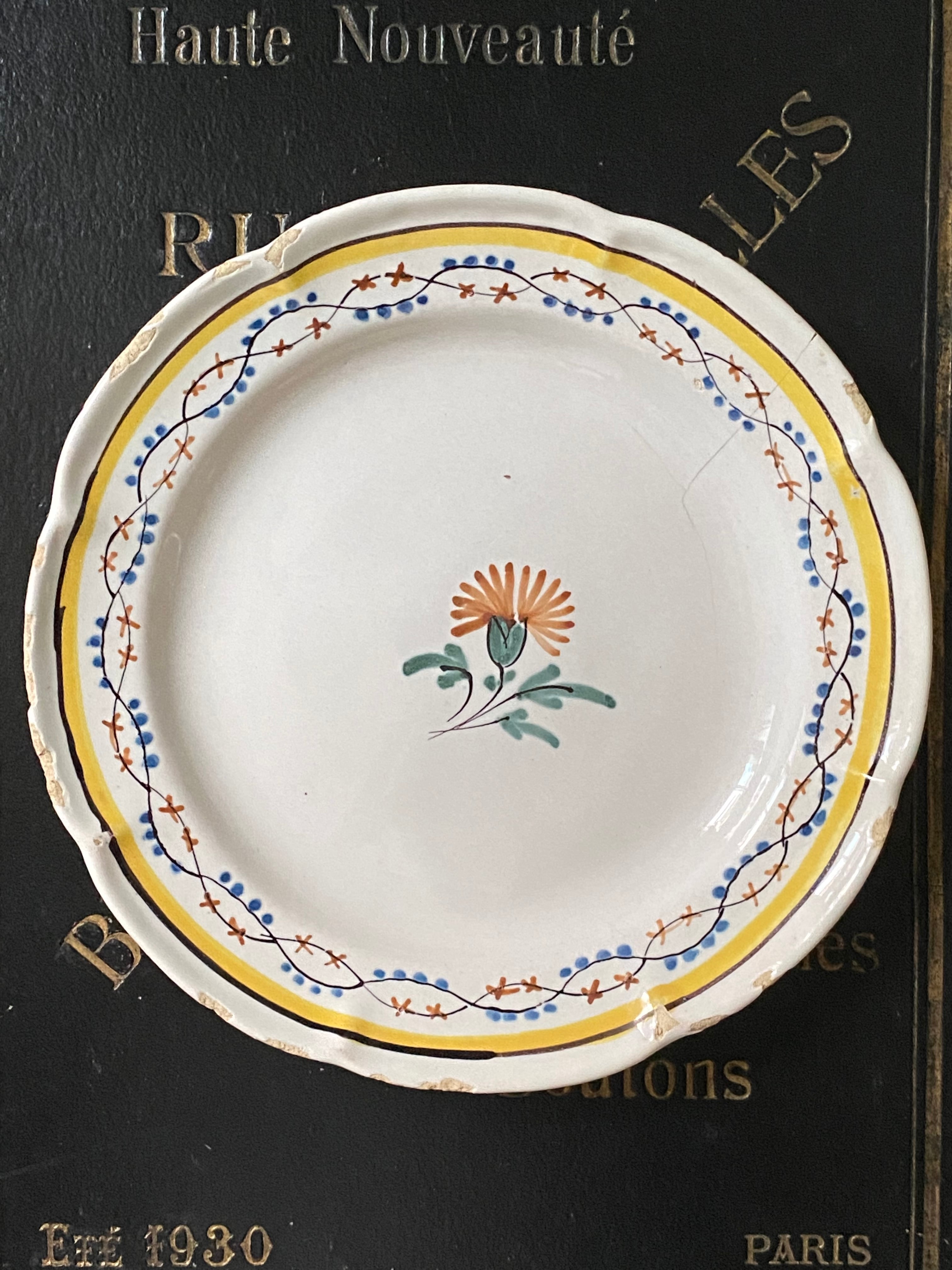 時代のある南仏陶器としてはお決まりのような釉薬の剥がれやカケ、ラインもあり、大きなラインは裏にもひびいていますが、素朴なハンドペイントのタッチや意匠にもセンスを感じる 味わい深い古手のプレートだと思います♪