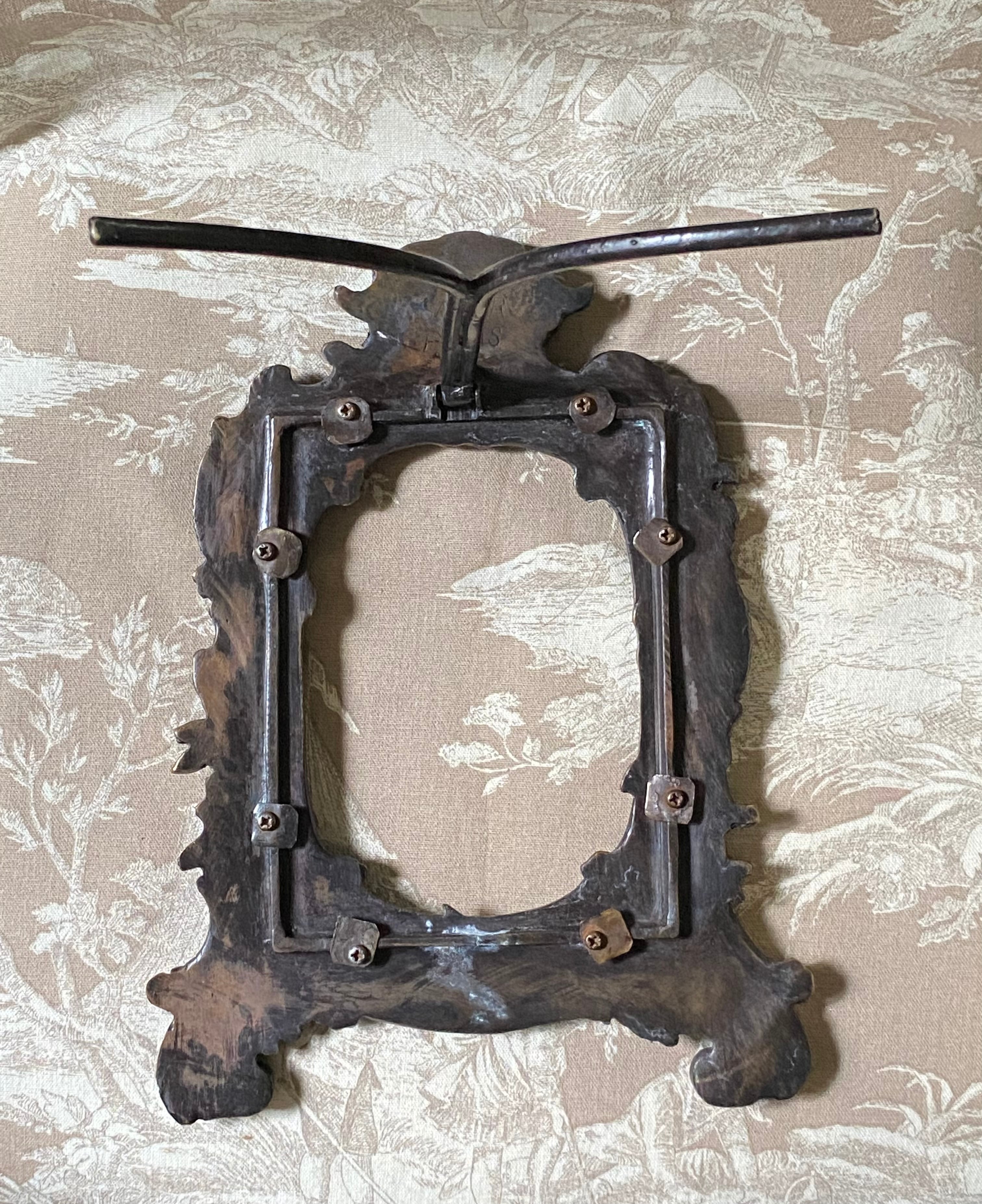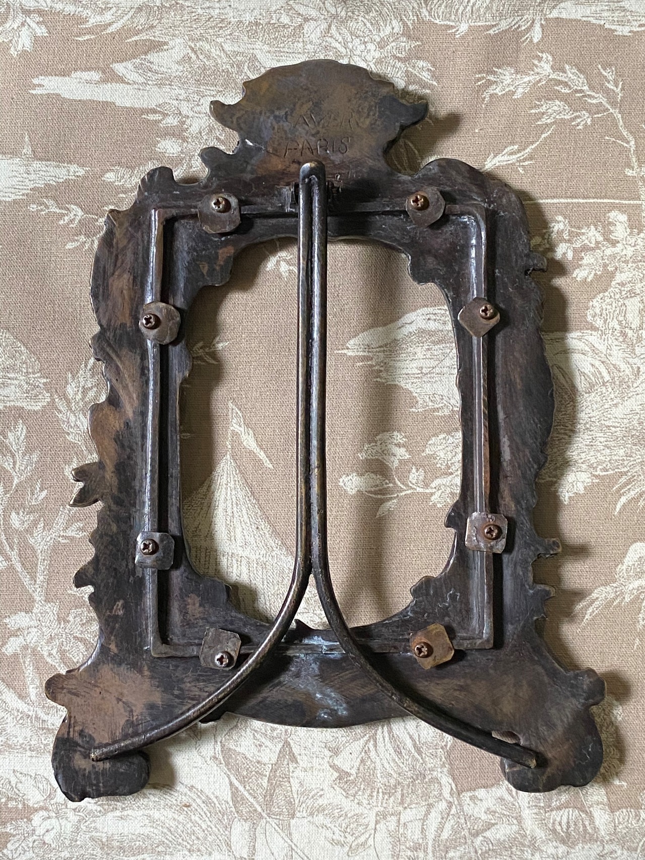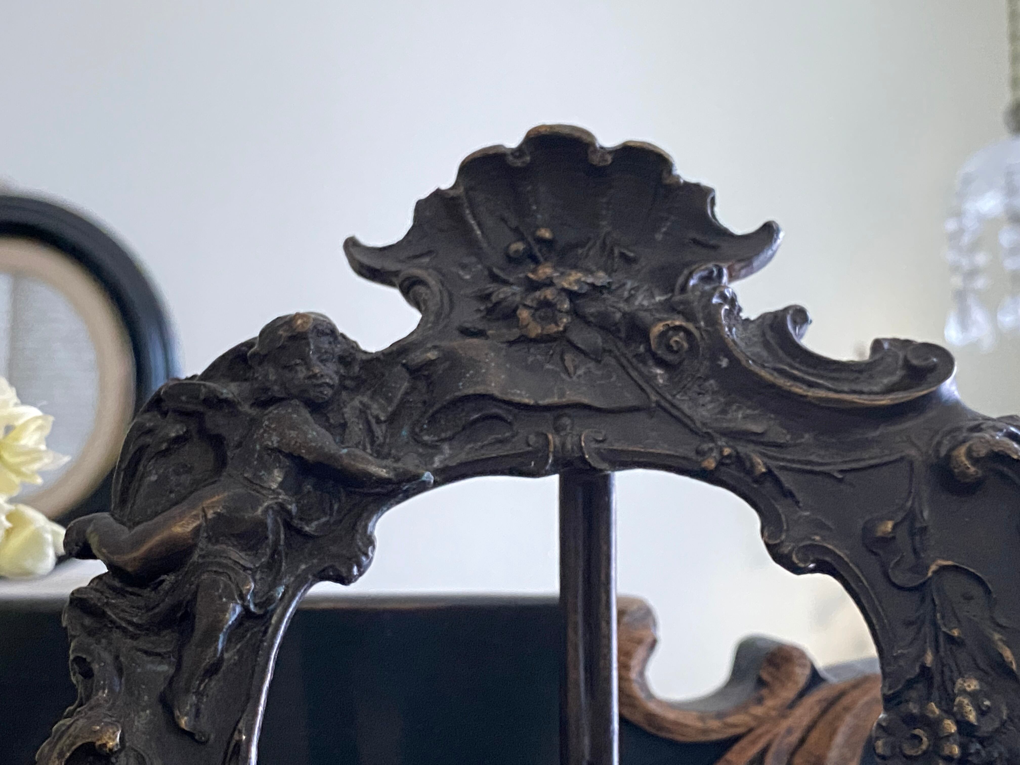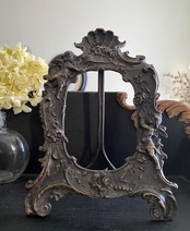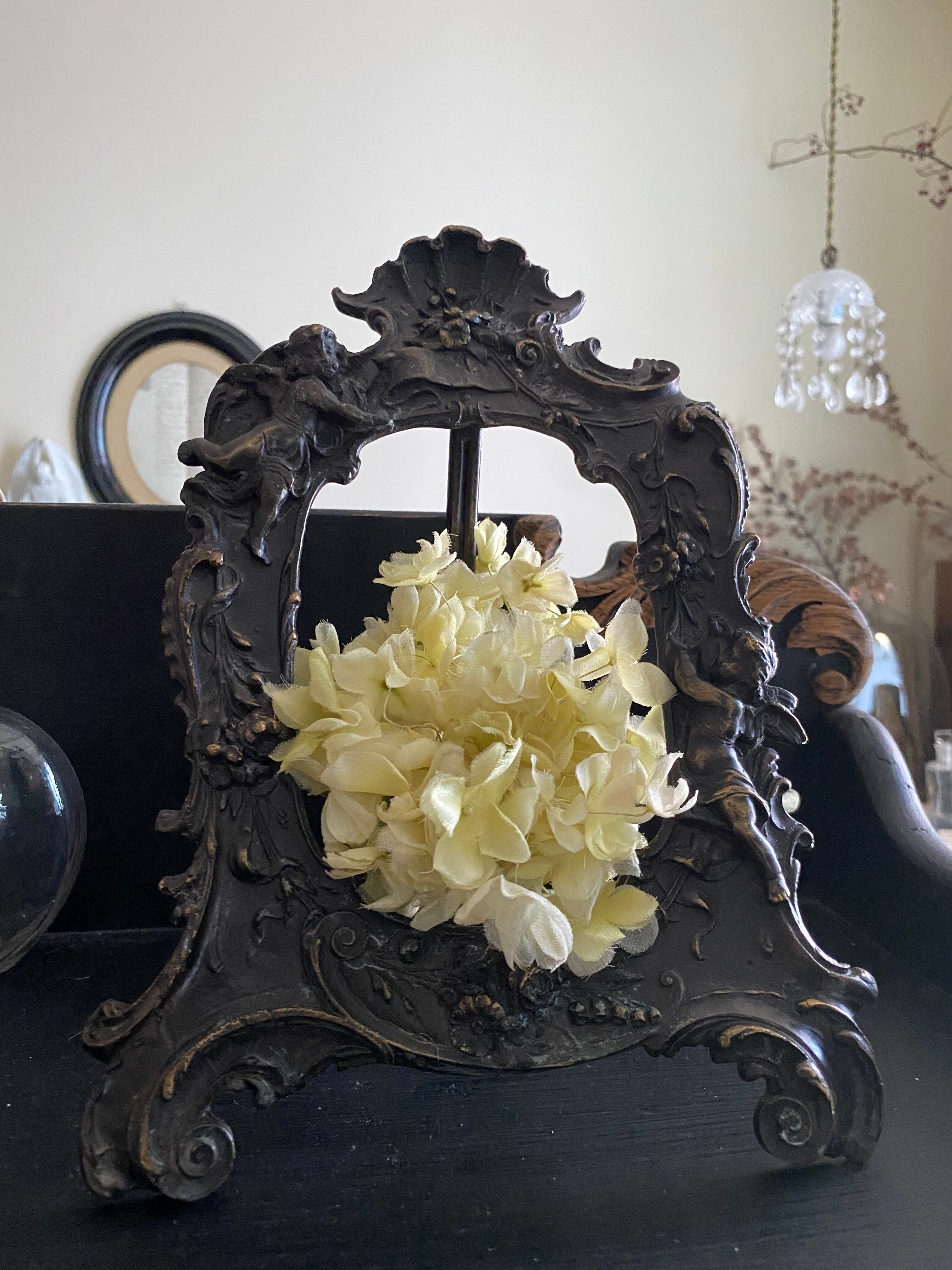 天使やお花ロカイユの見事なレリーフ意匠のフレーム。ガラスや背当てはありません。お色はブロンズブラックという感じですが、立体部分の地金のゴールドが見えていたりして陰影が出て、シックでとても素敵。まるでオブジェのようです♪