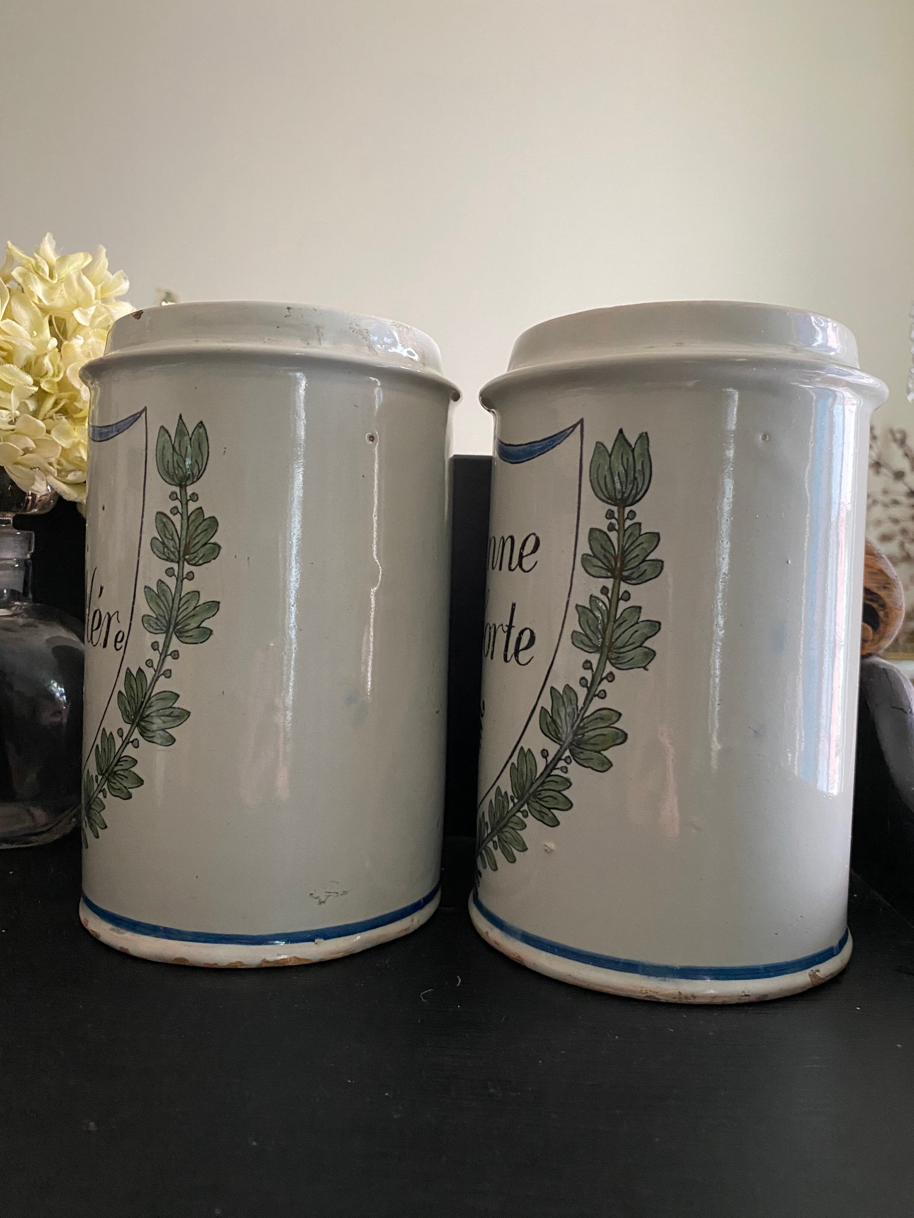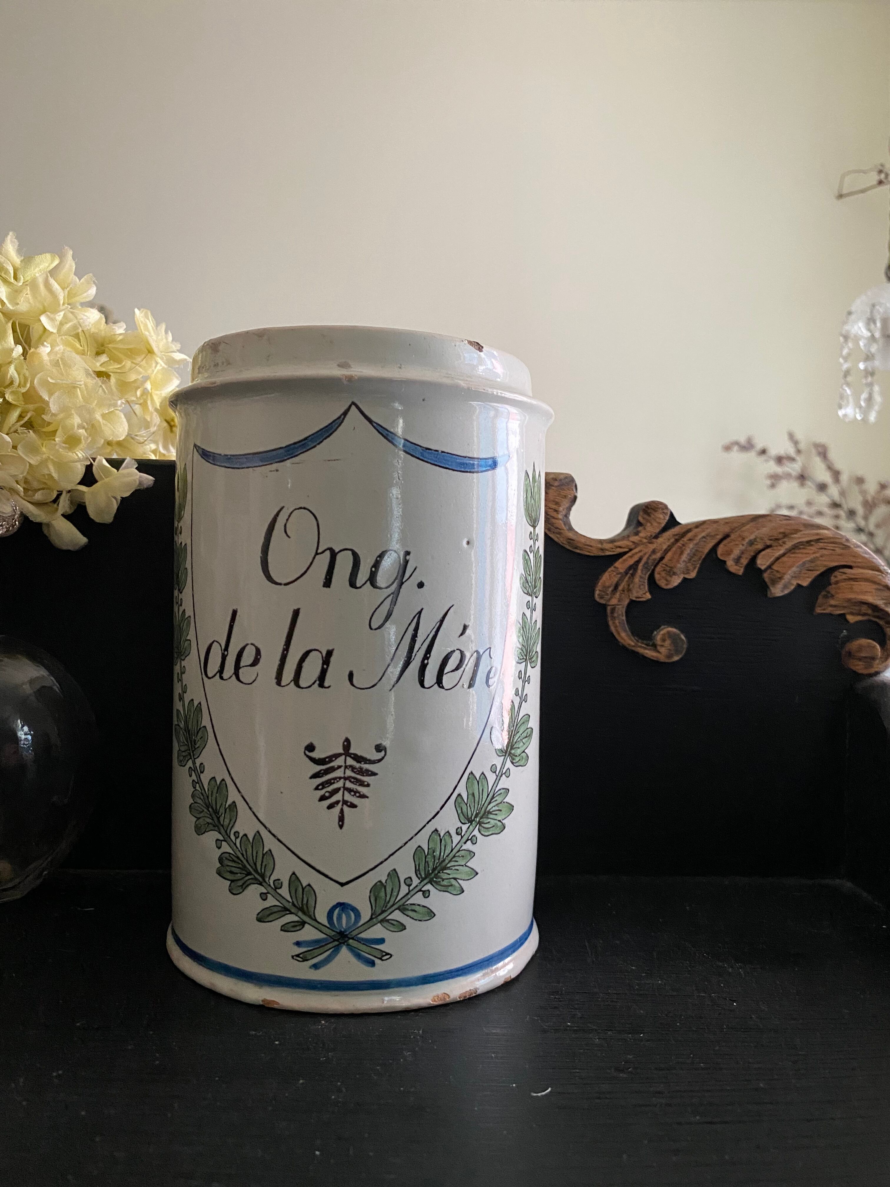 ムスティエを思わせるぽってりとした白釉に、手描きの文字とリーフガーランドがとても素適なファーマシーポット。薬草用 蓋なし。
