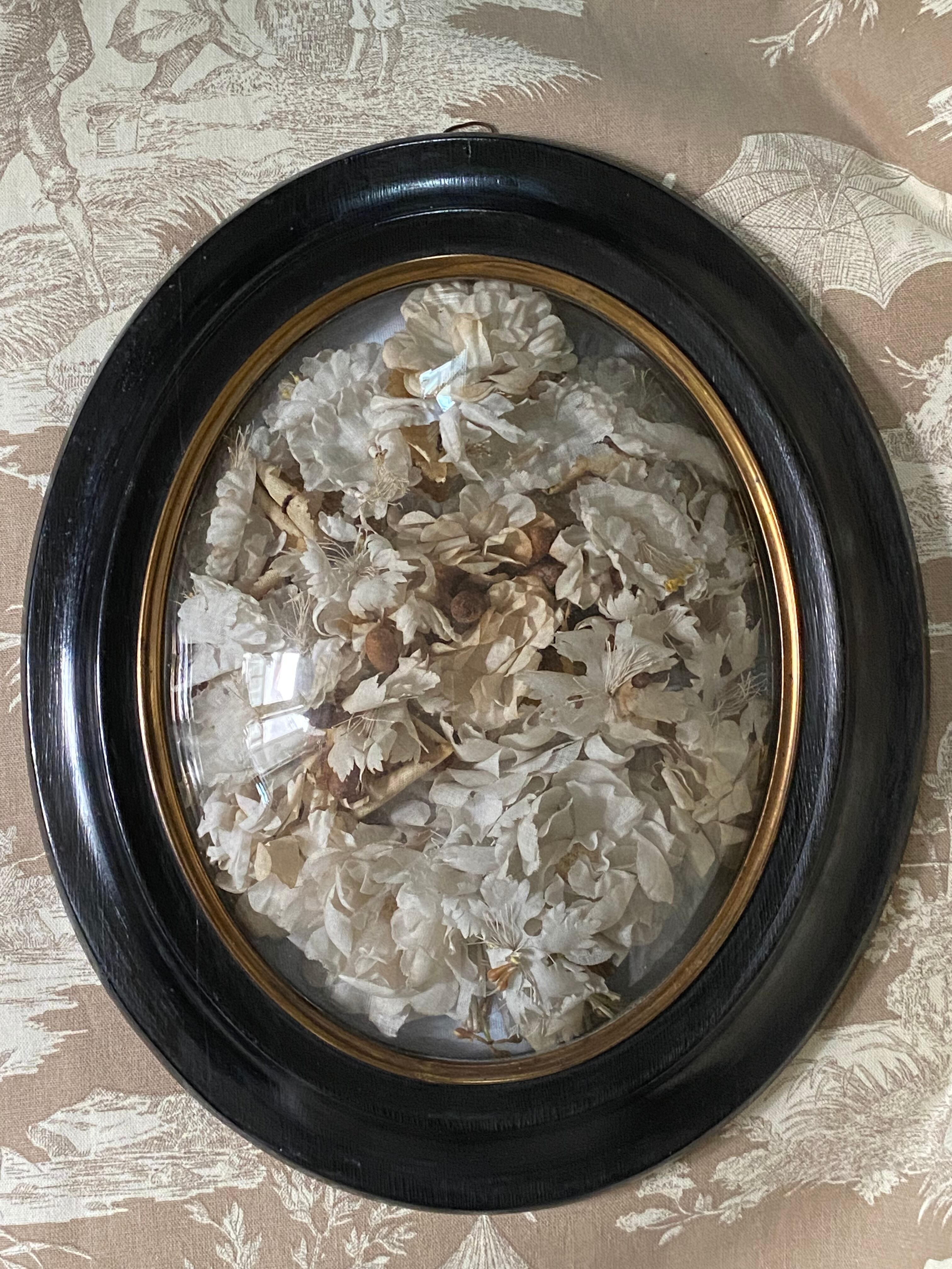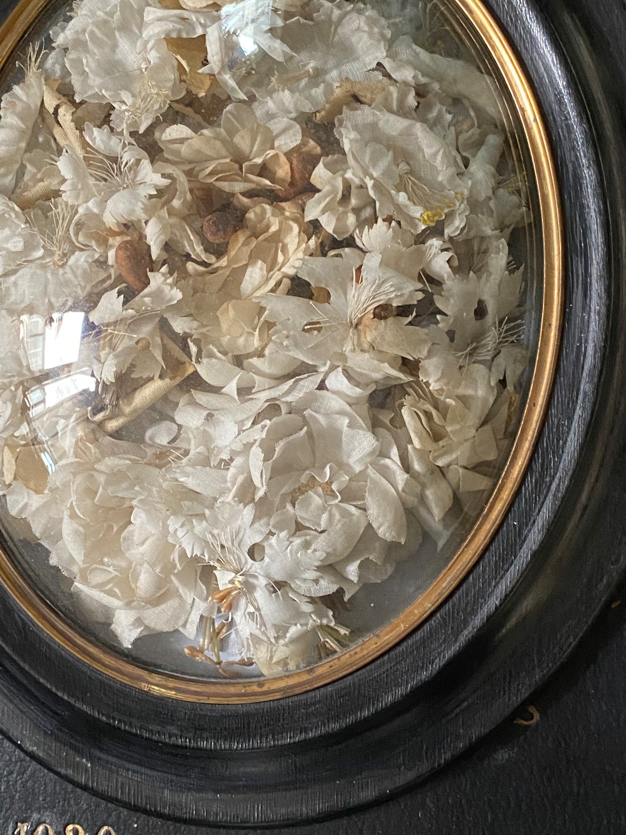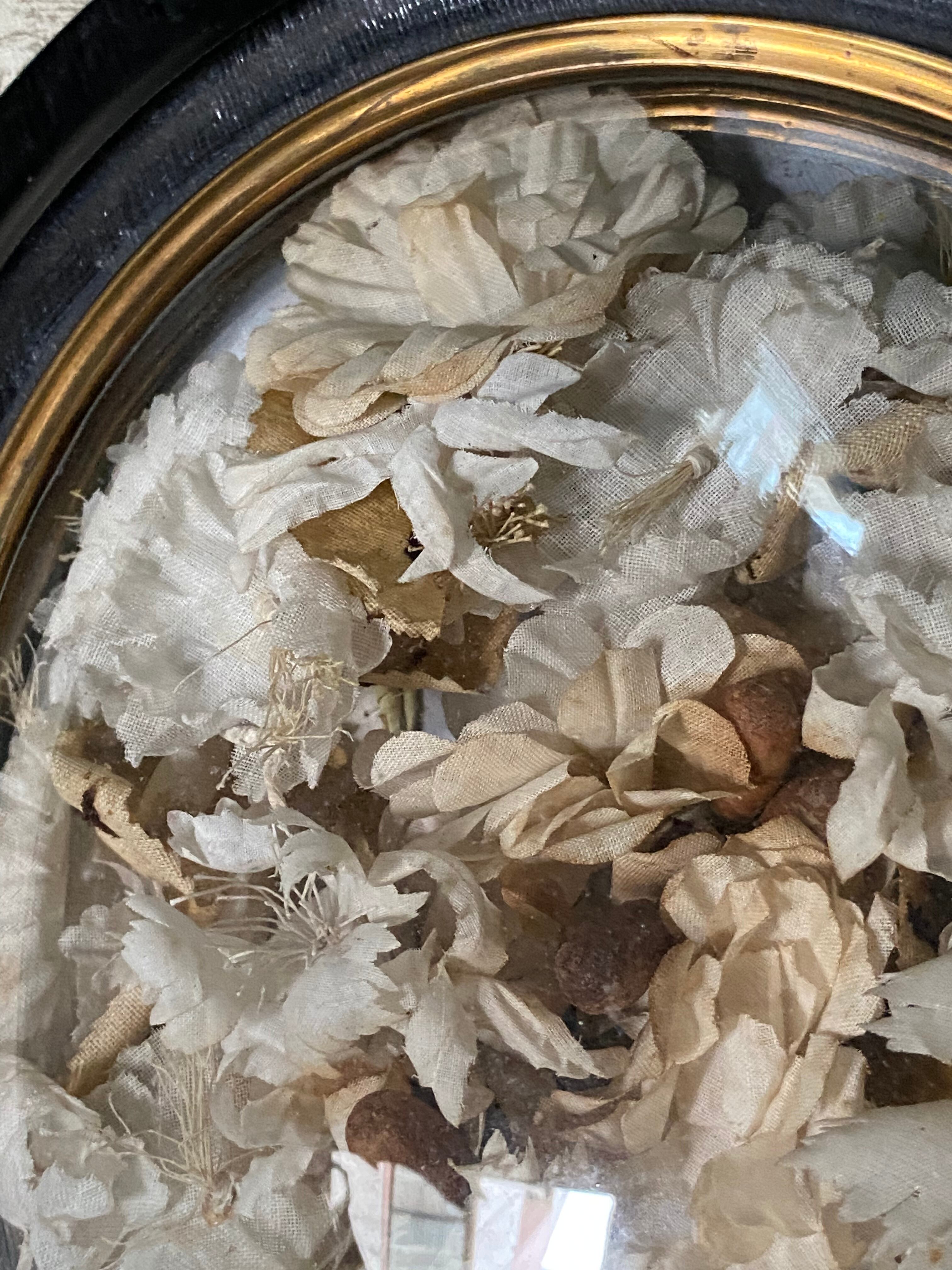 膨らんだドームガラスが貴重な、ホワイト系布花ワックスフラワー入り額装品。