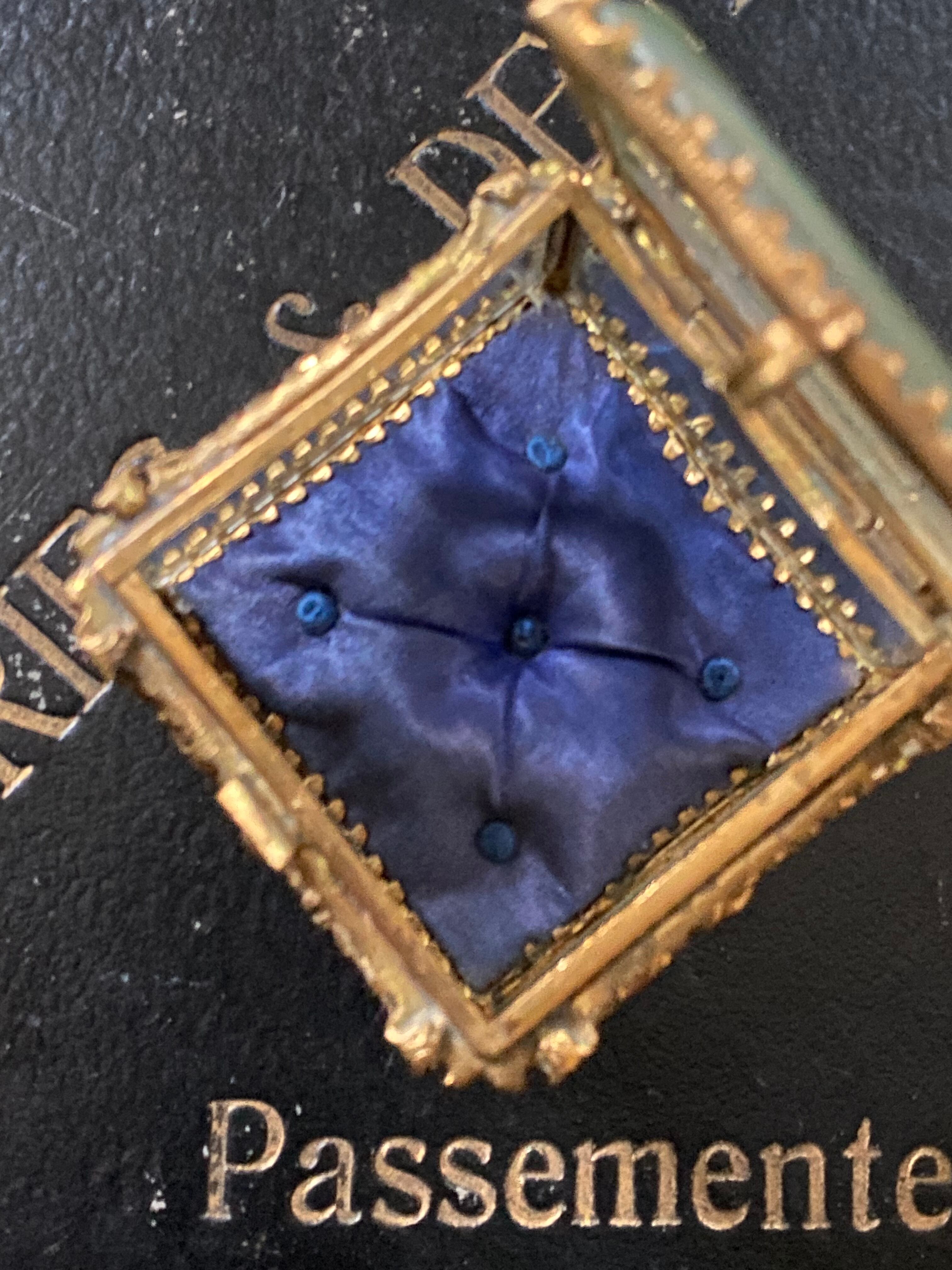シルクのブルークッションのジュエリーケースは、ローズガーランドの装飾パーツが4面に施されたスペシャルなタイプです。