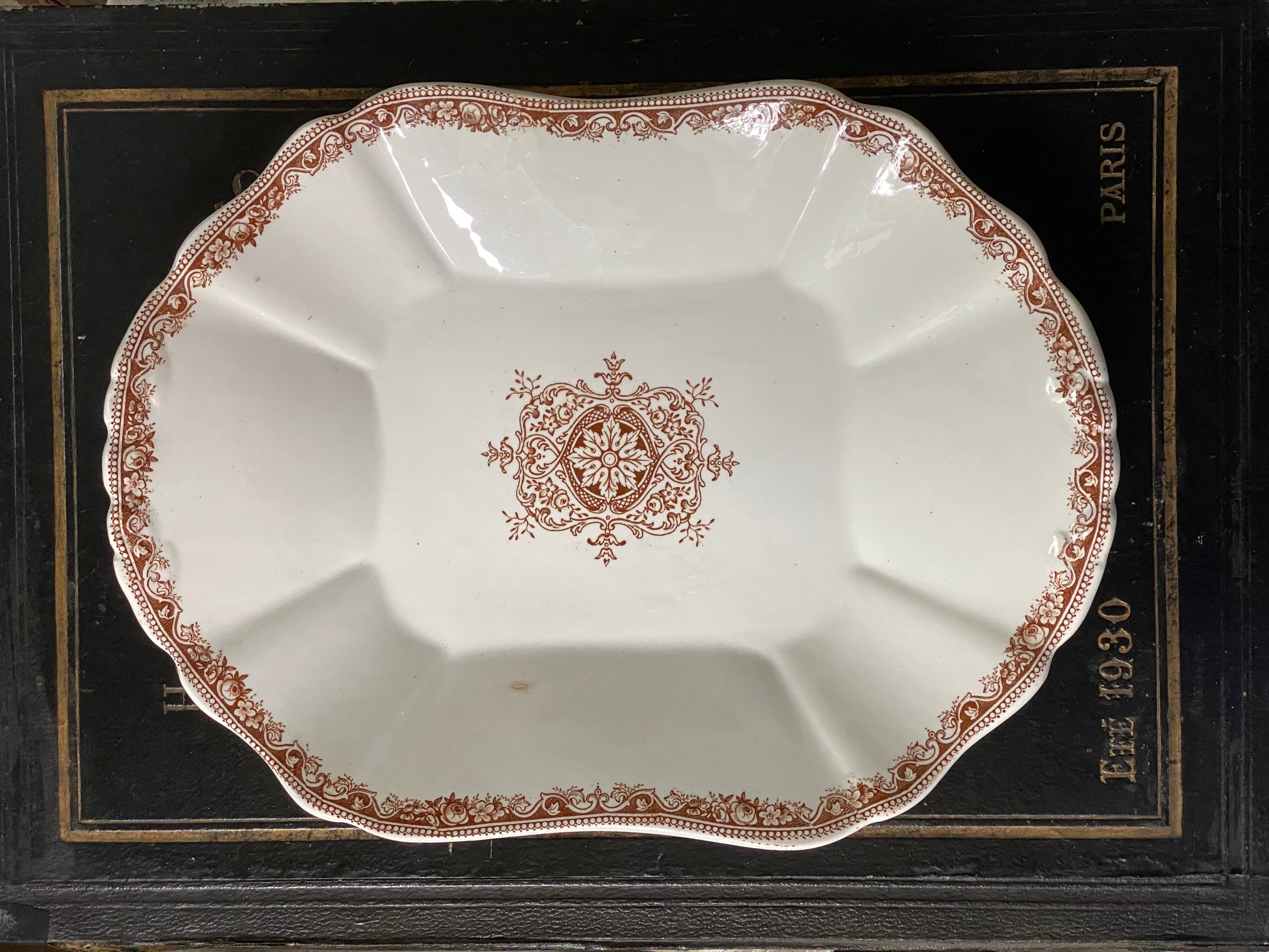 変型オクトゴナルの花リムとでも言いましょうか、少し深さもある大皿。ブラウンのボタニカルモチーフに両端にはレリーフも見られる大変美しいプレートです。