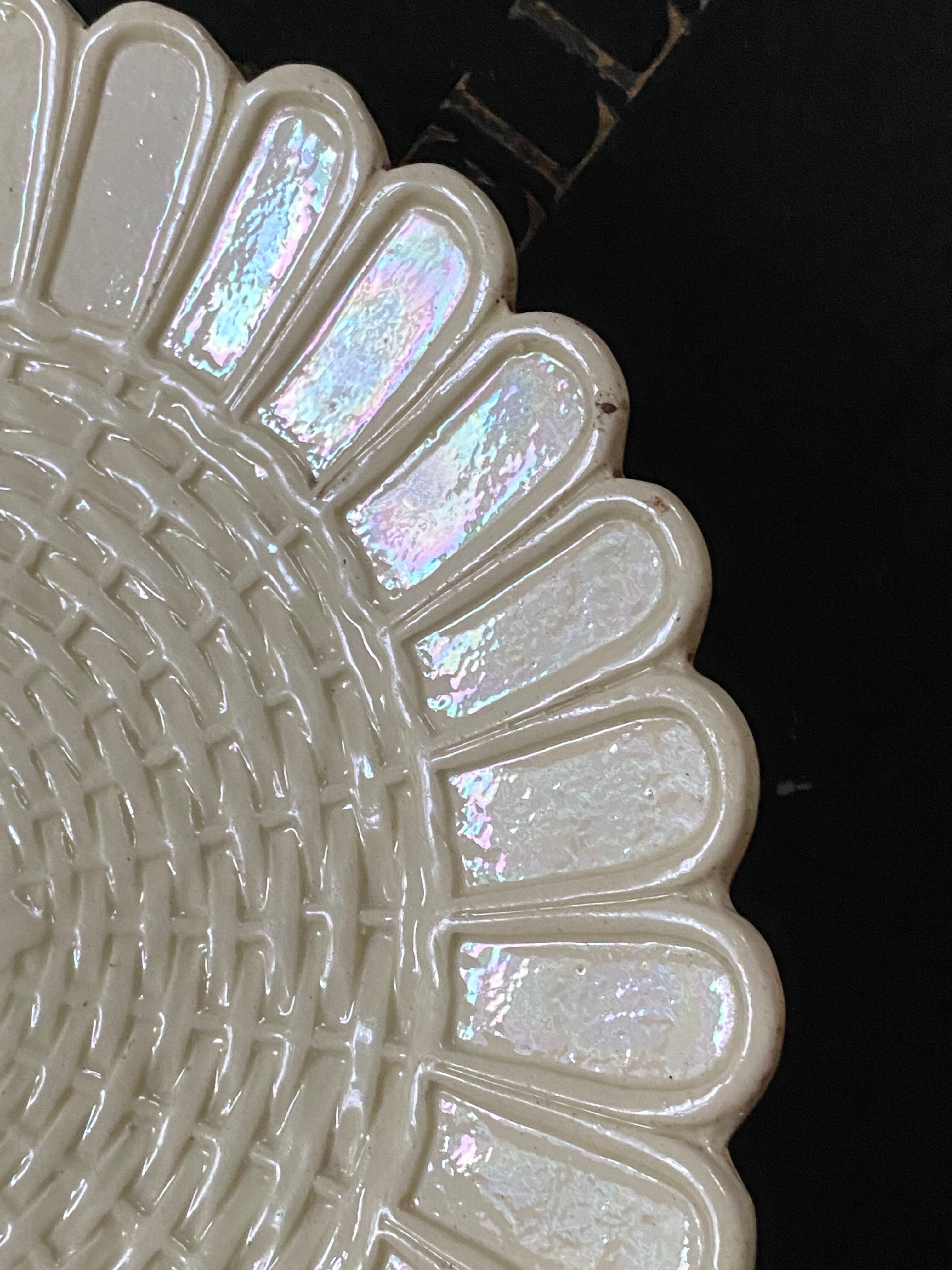 中央の星花のレリーフが特徴的で、花びらのようなリムは七色に輝く鱗のようにも見えます。