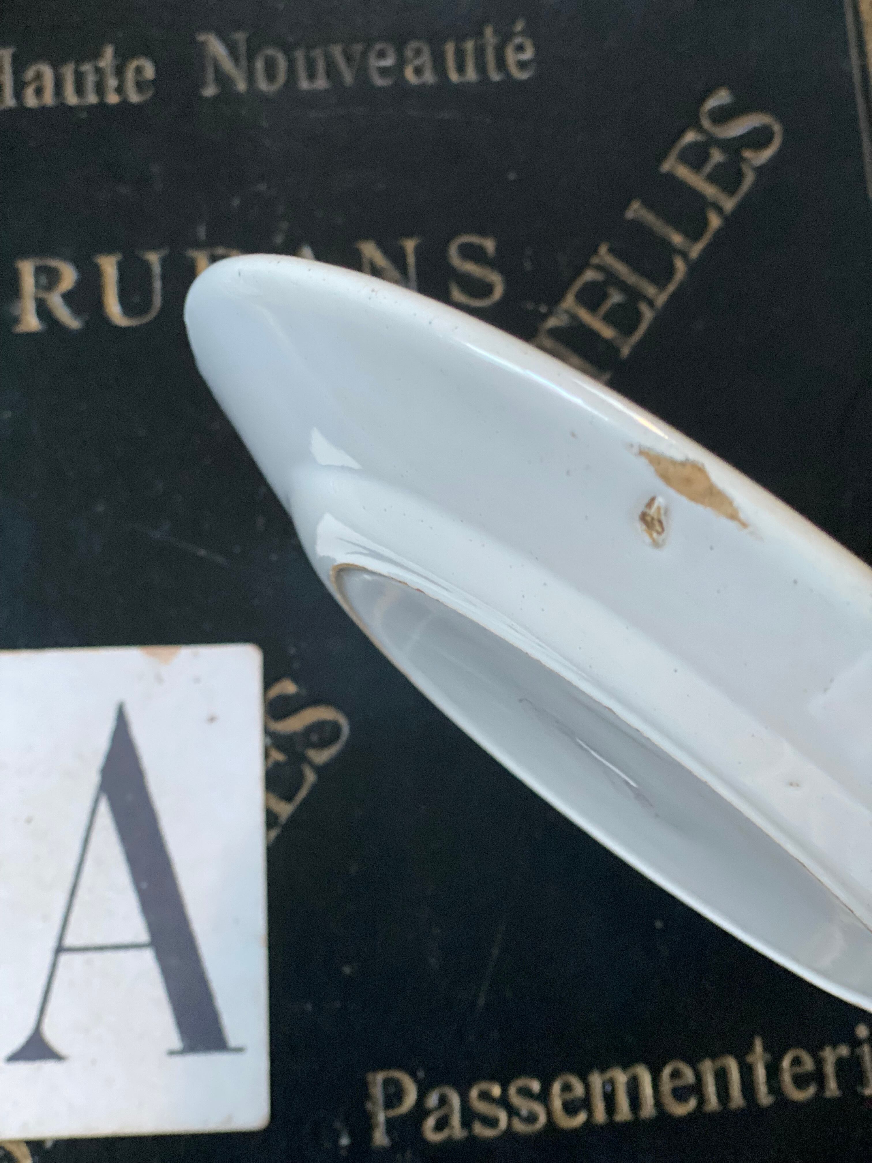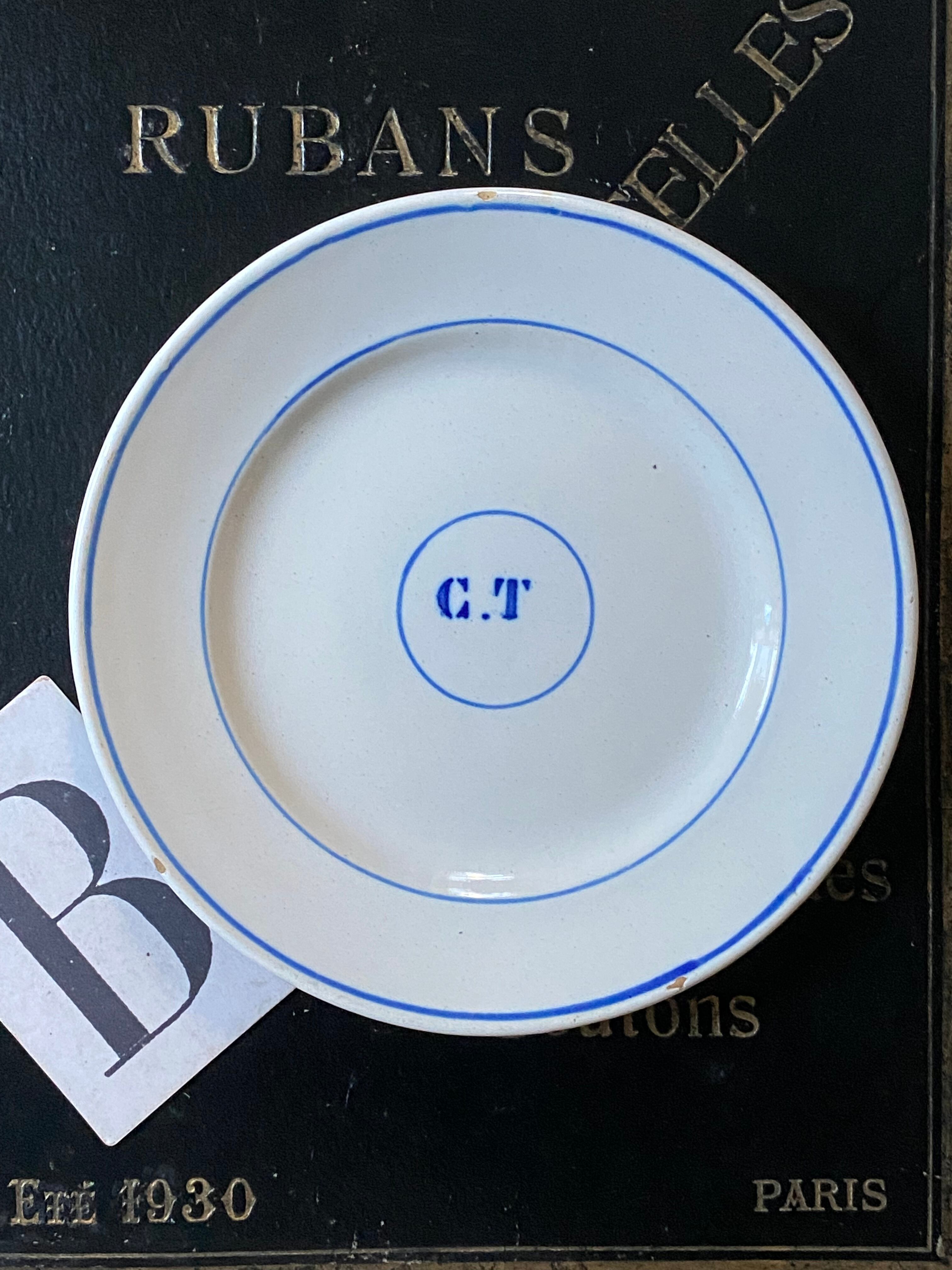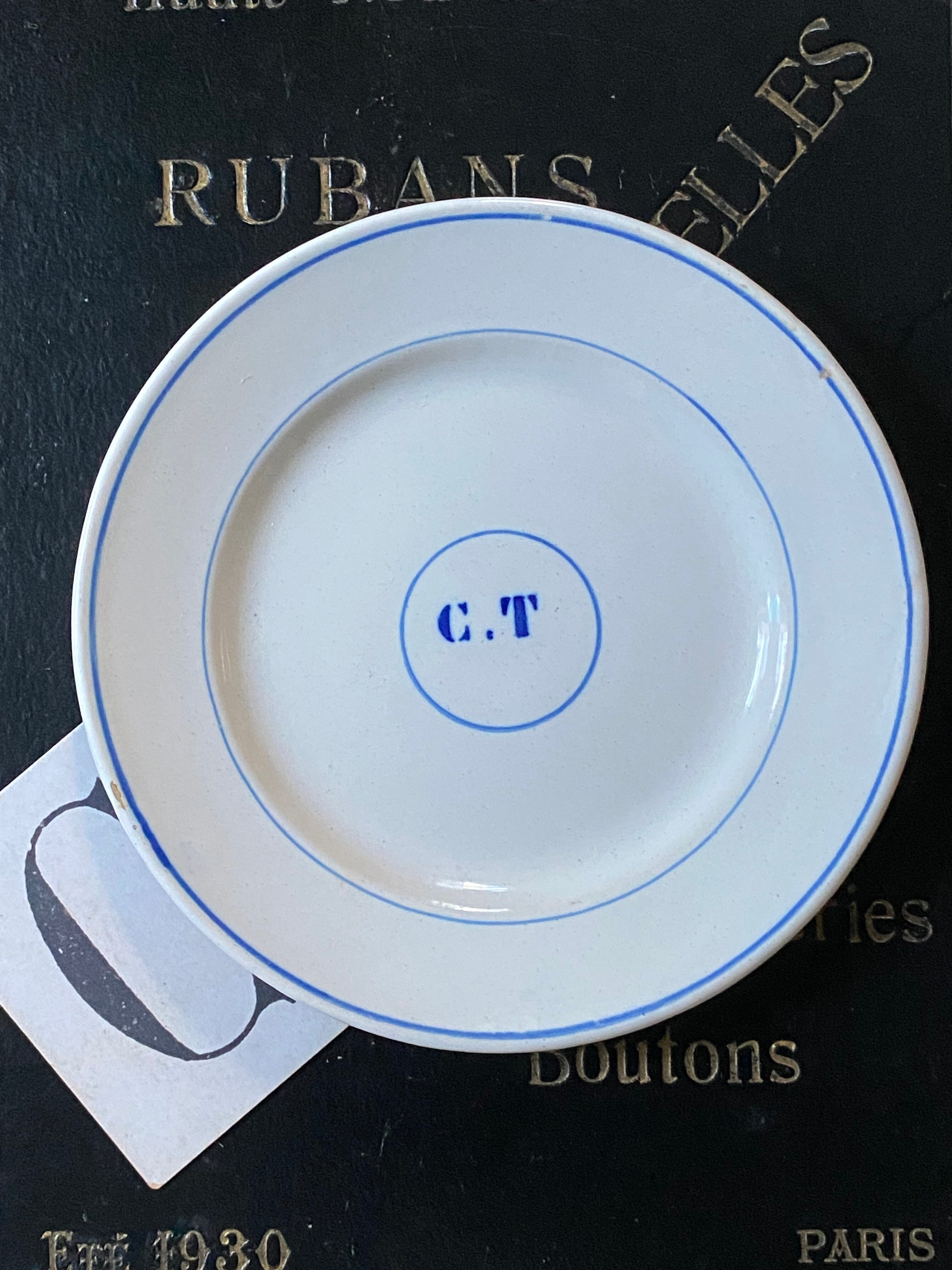 一見シンプルなビストロ皿ですが、フレンチブルーのお色味といい、ラインとイニシャルはプリントではなく手彩色で、ひとつひとつ異なる手仕事のあたたかみを感じます。
