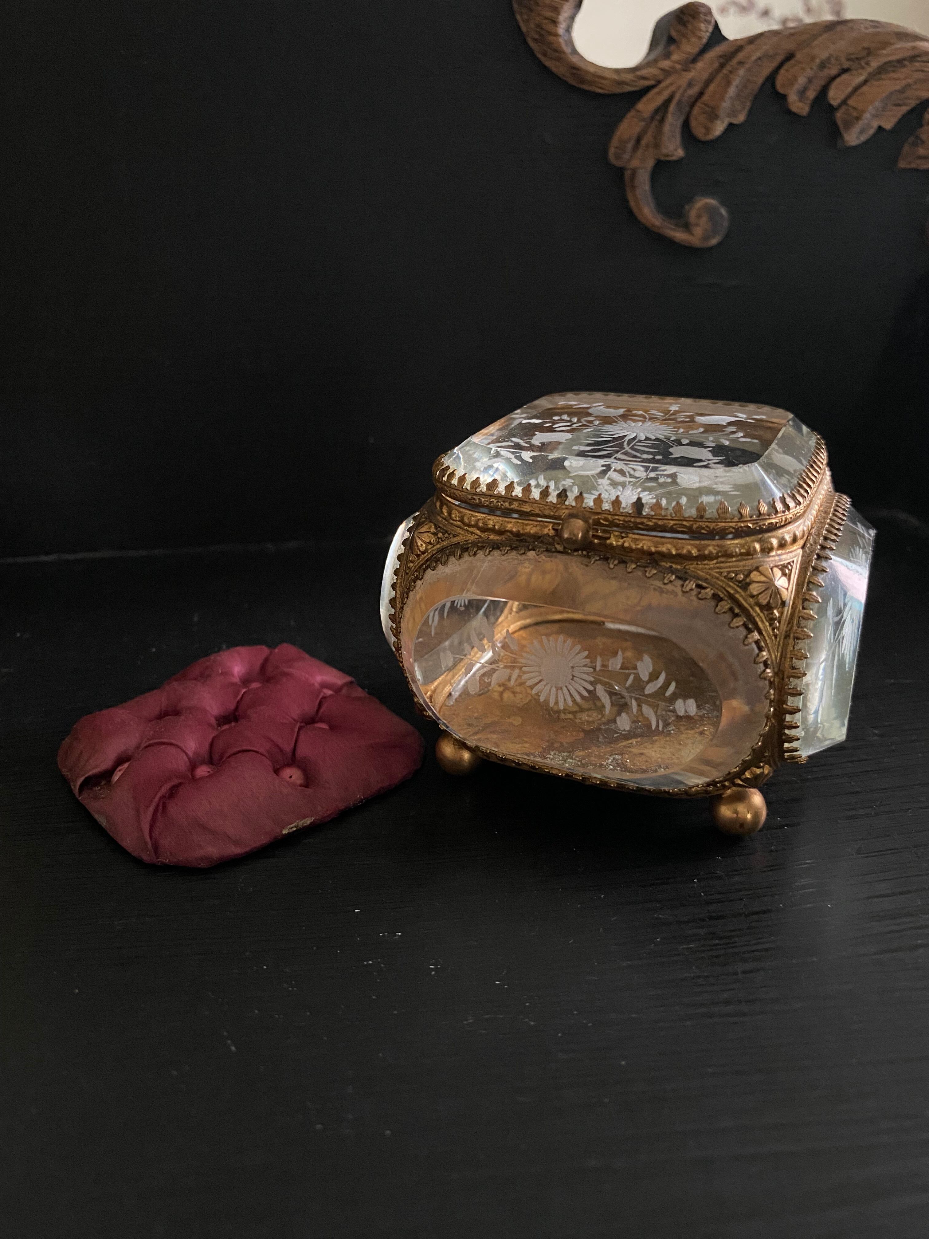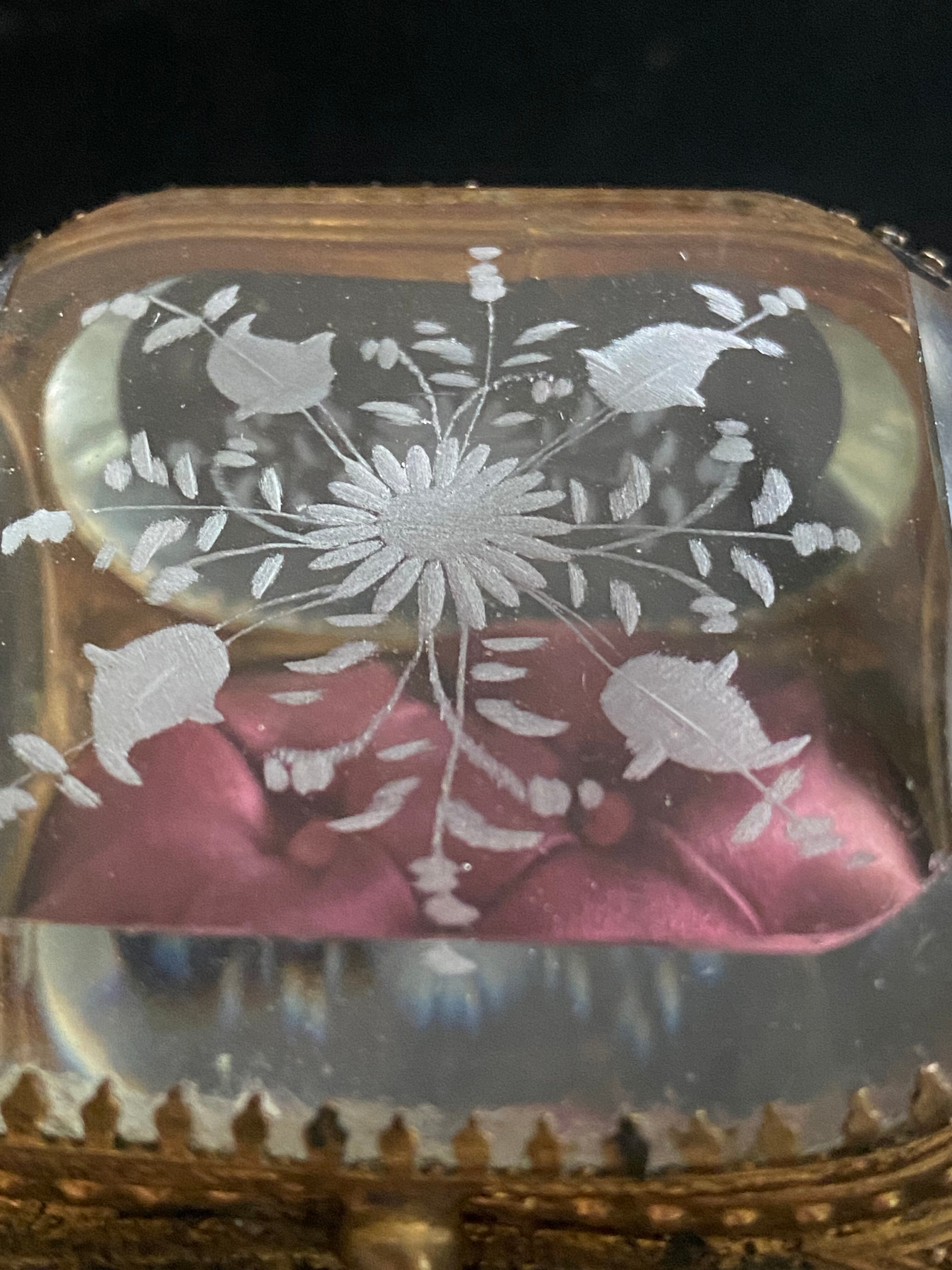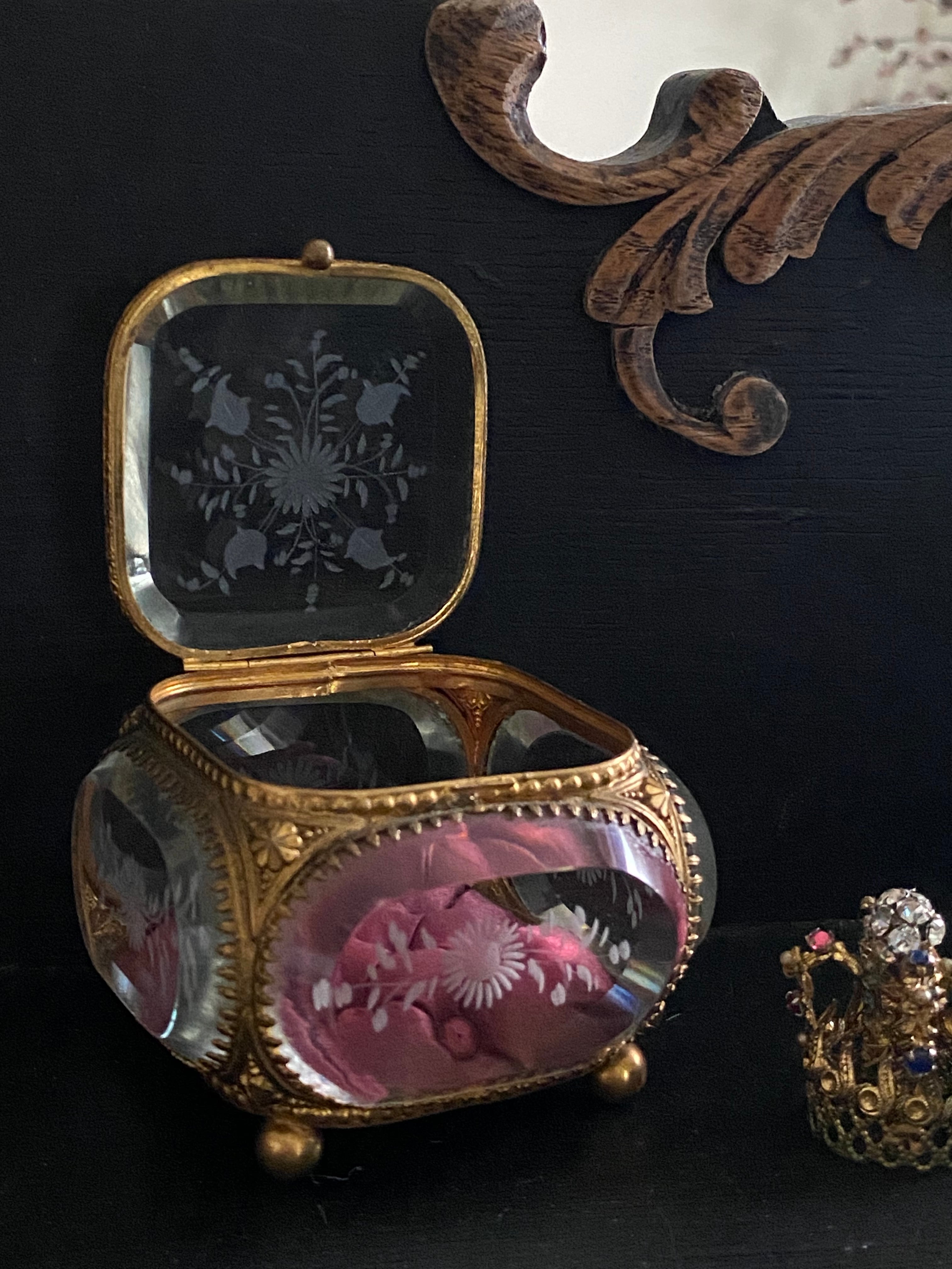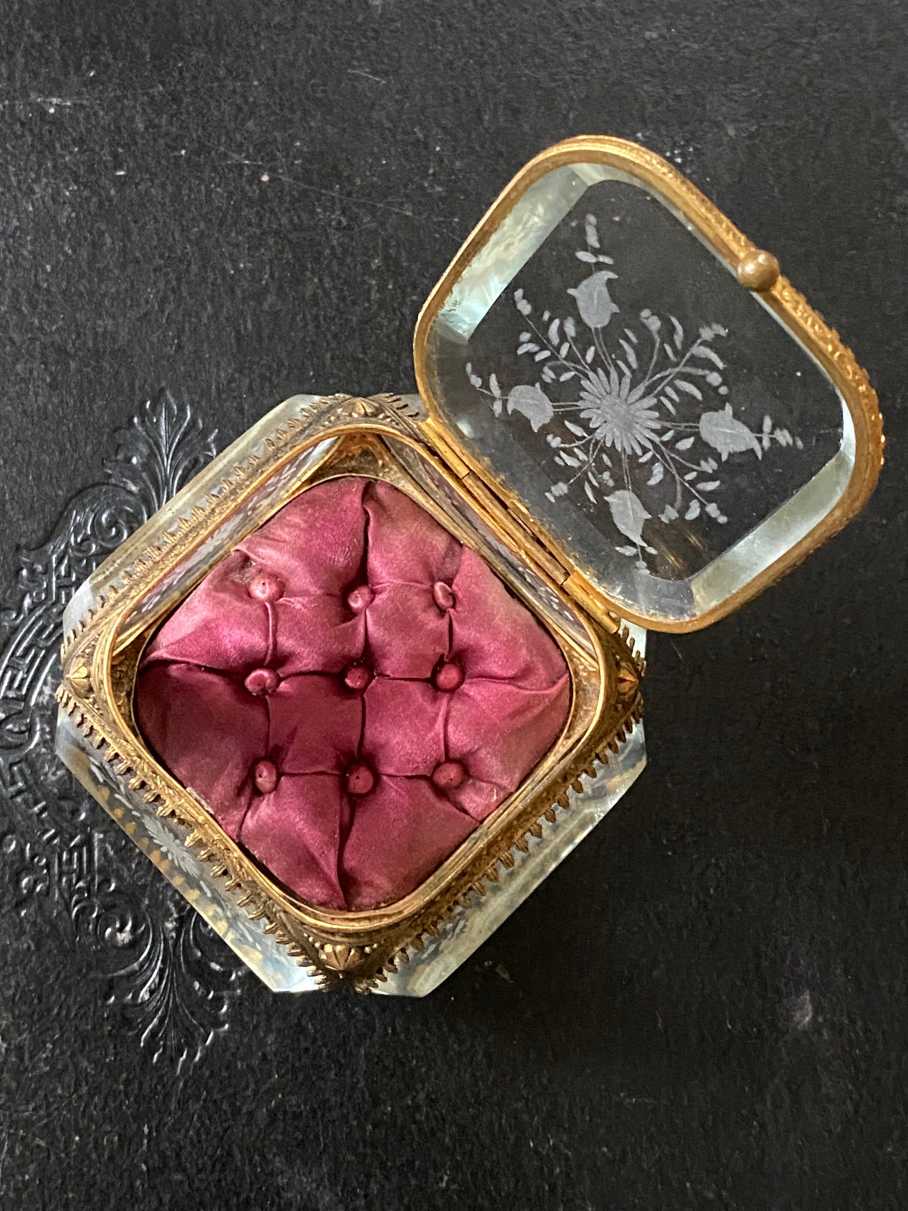 厚いガラスに入ったフラワーのグラヴィールカット、ローズカラーのシルククッションが美しいとびきりのジュエリーケース。