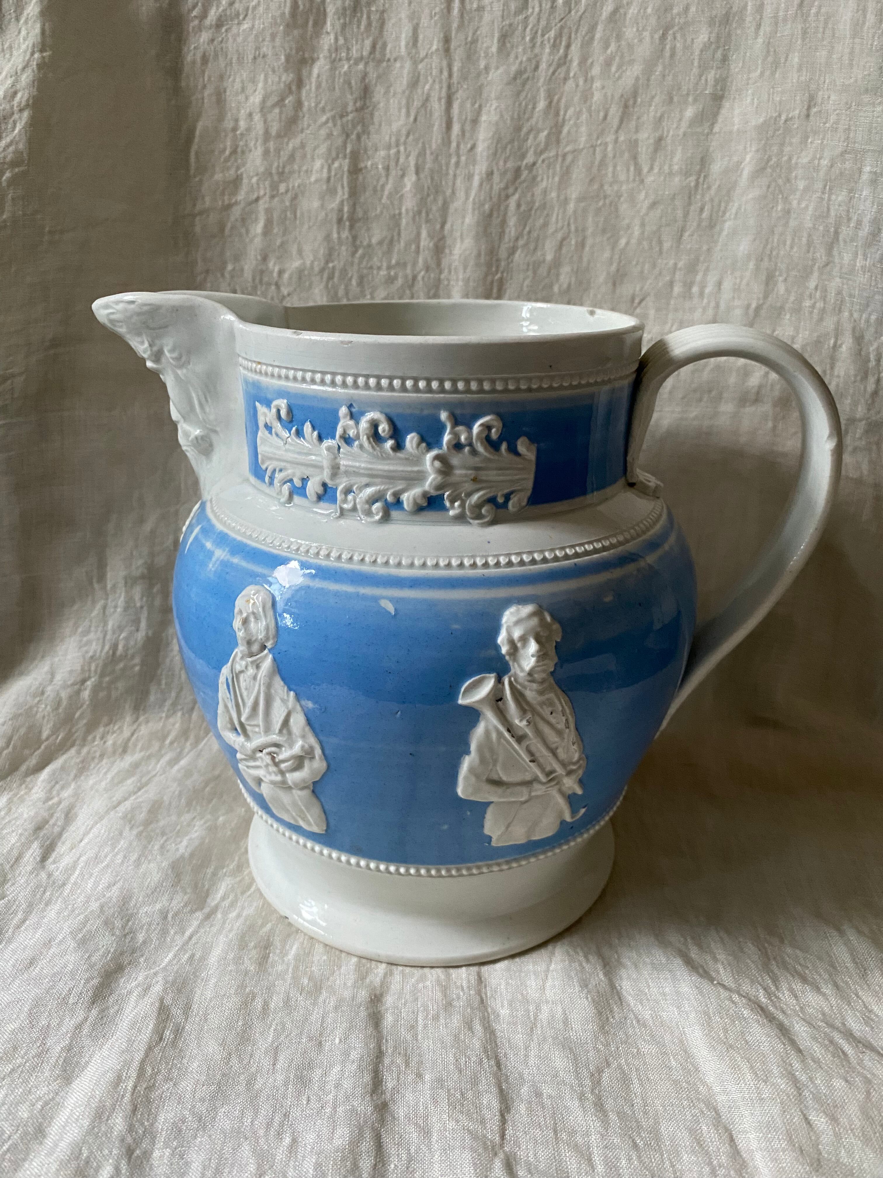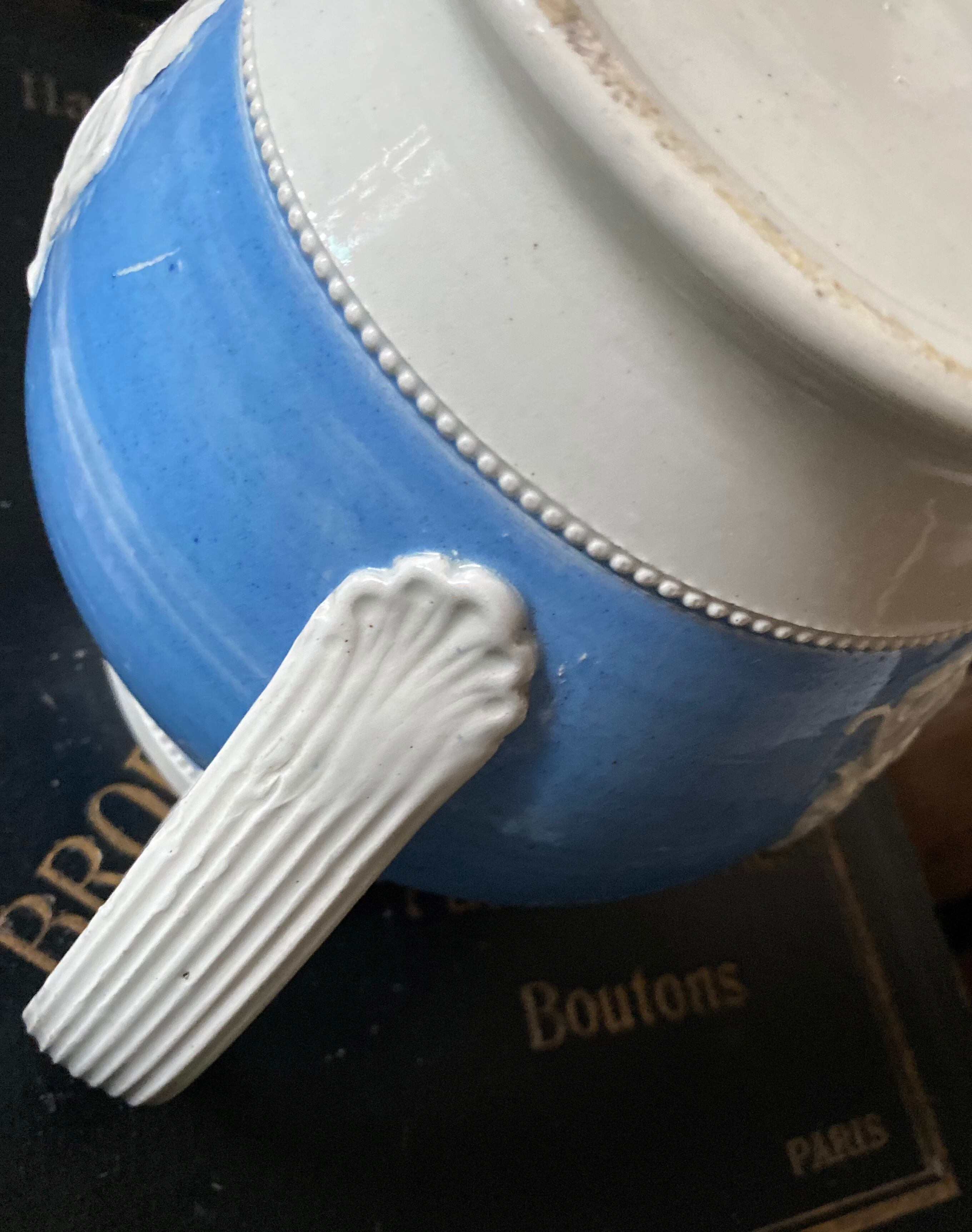 バックスタンプがなく窯は不明ですが、水色地×白いレリーフのウェッジウッドを思わせる意匠でイギリスのものではとのことでしたが、陶器の質感や釉薬の感じはフランスのお品のようにも思えます。