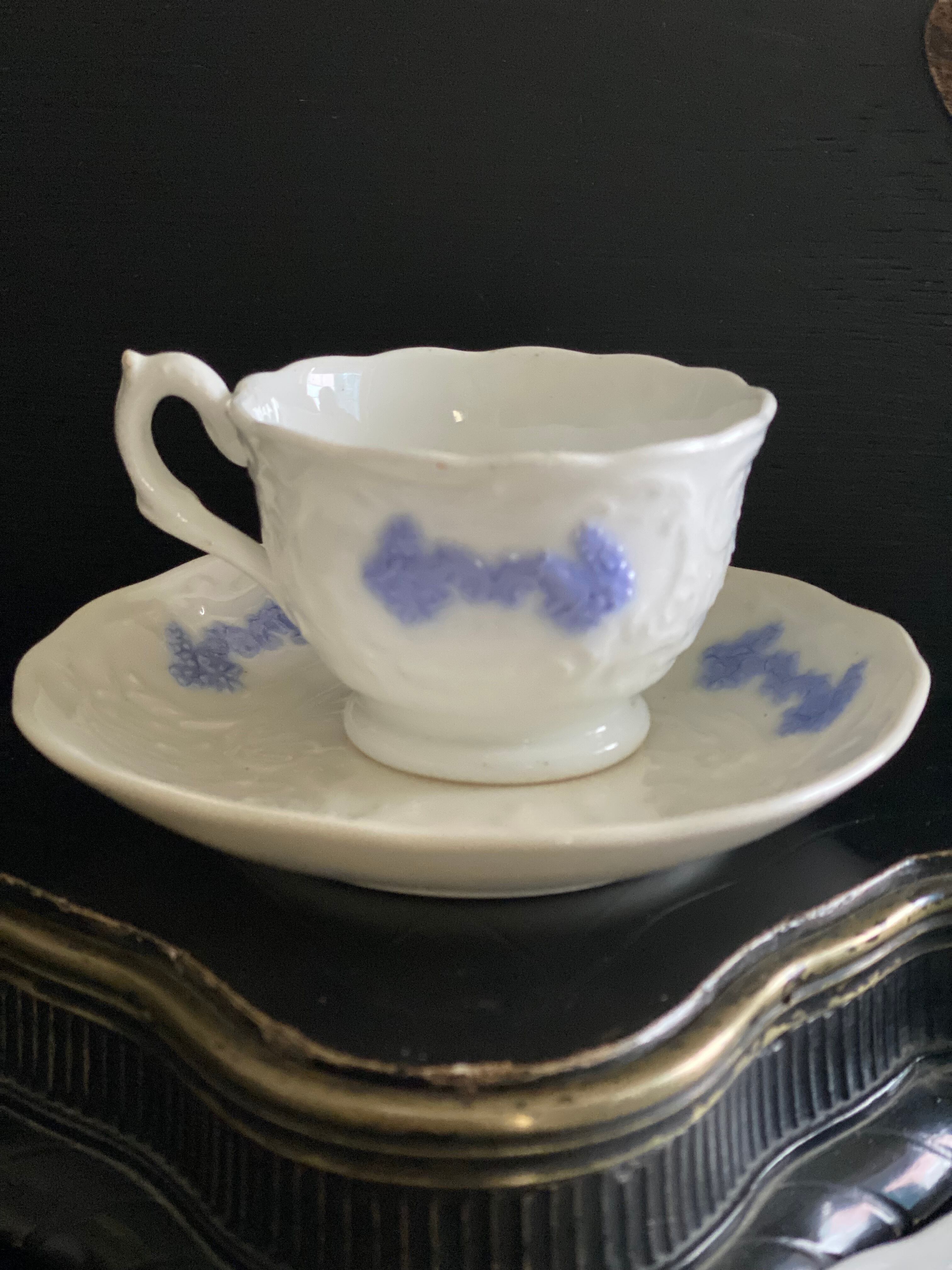 透き通るような美しい白磁のレリーフにパープルブルーのレリーフが施されています。カップもソーサー も花リム。