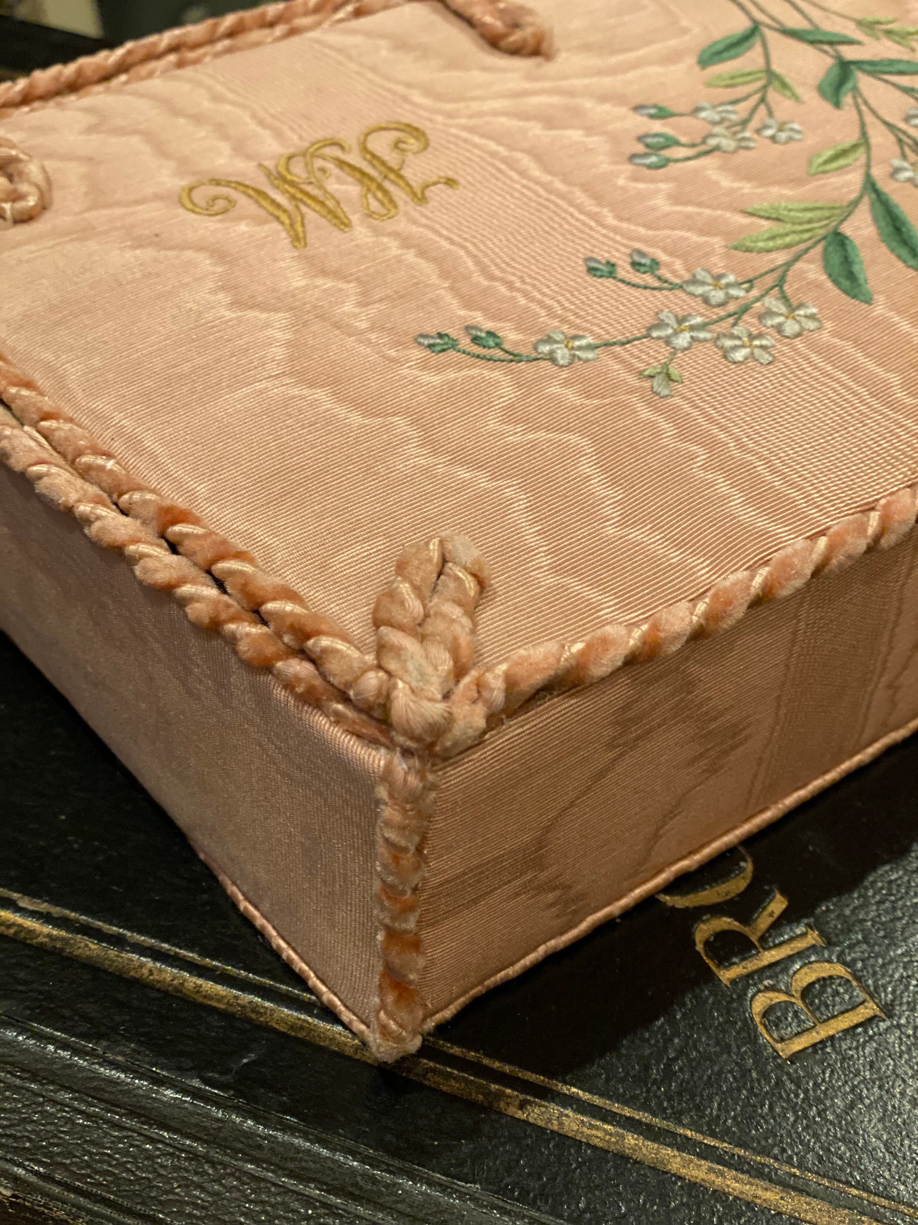 縁のブレードや蓋裏のシルク生地の経年の傷み、箱の歪みはあるものの、その他生地や刺繡のシミ汚れもほとんど感じられない大変美しいコンディションです。