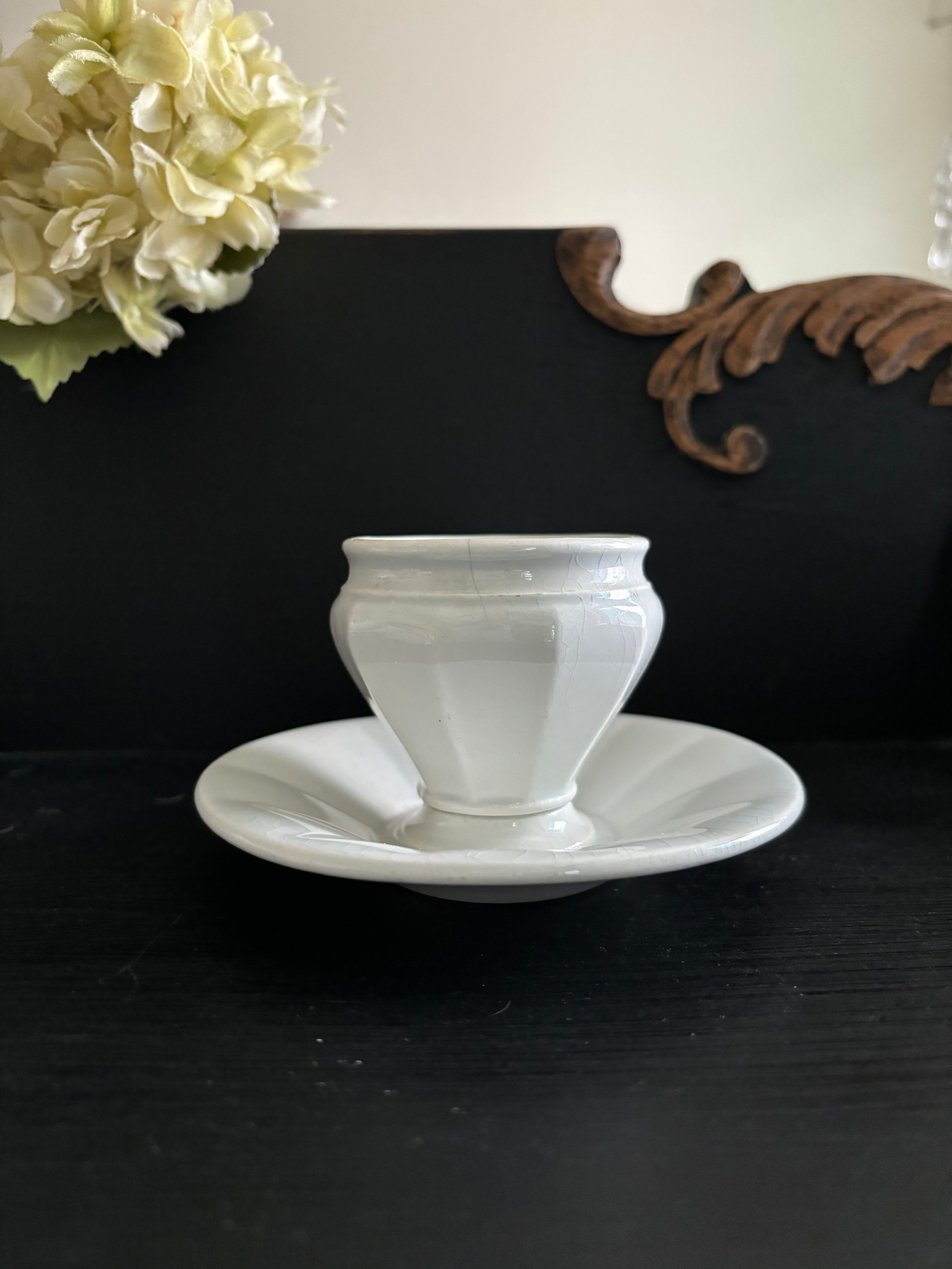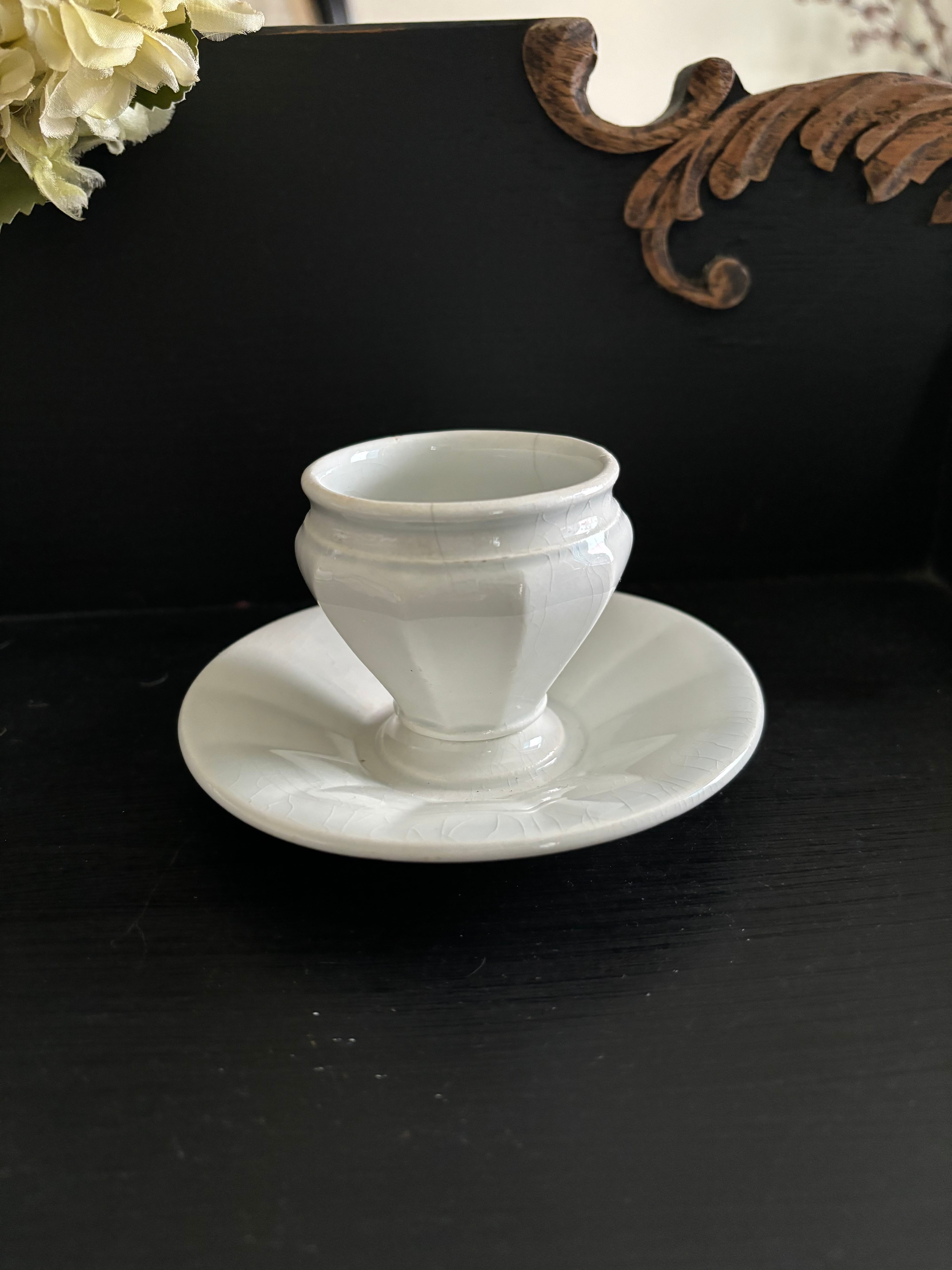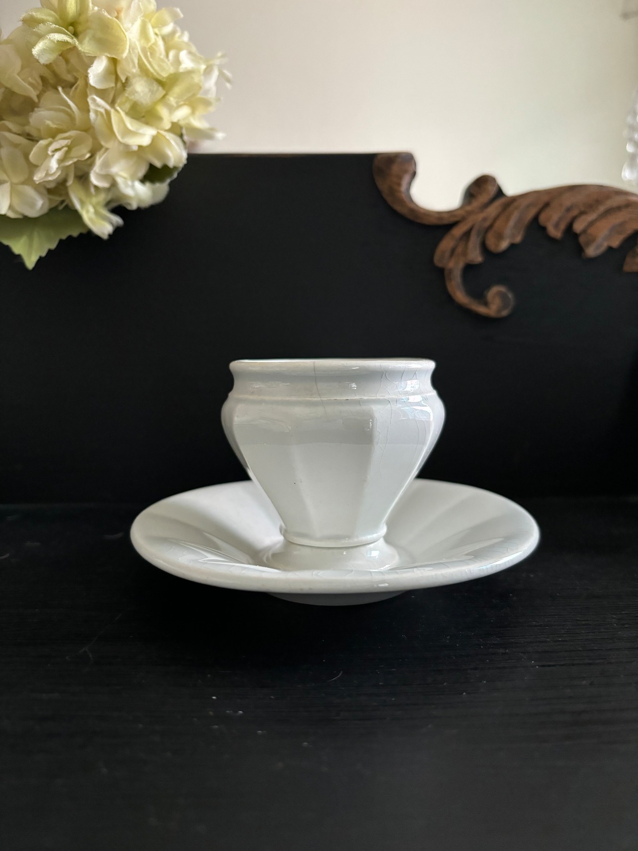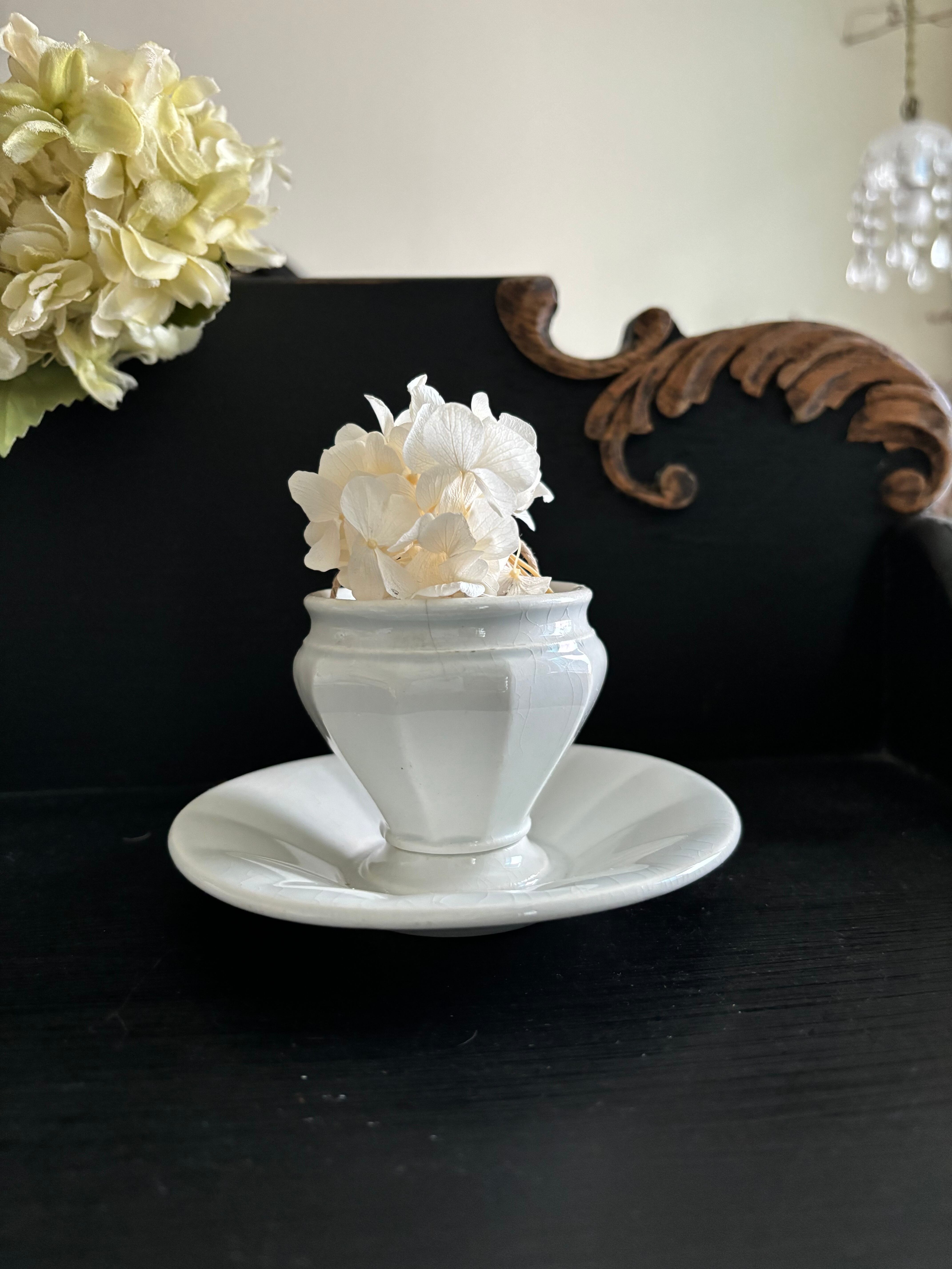 花のようなソーサーの意匠や蒼白い釉だまりが美しいボルドーのマスタードポットです。
