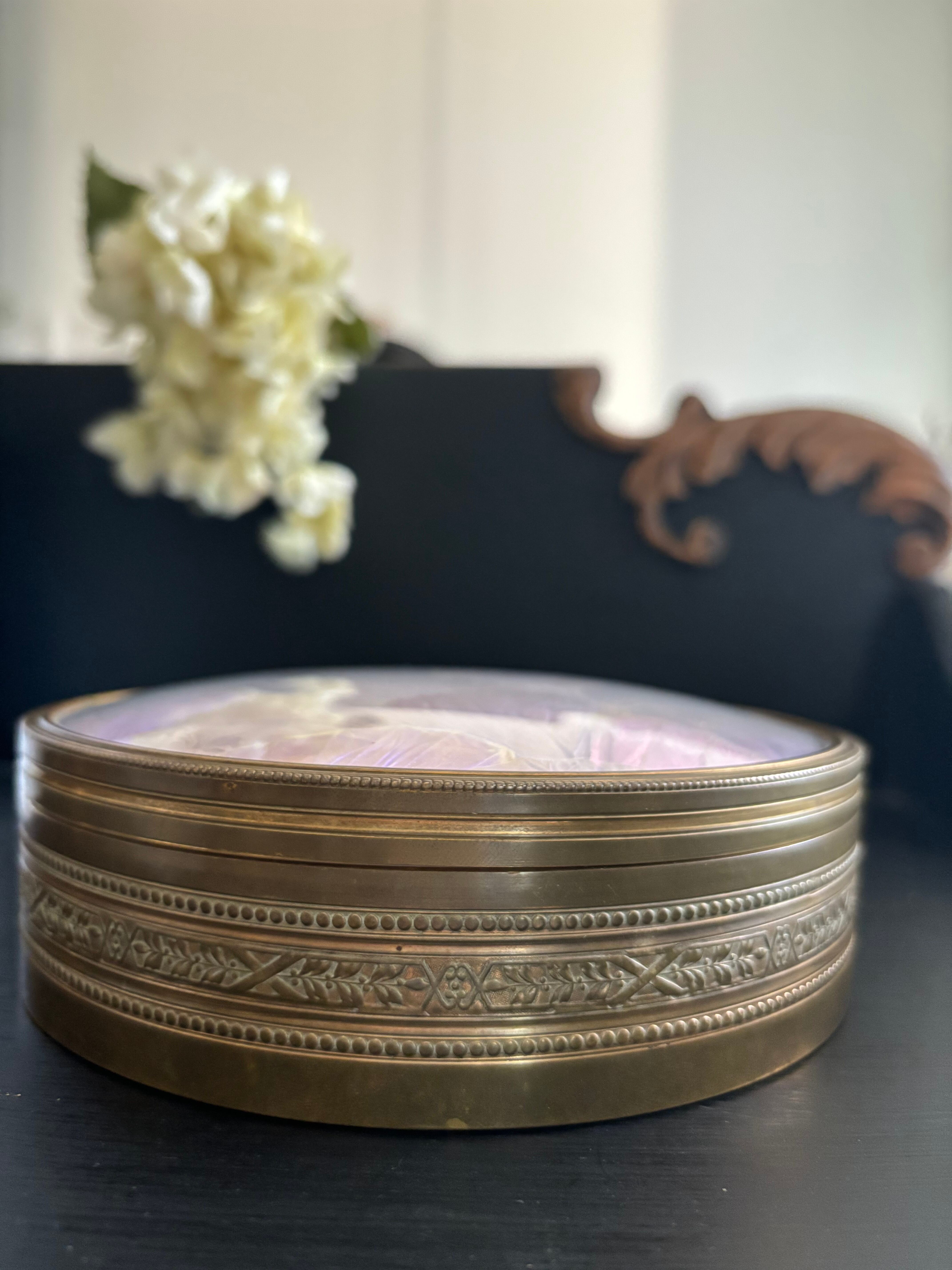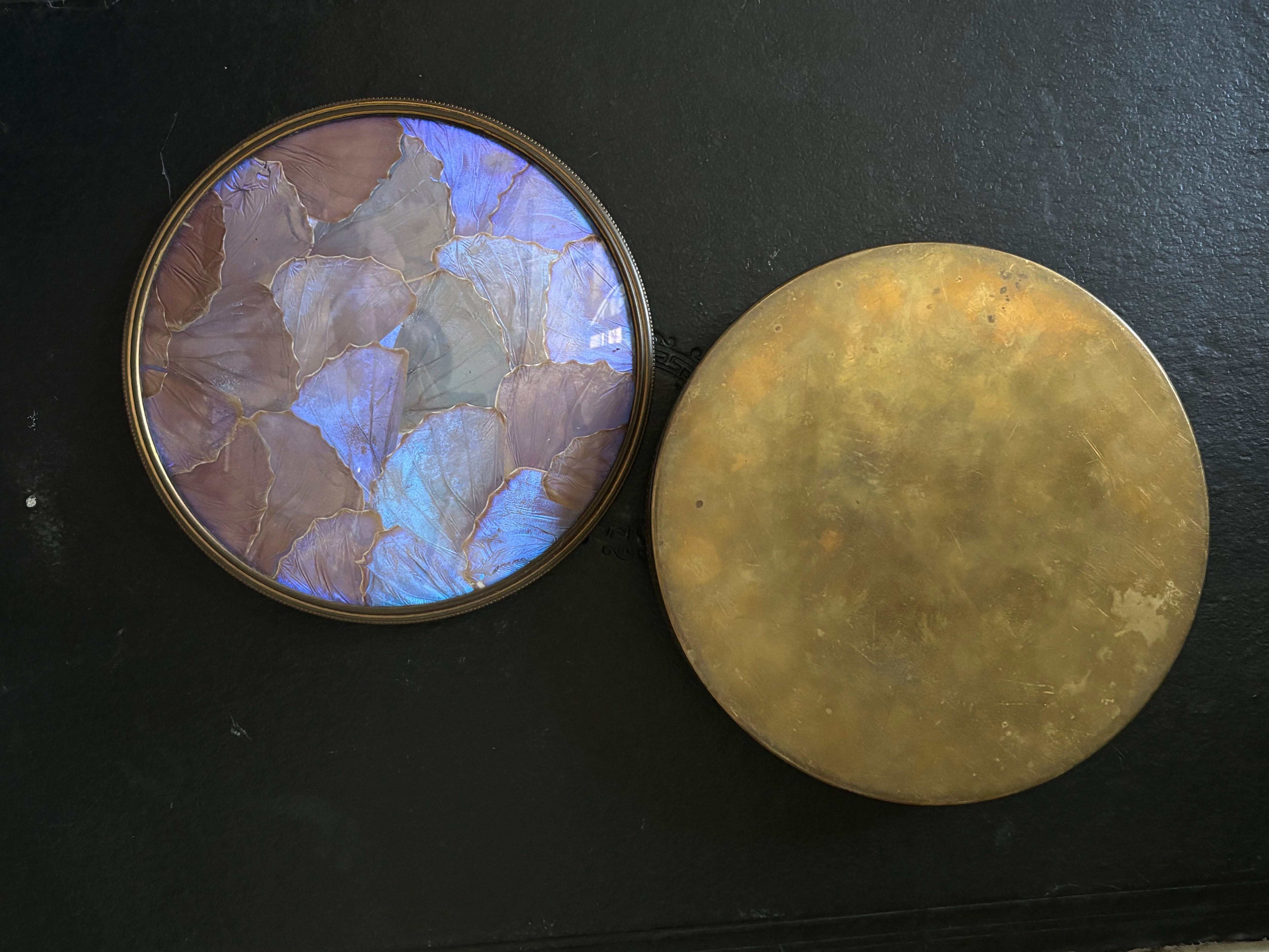 妖しくも美しく輝くモルフォ蝶の羽をドームガラスの蓋に閉じ込めた真鍮ケース。
