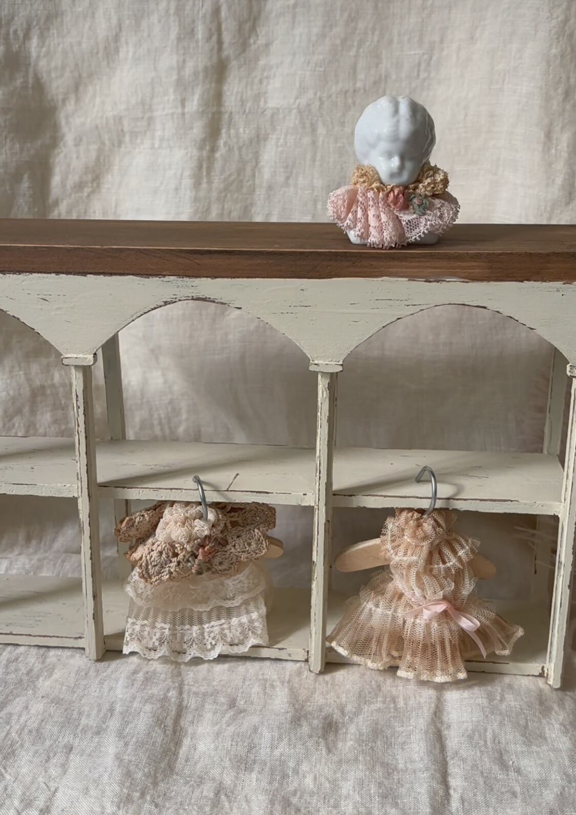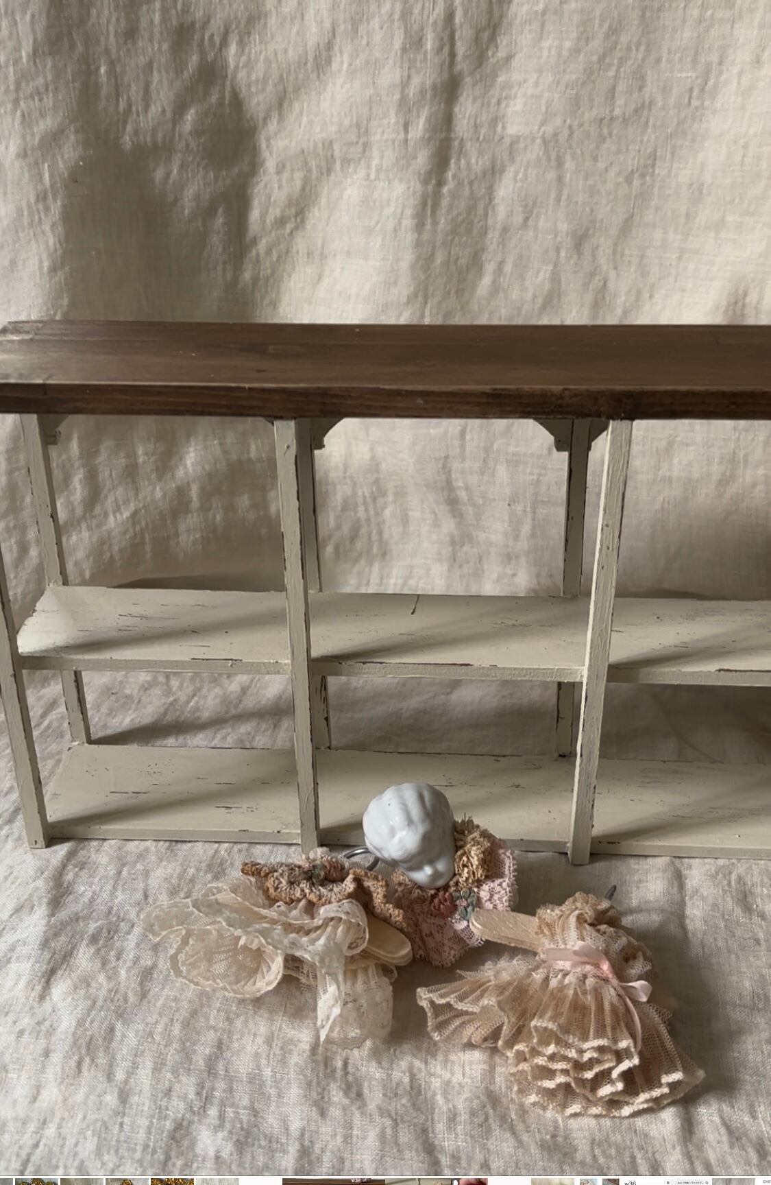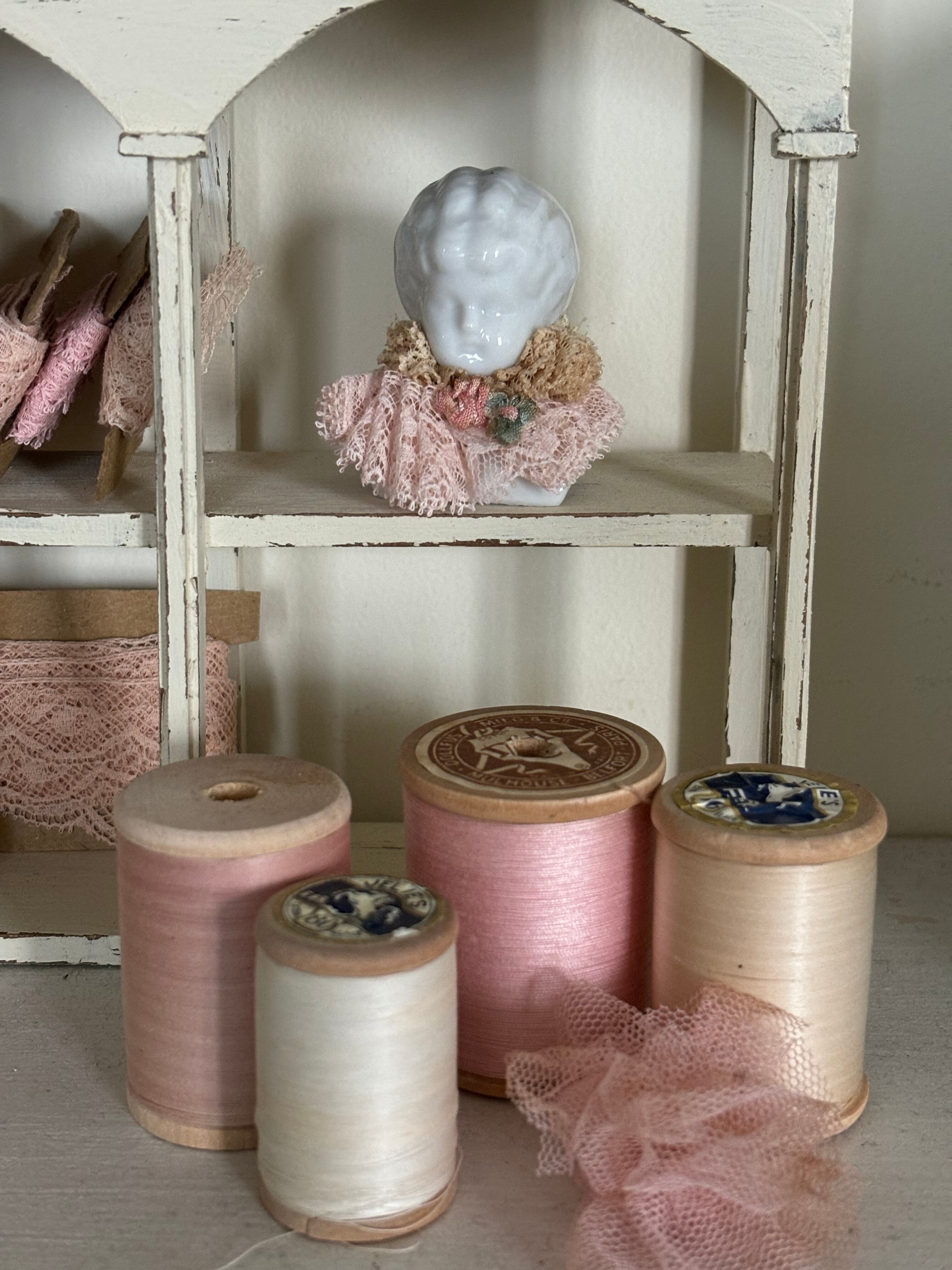 アンティーク,ヴィンテージのレースや糸巻きなどメルスリー …画像のもの全て30数点を、作家さまハンドメイドのアンティーク加工されたシェルフにセットして、ドールさんのレース屋さんにしつらえました。