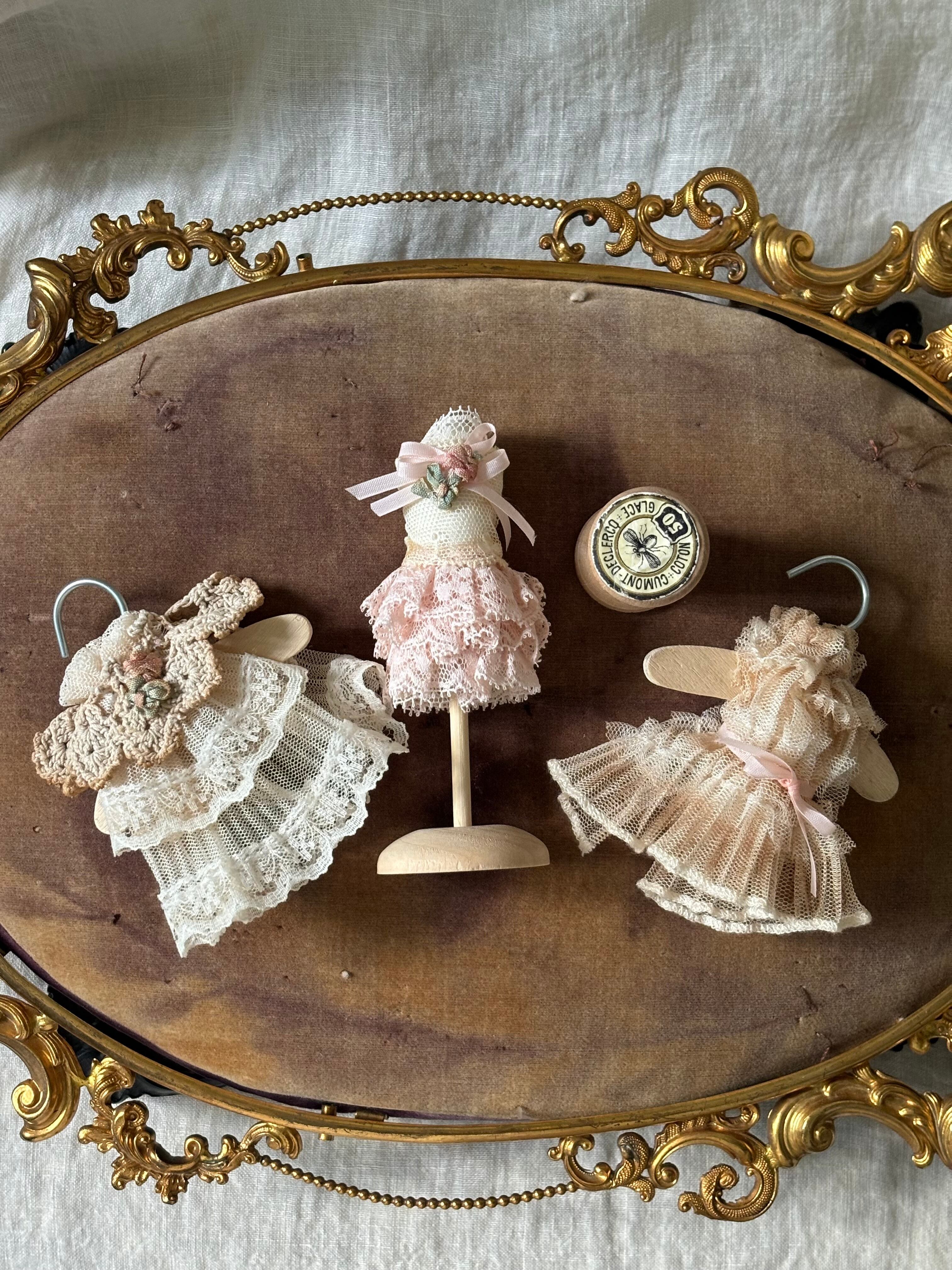 レースでおめかししたフローズンシャーロット やハンガーにかかったドールドレスなど、レースものはフランスの作家さんのお仕立てです。